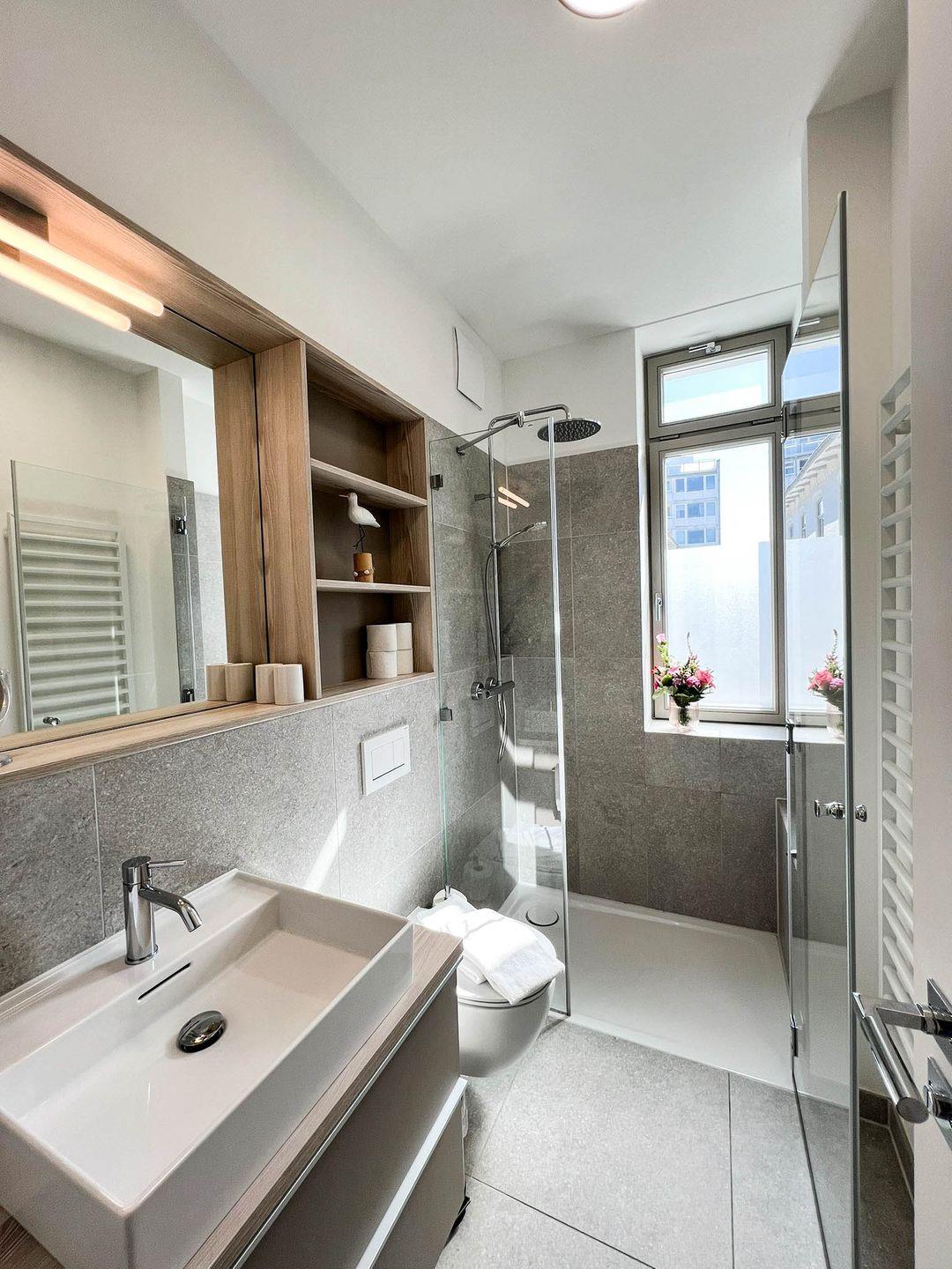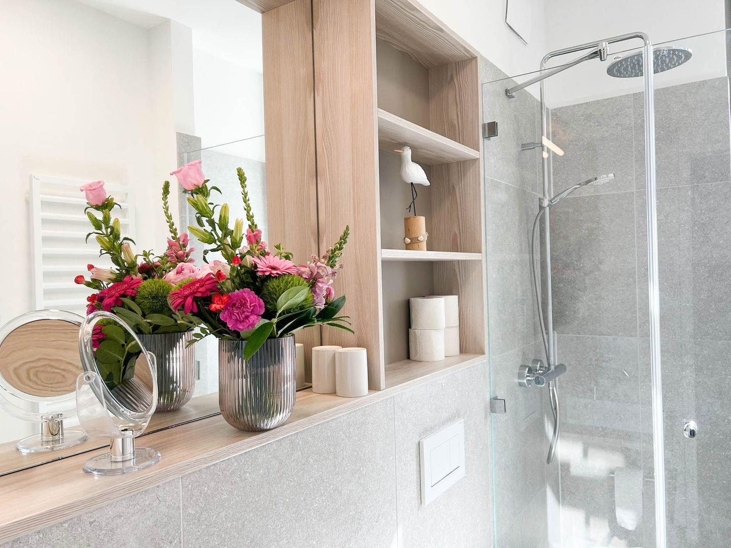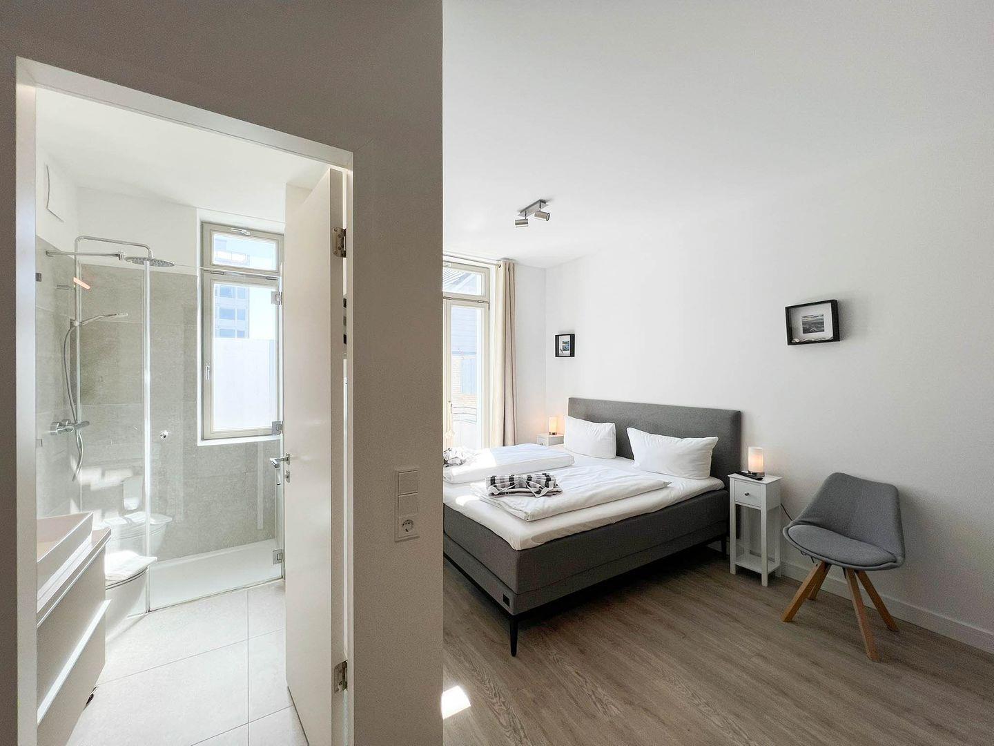 Sozusagen Tür an Tür wohnen Sie hier übrigens unter anderem mit dem „Ankerplatz“ und der „Deck 2“, zwei ähnlich luxuriös ausgestatteten Appartements, die Sie ebenfalls in unserem Portfolio finden – perfekt also, wenn Sie mit mehreren Partien verreisen und größtmögliche Nähe bei etwas freundschaftlicher Distanz haben möchten (dafür braucht es aber natürlich ein wenig Glück, damit die Wohnungen parallel auch frei sind). Übrigens: Im Erdgeschoss, auch das mag für manche unter praktischen Gesichtspunkten ein Magnet sein, findet sich der vielleicht schickste und größte Rossmann, den es überhaupt gibt.