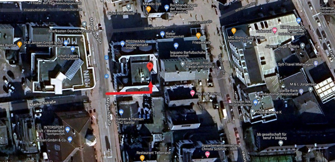 Mitten in der Westerländer Fußgängerzone, mit Blick auf die legendäre „Wilhelmine“ und ihren Brunnen, ist das Gebäude mit seinem kleinen markanten Ecktürmchen ein echter Eyecatcher der Inselhauptstadt. Die „Sturmkoje“ liegt im 1. OG und ist bequem über einen Fahrstuhl zu erreichen.
