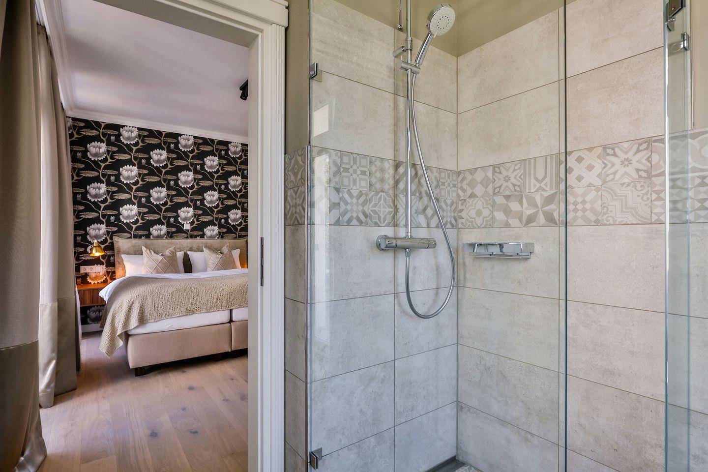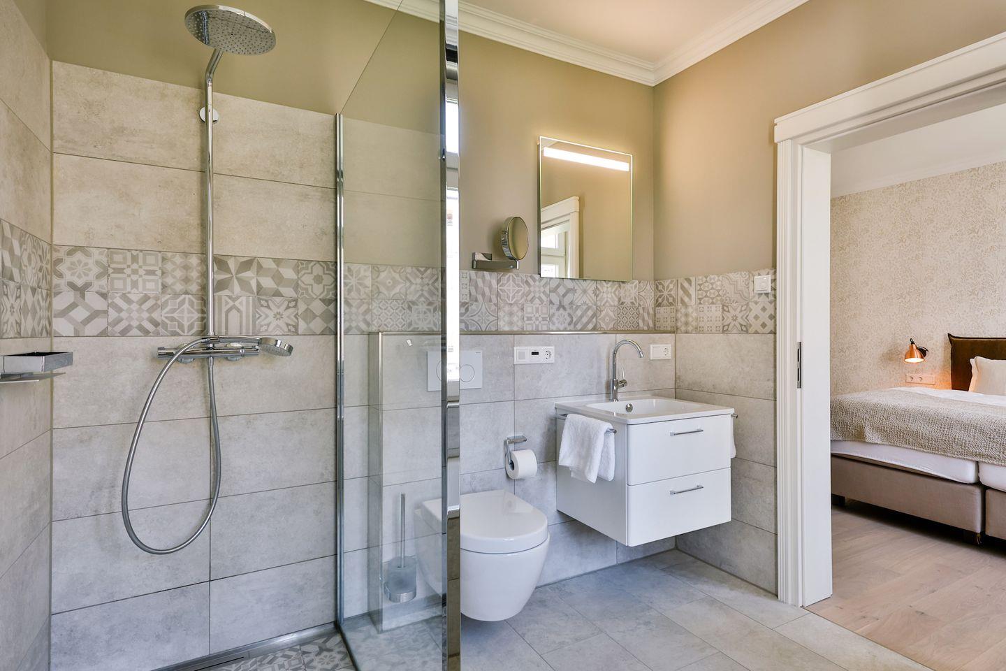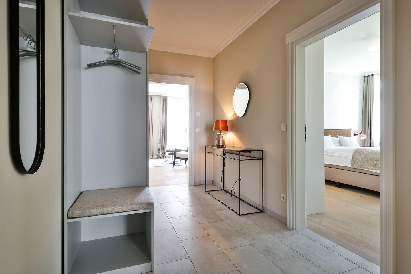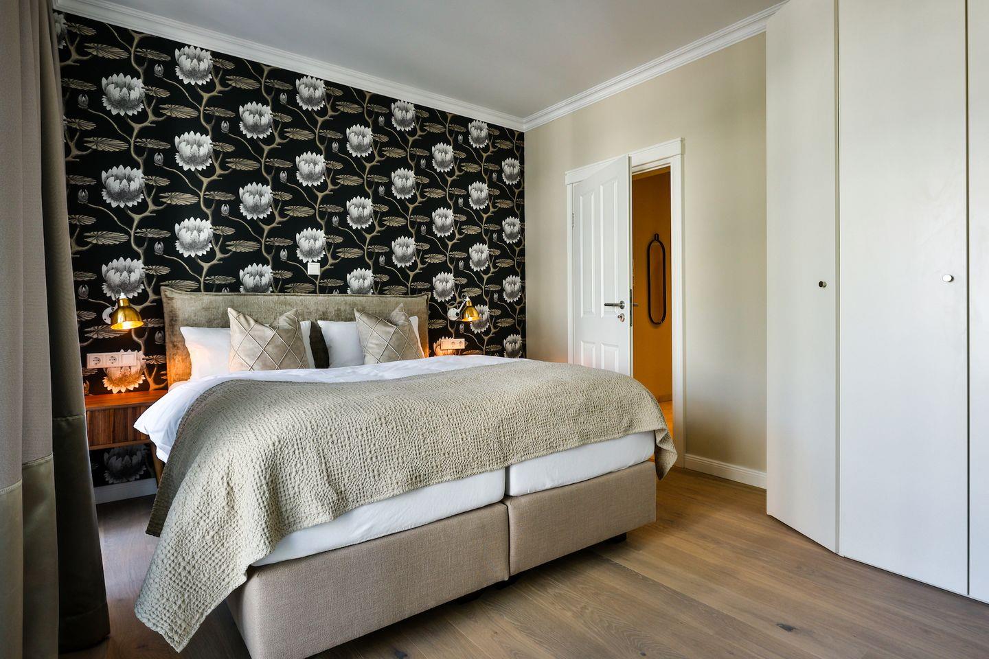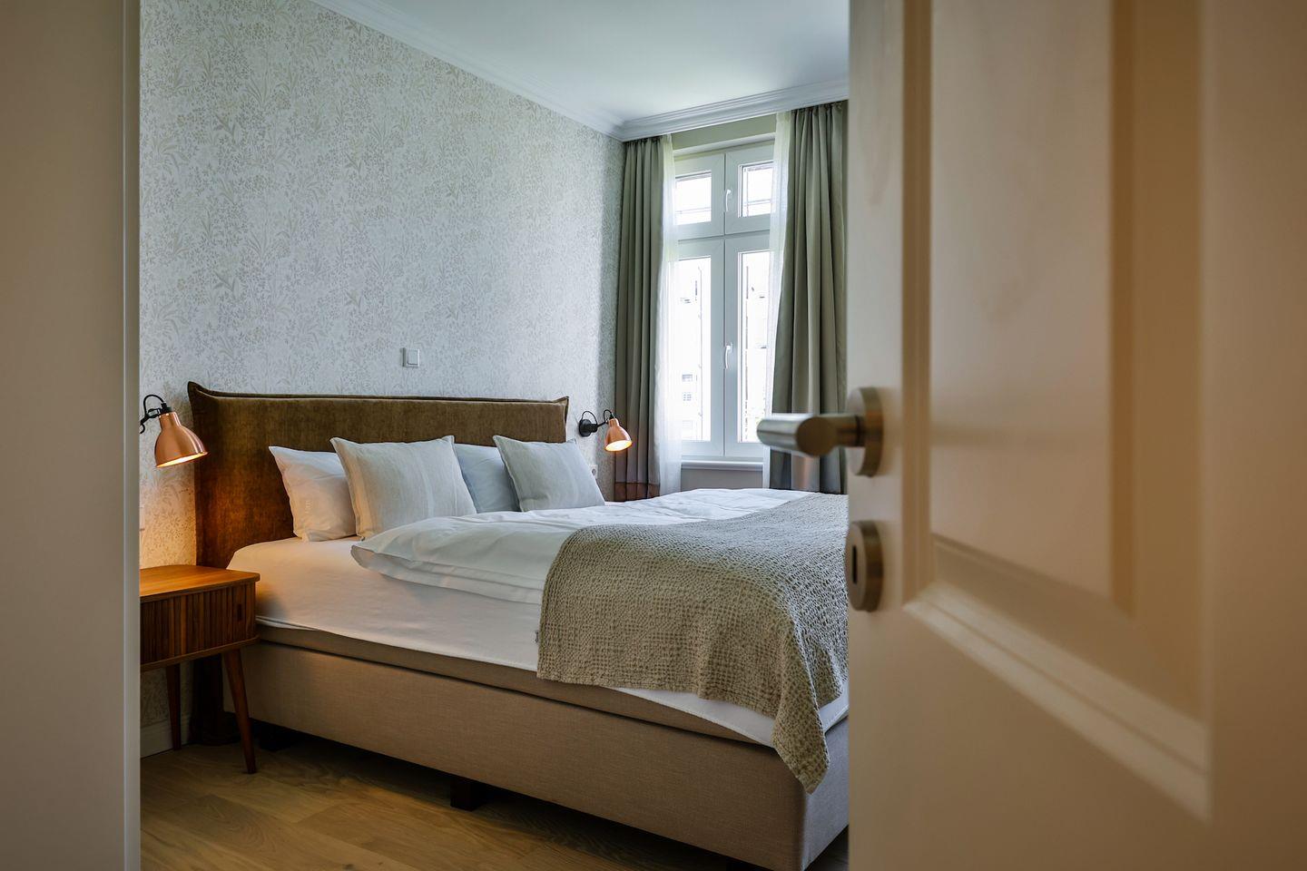 Beide Schlafzimmer sind sehr geschmackvoll eingerichtet und bieten höchsten Schlafkomfort. Das Hauptschlafzimmer ist mit einem Boxspringbett (180x200 cm) und TV ausgestattet. Das zweite Schlafzimmer ist ebenfalls mit einem Boxspringbett (160x200 cm) und TV eingerichtet. Beide Zimmer haben ein ruhiges Ambiente für erholsame Nächte. Die Wohnung bietet zwei moderne Badezimmer, die mit ebenerdigen Duschen, WC und Fön ausgestattet sind; ein Badezimmer hat zusätzlich eine Badewanne zum Entspannen und Wohlfühlen. Abgerundet wird der Bereich durch ein separates Gäste-WC.