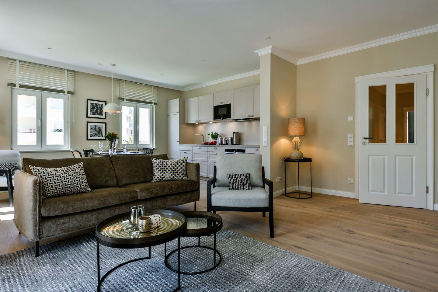 Der helle Wohn- und Essbereich lädt zum Verweilen ein und hat einen direkten Zugang zum Südbalkon. Hier scheint die Sonne zu fast jeder Tageszeit. Lassen Sie dort den Abend gemütlich ausklingen. Den Nordbalkon begehen Sie über eines der Schlafzimmer. Die hochwertige Loewe klang s3-Anlage sorgt für ein exklusives Klangerlebnis und verfügt über Digital-Radio, Bluetooth, CD-Player und USB-Anschlüsse. Eine moderne Einrichtung und das großzügige Raumangebot machen das Wohnzimmer zu einem Ort der Entspannung und Erholung.