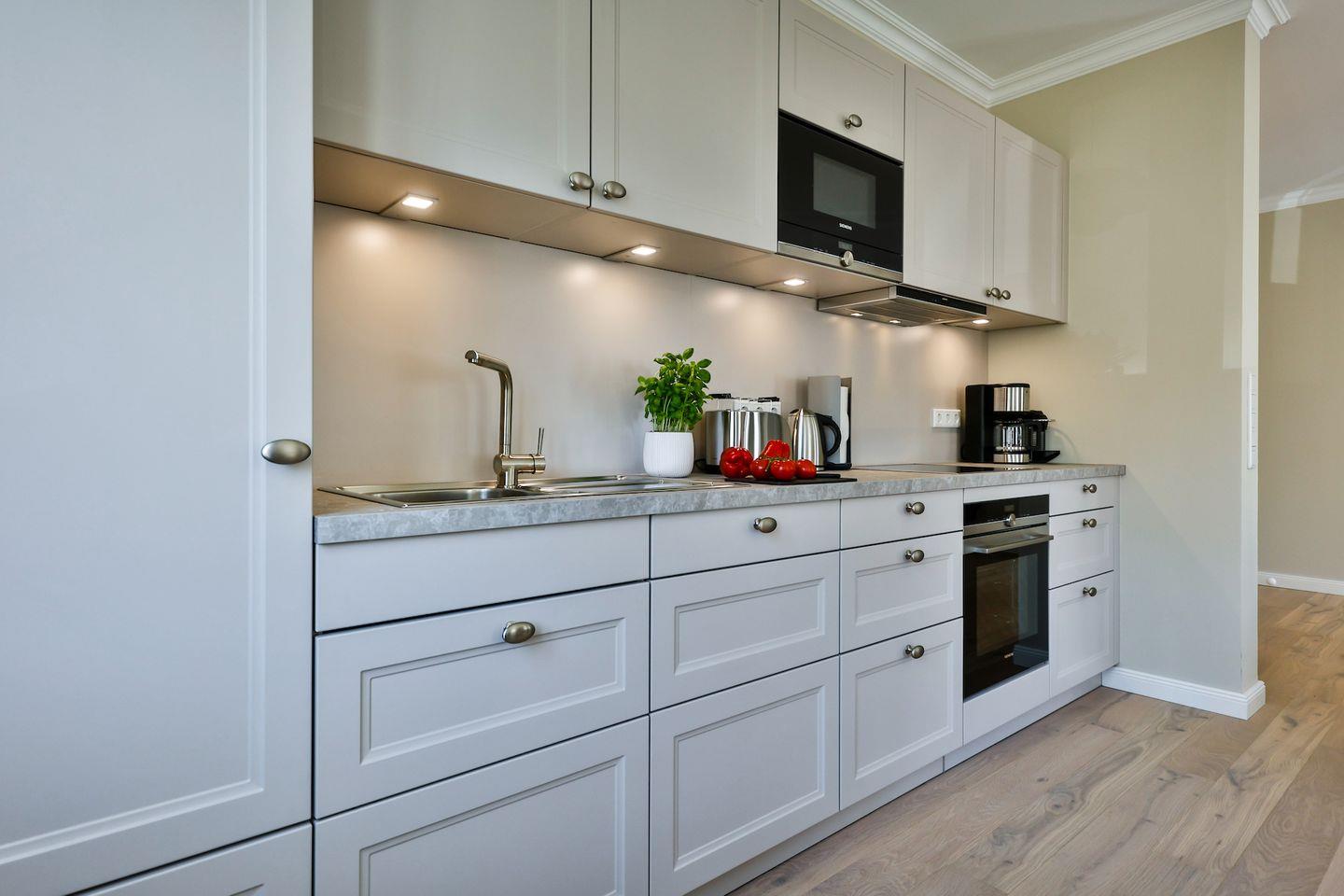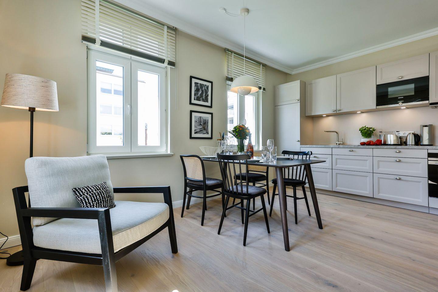 Die offene Küche bietet alles, was Sie in einer Küche erwarten. Hochwertige Elektrogeräte und eine umfangreiche Ausstattung machen das Kochen und Zubereiten zum Genuss. Im angrenzenden Essbereich finden Sie gemütlich Platz für gemeinsame Mahlzeiten und gesellige Runden.