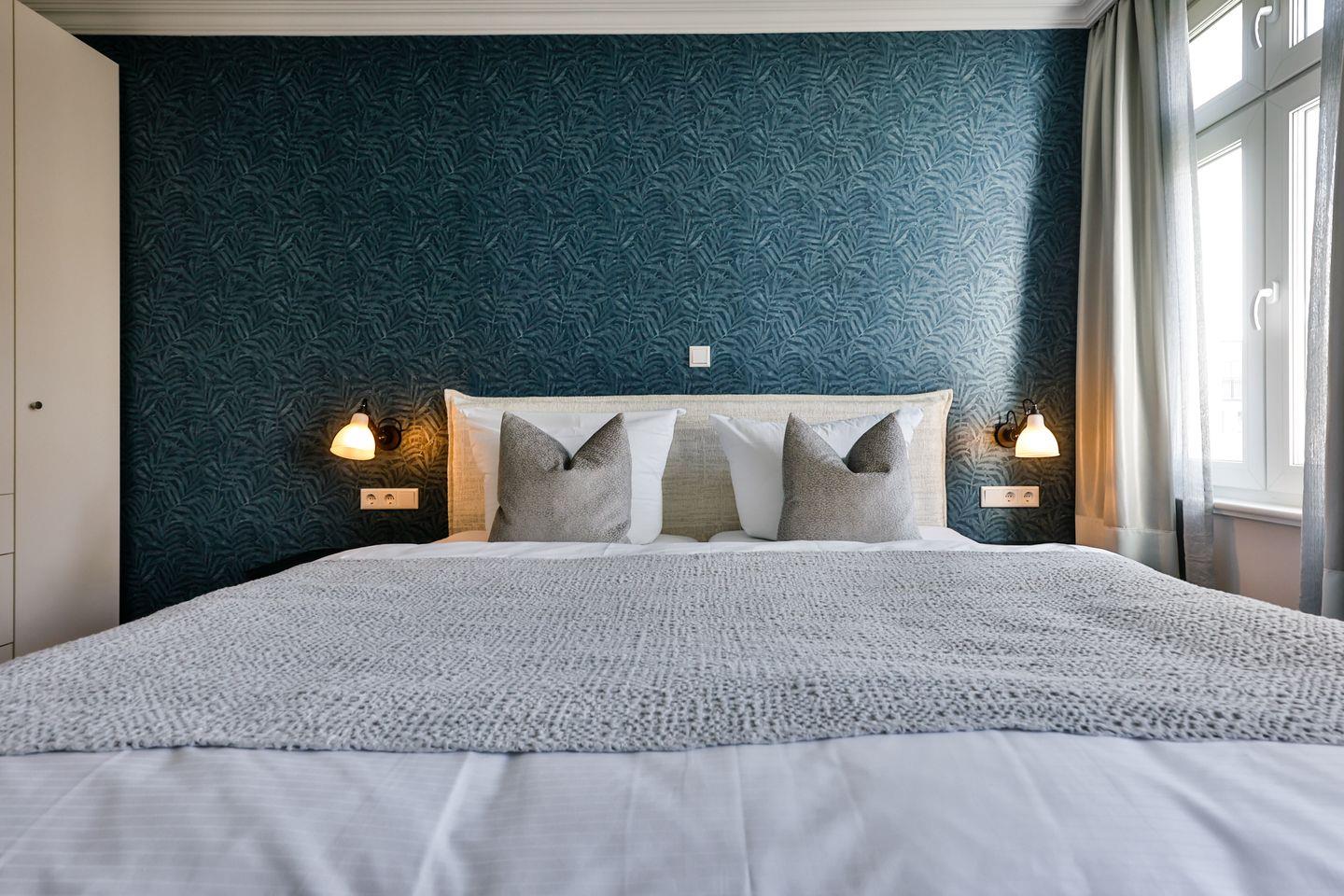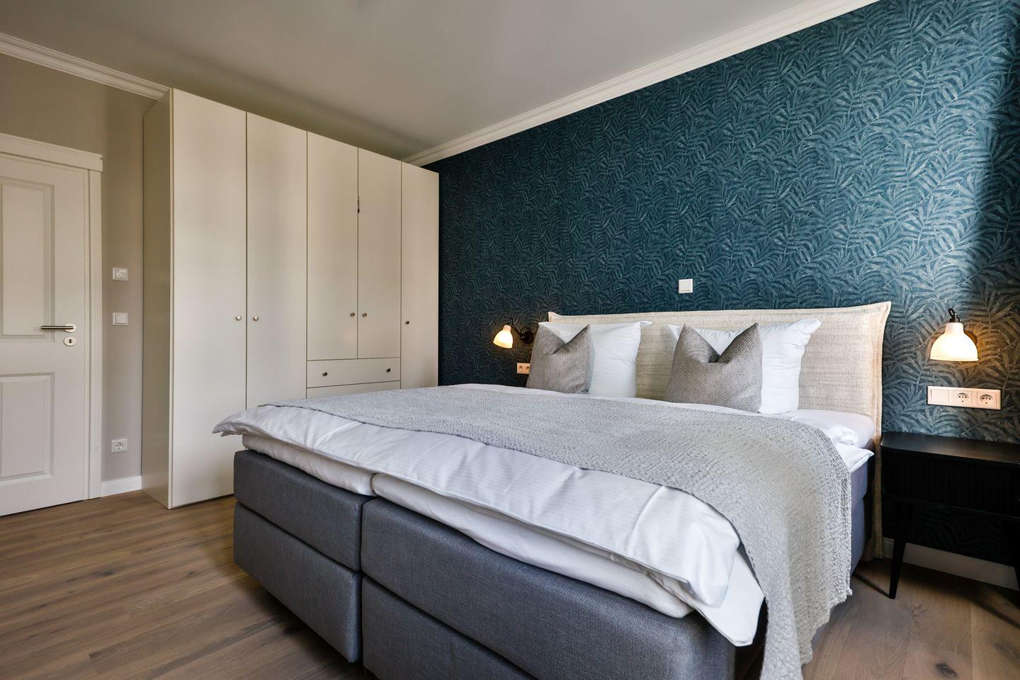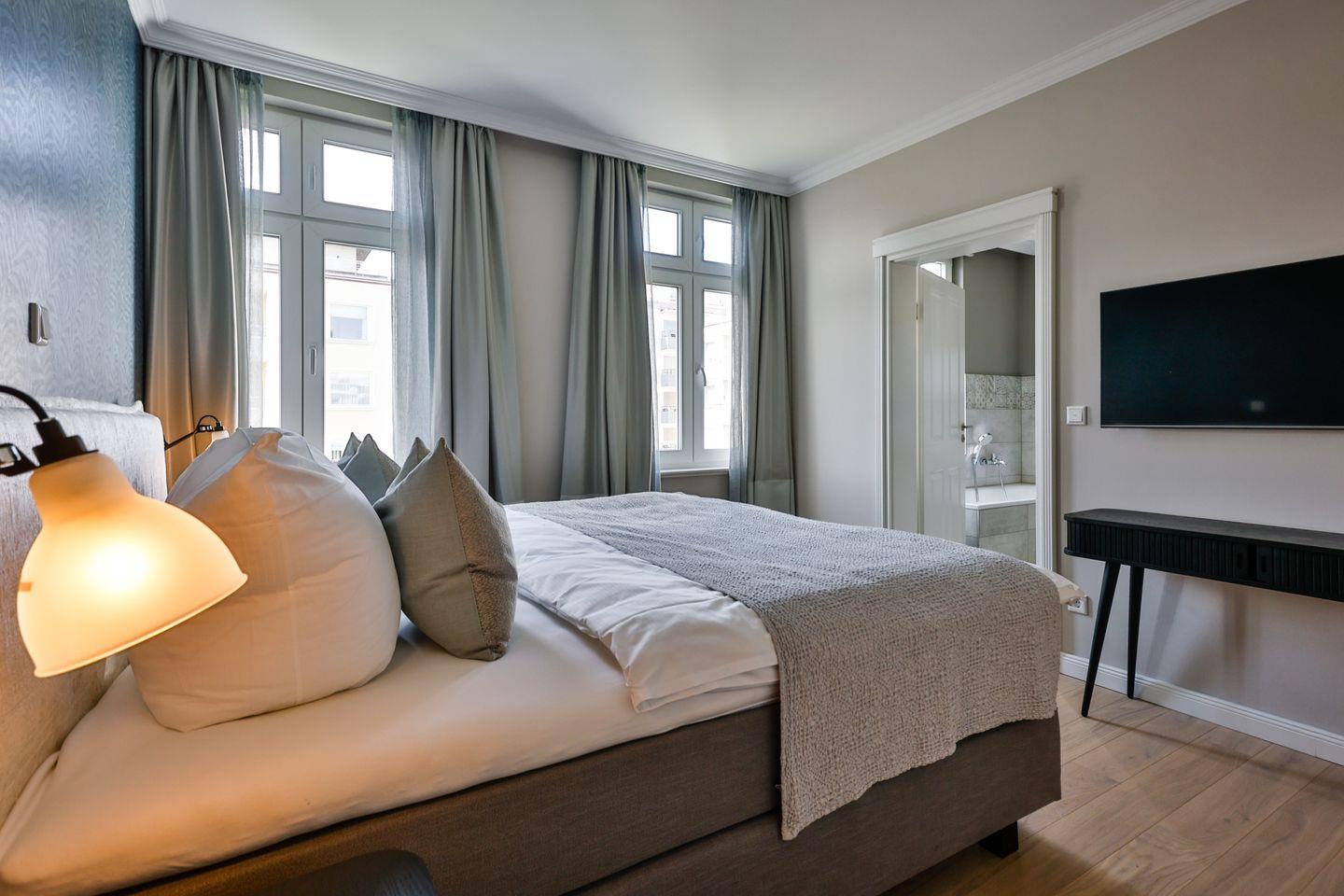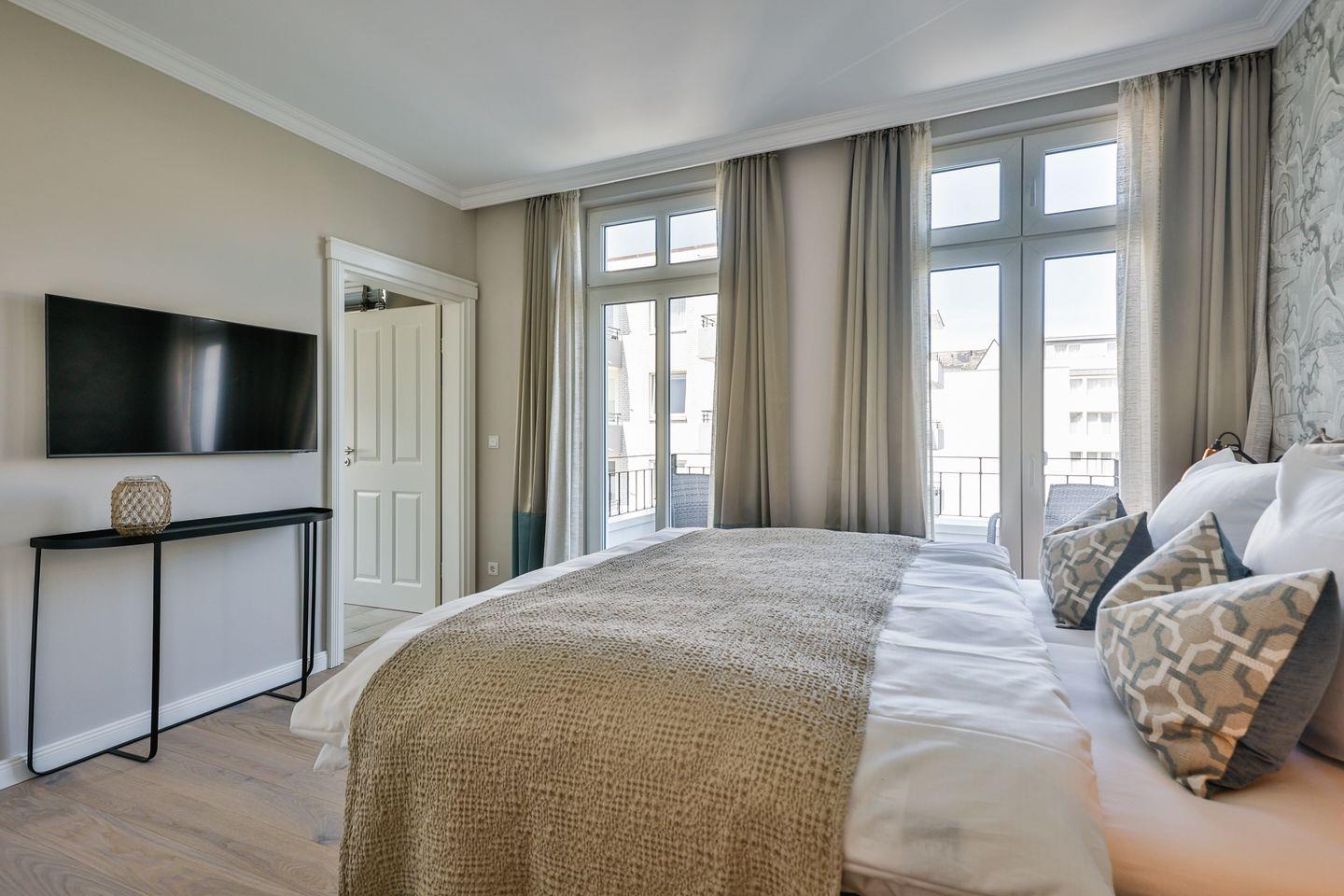Beide Schlafzimmer sind sehr geschmackvoll eingerichtet und bieten höchsten Schlafkomfort. Das Hauptschlafzimmer ist mit einem Boxspringbett (180x200 cm) und TV ausgestattet. Das zweite Schlafzimmer ist ebenfalls mit einem Boxspringbett (160x200 cm) und TV eingerichtet. Beide Zimmer haben ein ruhiges Ambiente für erholsame Nächste. Die Wohnung bietet zwei moderne Badezimmer, die mit ebenerdigen Duschen, WC und Fön ausgestattet sind; ein Badezimmer hat zusätzlich eine Badewanne zum Entspannen und Wohlfühlen. Abgerundet wird der Bereich durch ein separates Gäste-WC.