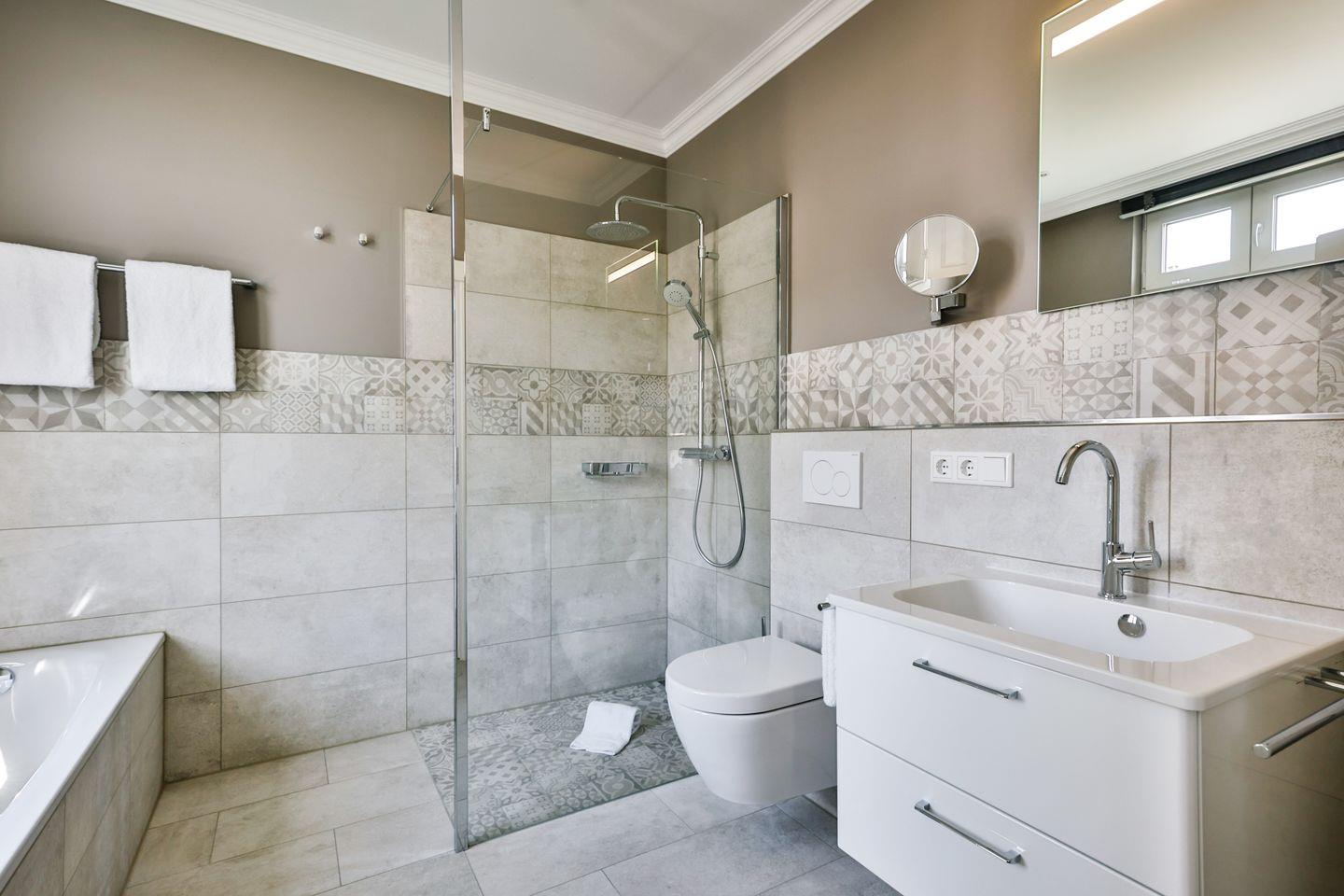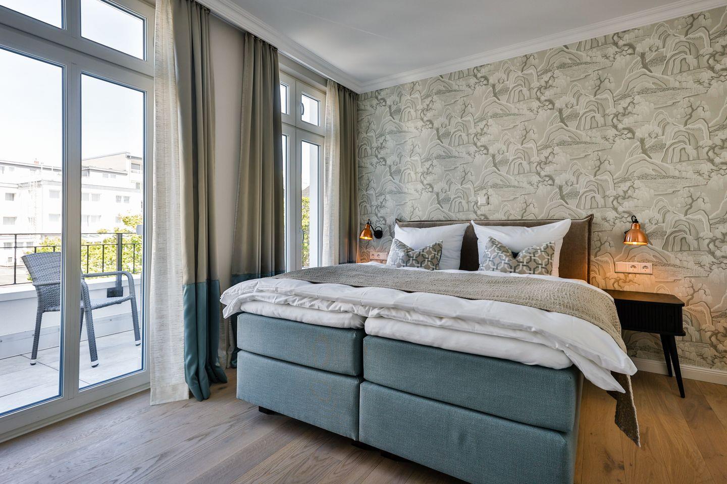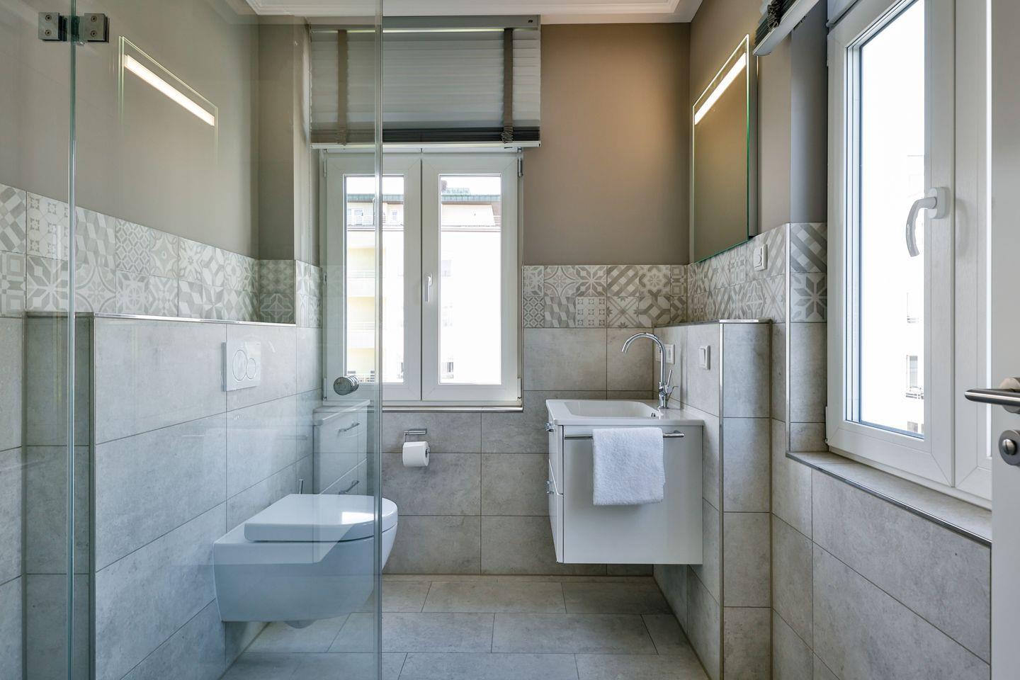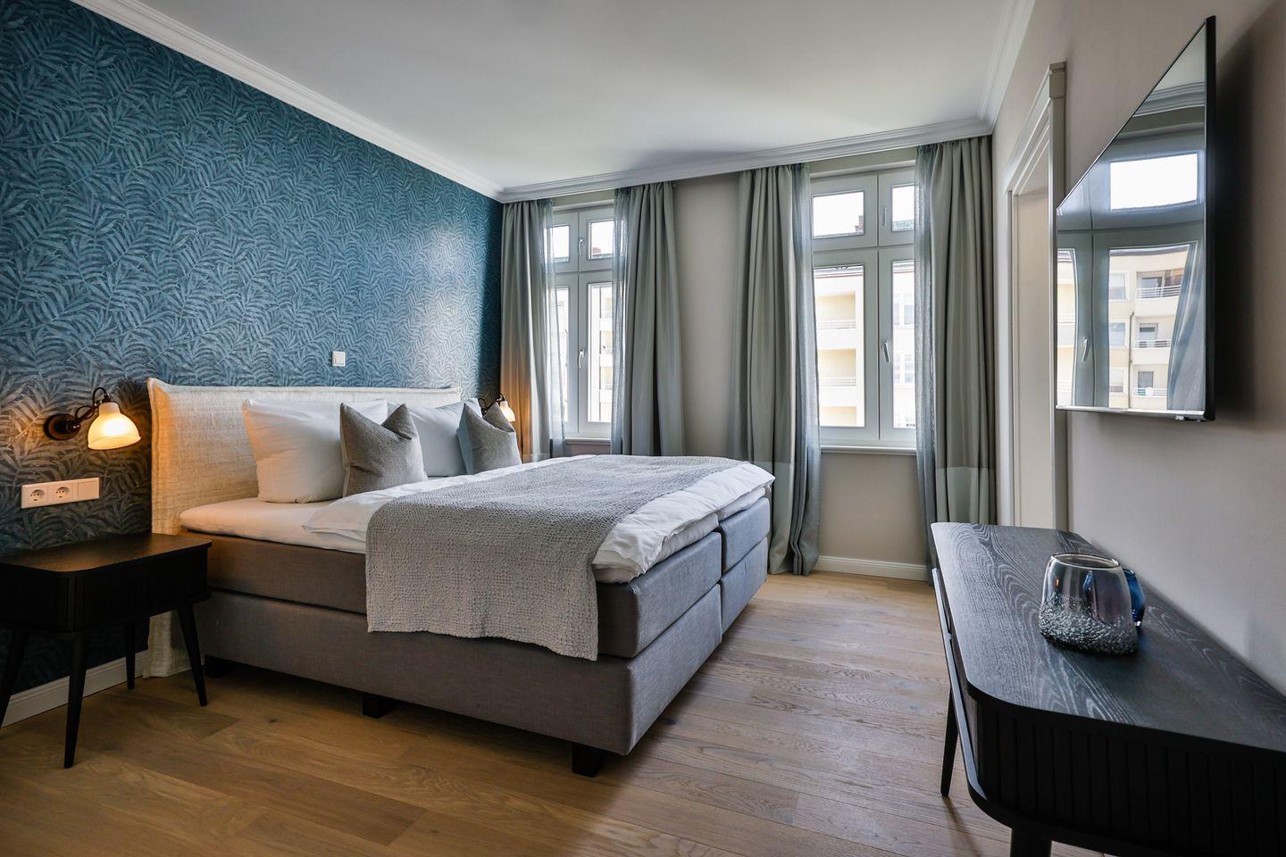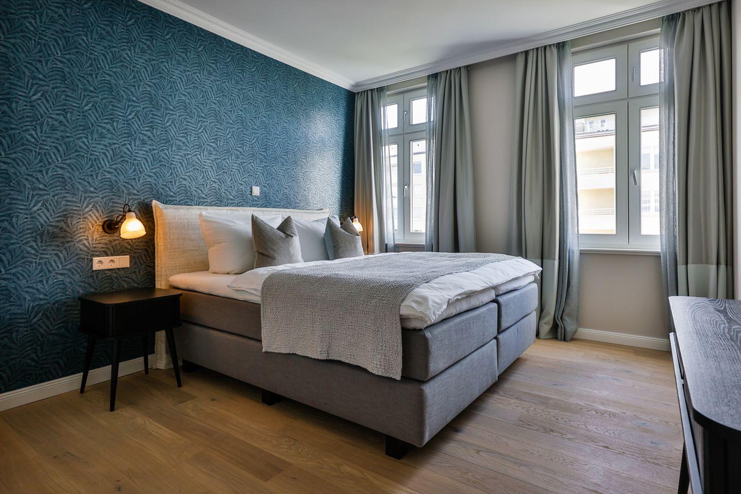 Beide Schlafzimmer sind sehr geschmackvoll eingerichtet und bieten höchsten Schlafkomfort. Das Hauptschlafzimmer ist mit einem Boxspringbett (180x200 cm) und TV ausgestattet. Das zweite Schlafzimmer ist ebenfalls mit einem Boxspringbett (160x200 cm) und TV eingerichtet. Beide Zimmer haben ein ruhiges Ambiente für erholsame Nächste. Die Wohnung bietet zwei moderne Badezimmer, die mit ebenerdigen Duschen, WC und Fön ausgestattet sind; ein Badezimmer hat zusätzlich eine Badewanne zum Entspannen und Wohlfühlen. Abgerundet wird der Bereich durch ein separates Gäste-WC.