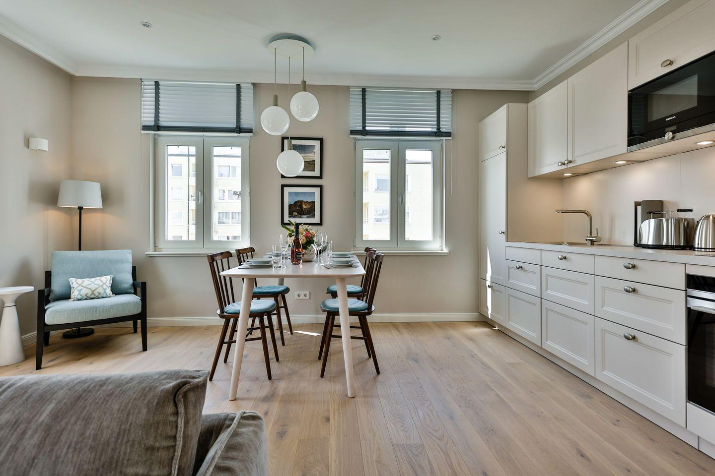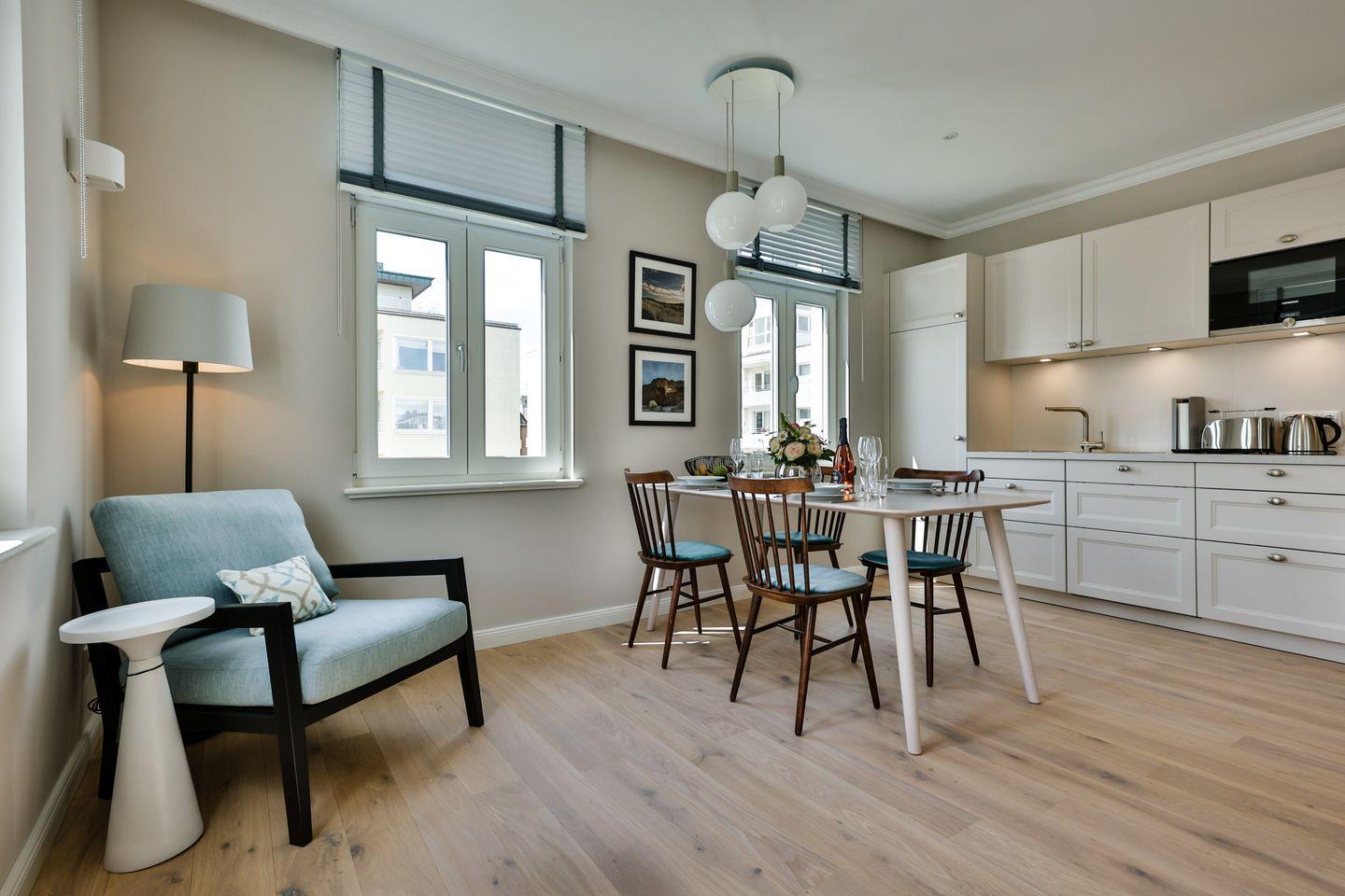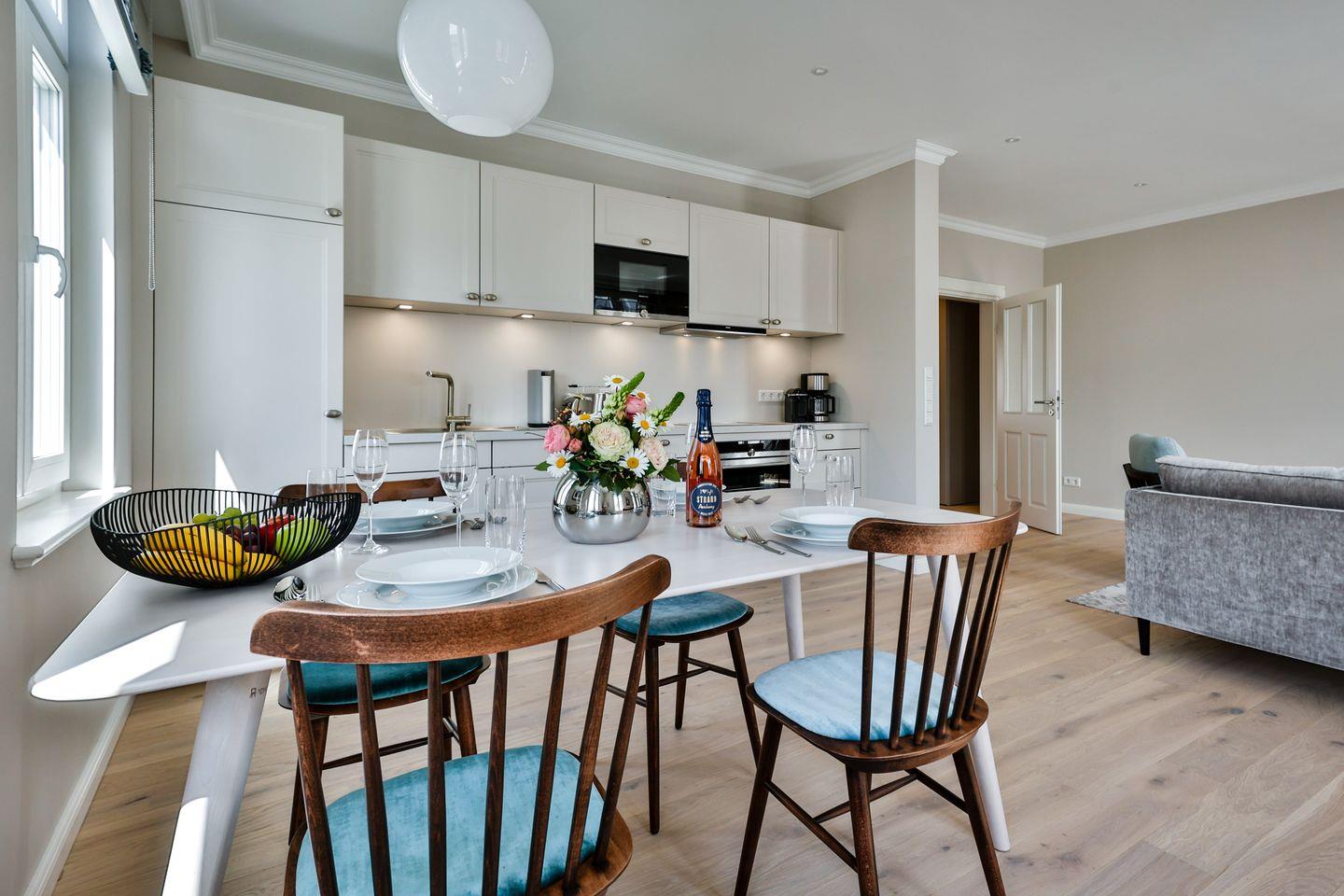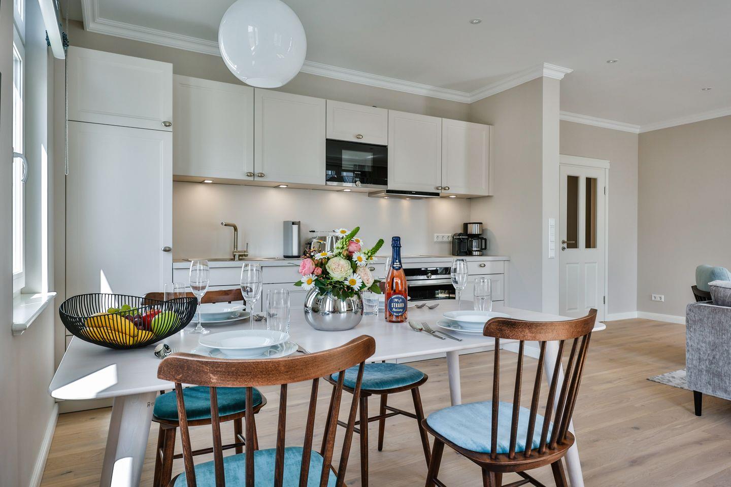 Die offene, voll ausgestattete Küche bietet alles, was Sie in einer Küche erwarten. Hochwertige Elektrogeräte und eine umfangreiche Ausstattung machen das Kochen und Zubereiten zum Genuss. Im angrenzenden Essbereich finden Sie einen gemütlichen Platz für gemeinsame Mahlzeiten und gesellige Runden.