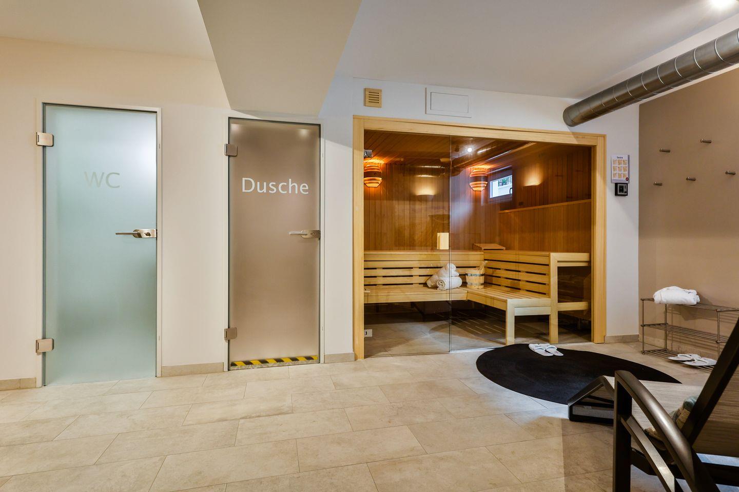 Der ansprechende Wellnessbereich im Untergeschoss steht Ihnen täglich zwischen 16:00 und 20:00 Uhr zur Verfügung und bietet einen Sauna- und Ruhebereich für Ihre Erholung.