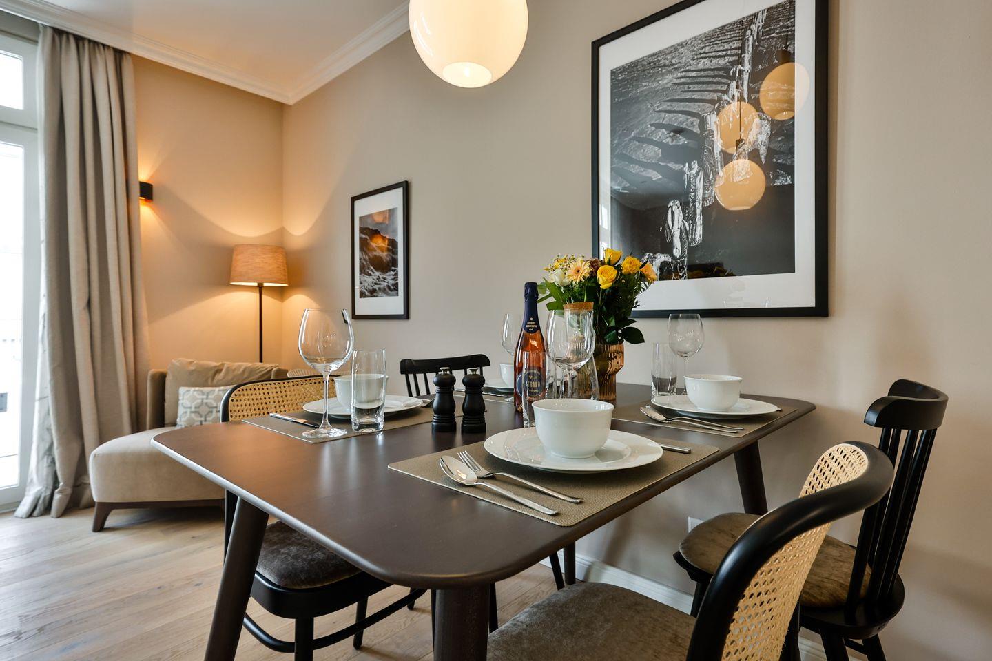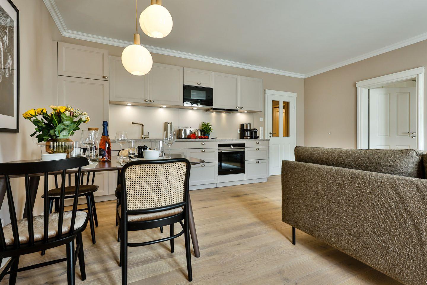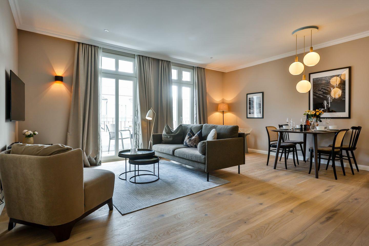 Der helle Wohn- und Essbereich lädt zum Verweilen ein und hat einen direkten Zugang zur Loggia in Südausrichtung. Hier scheint die Sonne zu fast jeder Tageszeit oder Sie lassen dort den Abend entspannt ausklingen. Die hochwertige Loewe klang s3-Anlage sorgt für ein exzellentes Klangerlebnis und verfügt über Digital-Radio, Bluetooth, CD-Player und USB-Anschlüsse. Eine moderne Einrichtung mit einem offenen Raumkonzept machen diese Ferienwohnung zu einem Ort der Entspannung und Erholung.