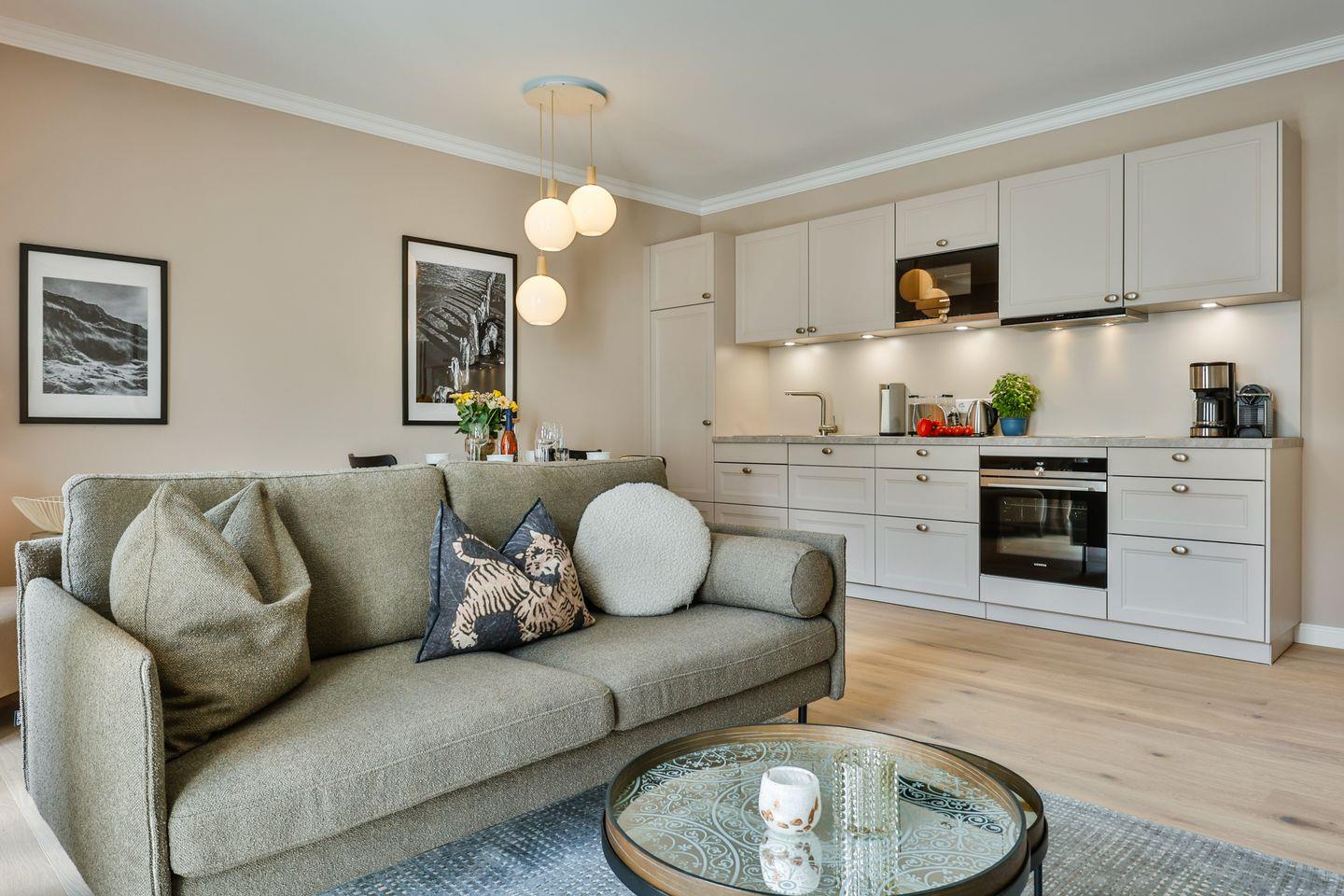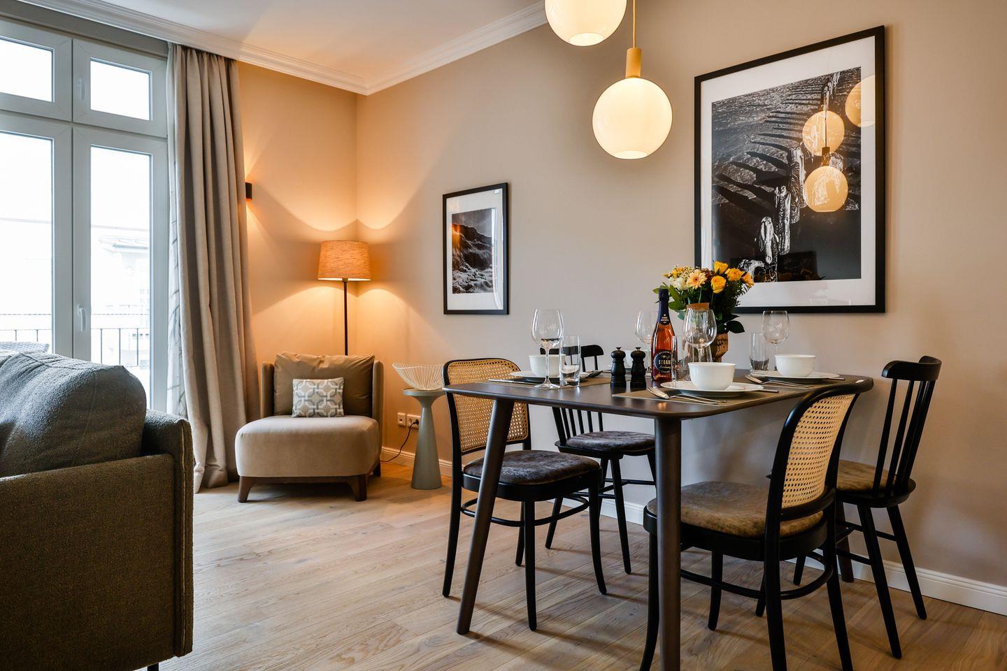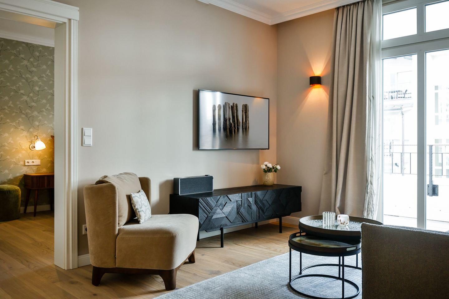Der helle Wohn- und Essbereich lädt zum Verweilen ein und hat einen direkten Zugang zur Loggia in Südausrichtung. Hier scheint die Sonne zu fast jeder Tageszeit oder Sie lassen dort den Abend entspannt ausklingen. Die hochwertige Loewe klang s3-Anlage sorgt für ein exzellentes Klangerlebnis und verfügt über Digital-Radio, Bluetooth, CD-Player und USB-Anschlüsse. Eine moderne Einrichtung mit einem offenen Raumkonzept machen diese Ferienwohnung zu einem Ort der Entspannung und Erholung.