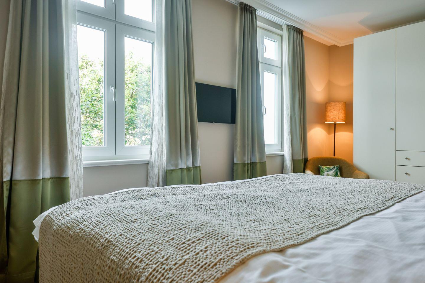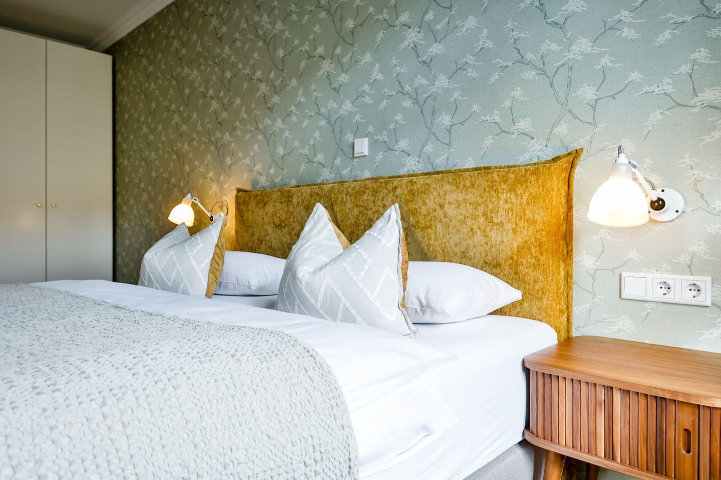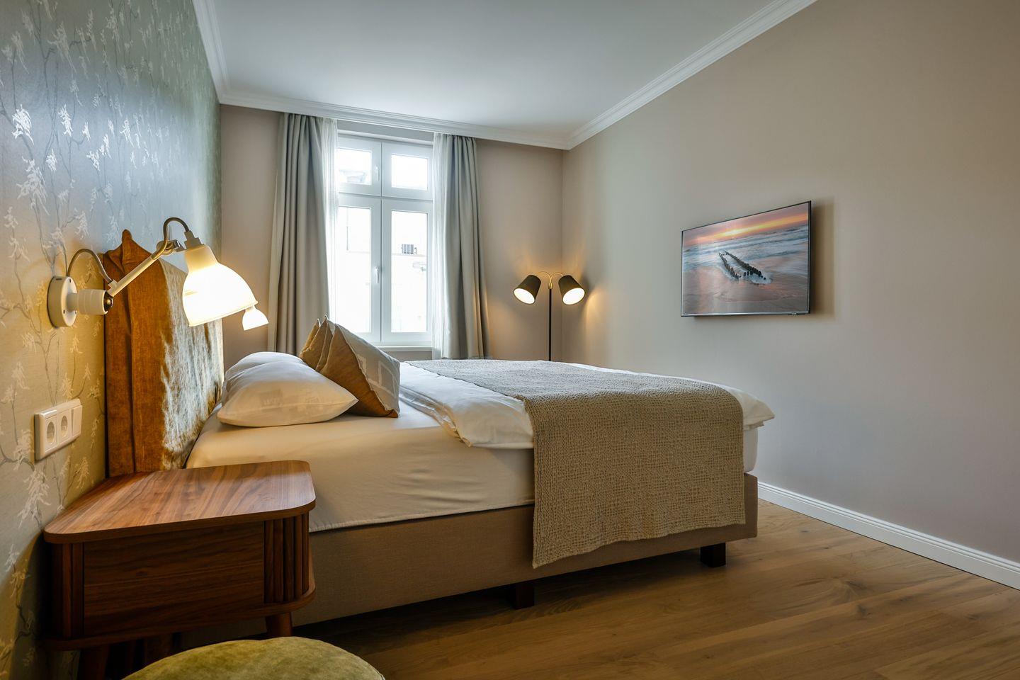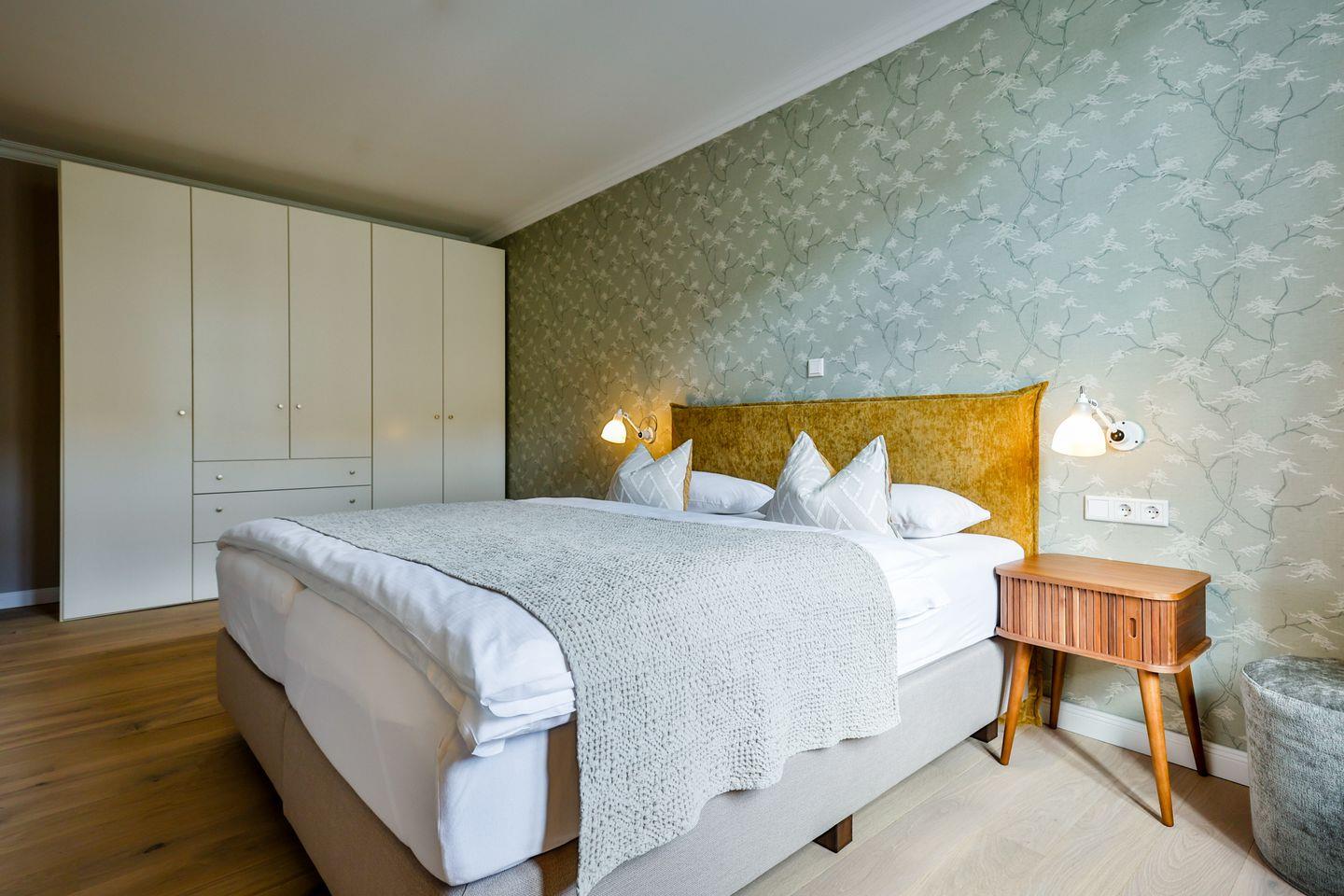 Beide Schlafzimmer sind sehr geschmackvoll eingerichtet und bieten höchsten Schlafkomfort. Das Hauptschlafzimmer ist mit einem Boxspringbett (180x200 cm) und TV ausgestattet. Das zweite Schlafzimmer ist ebenfalls mit einem Boxspringbett (180x200 cm) und TV eingerichtet. Bei Bedarf kann für eine fünfte Person ein Zustellbett bereitgestellt werden. Die Wohnung bietet zwei moderne Badezimmer, die mit ebenerdigen Duschen, WC und Fön ausgestattet sind. Ein Badezimmer hat zusätzlich eine Badewanne zum Entspannen und Wohlfühlen. Abgerundet wird der Bereich durch ein separates Gäste-WC.