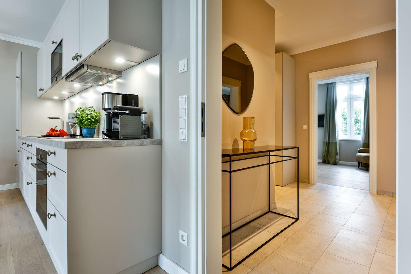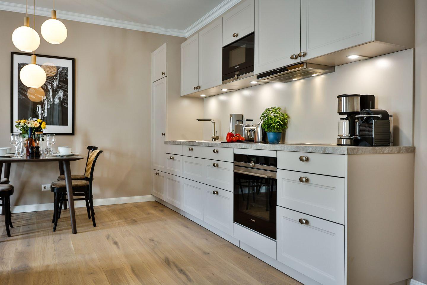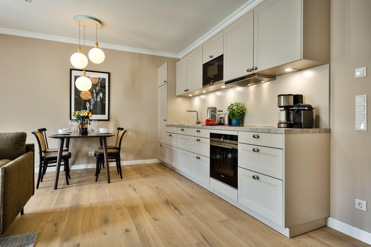 Die offene Küche bietet alles, was Sie in einer Küche erwarten. Hochwertige Elektrogeräte und eine umfangreiche Ausstattung machen das Kochen und Zubereiten zum Genuss. Im angrenzenden Essbereich finden Sie ausreichend Platz für gemeinsame Mahlzeiten und gesellige Runden.