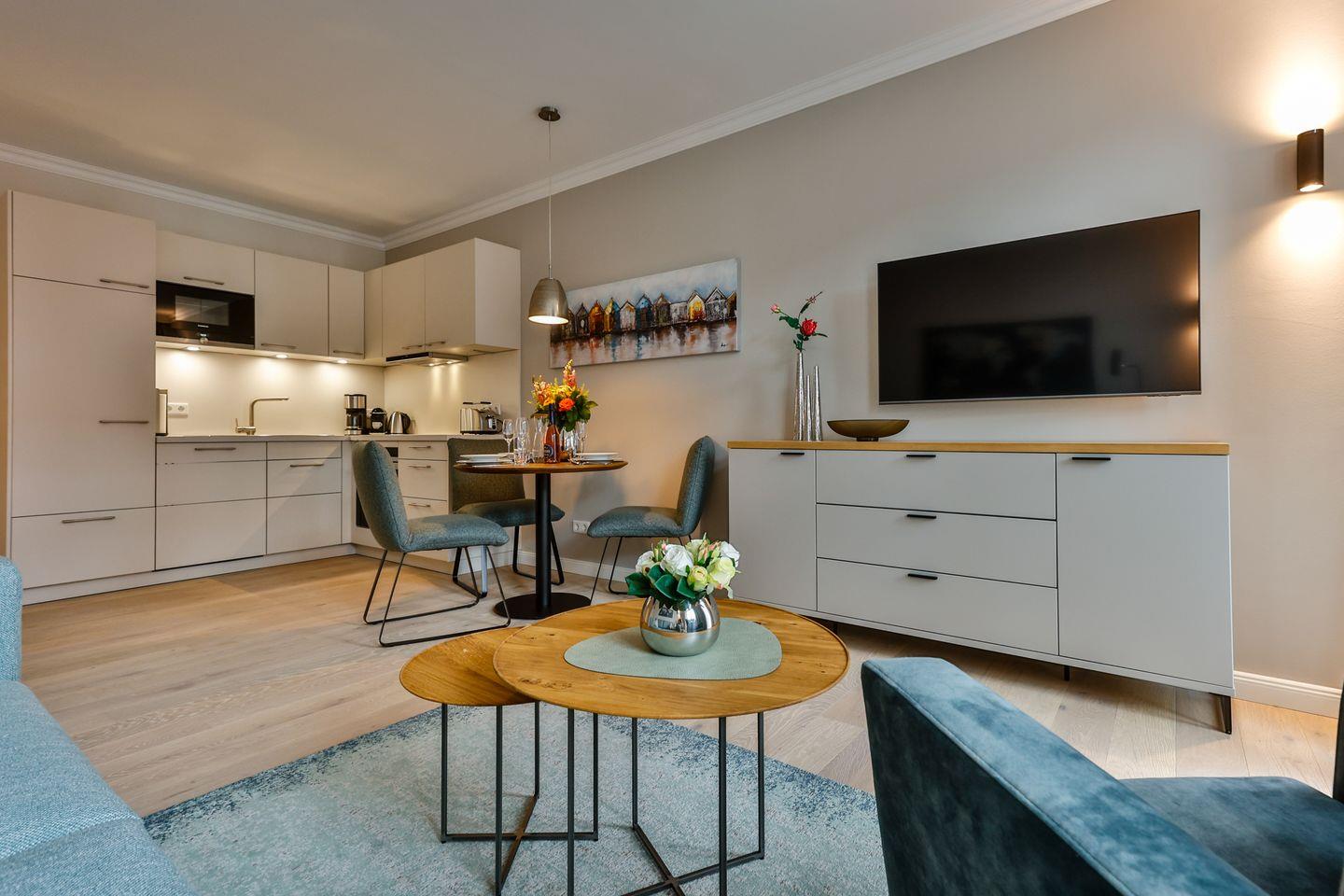 Der lichtdurchflutete Wohnbereich lädt mit seiner stilvollen Einrichtung zum Verweilen ein und hat direkten Zugang zum Südbalkon. Hier scheint die Sonne zu fast jeder Tageszeit. Lassen Sie dort den Abend gemütlich ausklingen. Die hochwertige Loewe klang s3-Anlage sorgt für ein exklusives Klangerlebnis und verfügt über Digital-Radio, Bluetooth, CD-Player und USB-Anschlüsse. Eine moderne Einrichtung und das großzügige Raumangebot machen diesen Bereich zu einem Ort der Entspannung und Erholung.