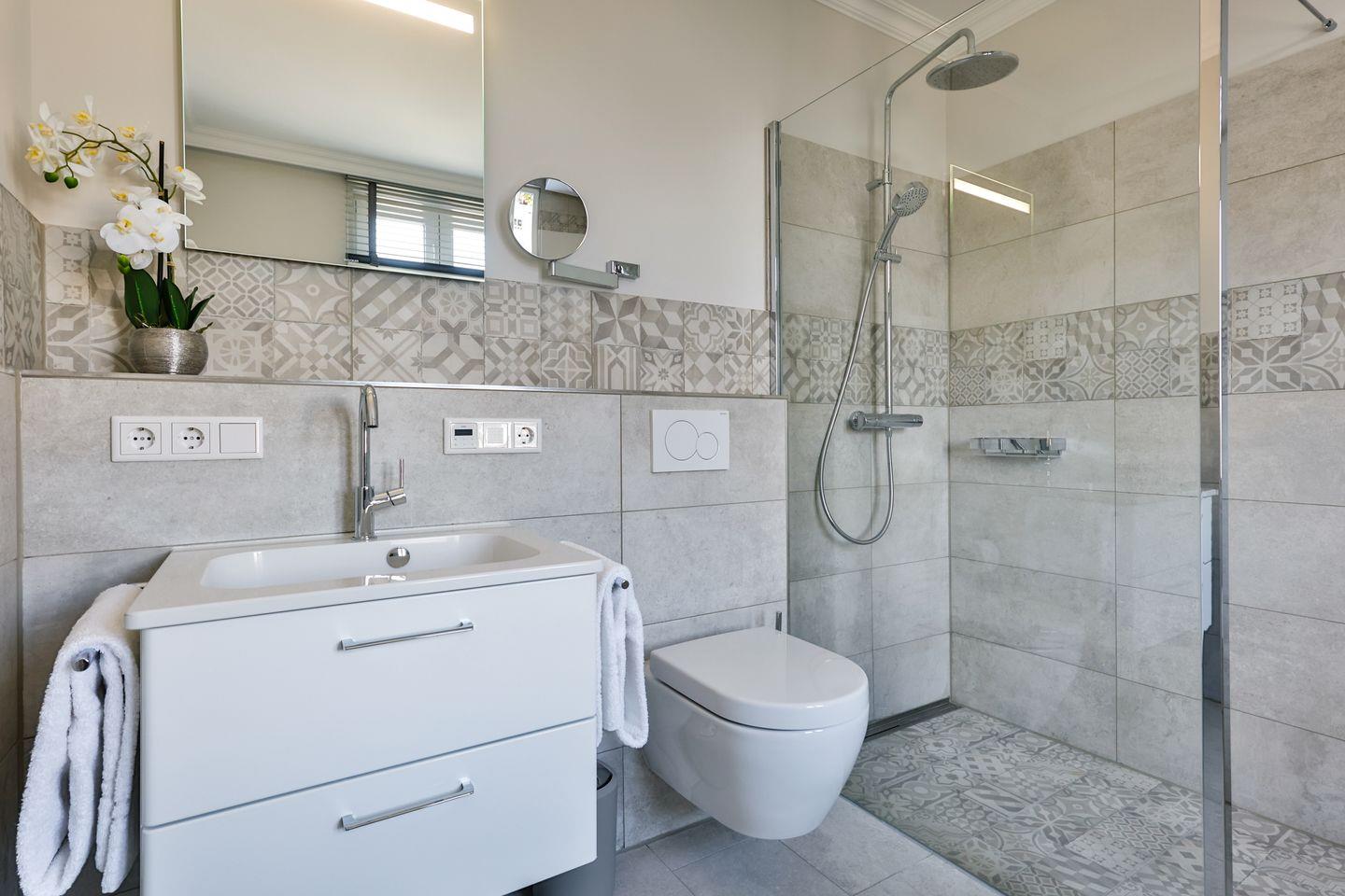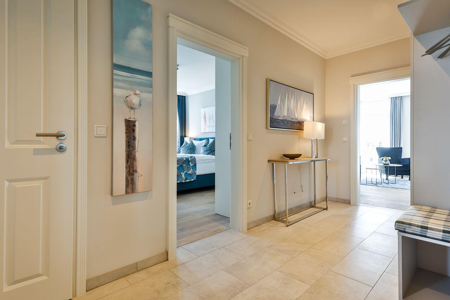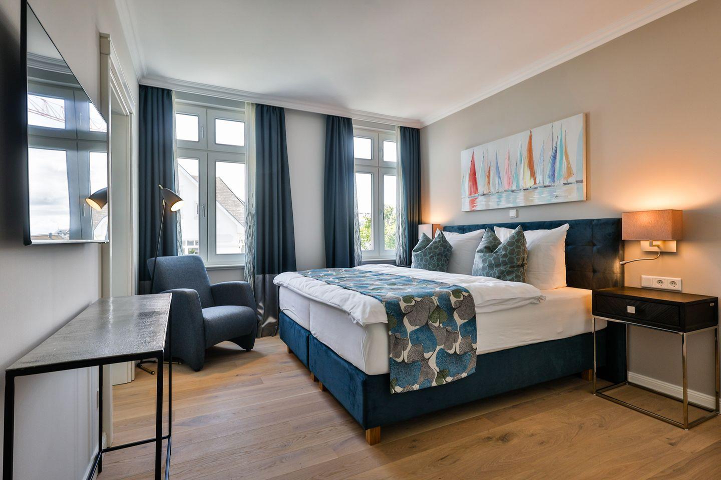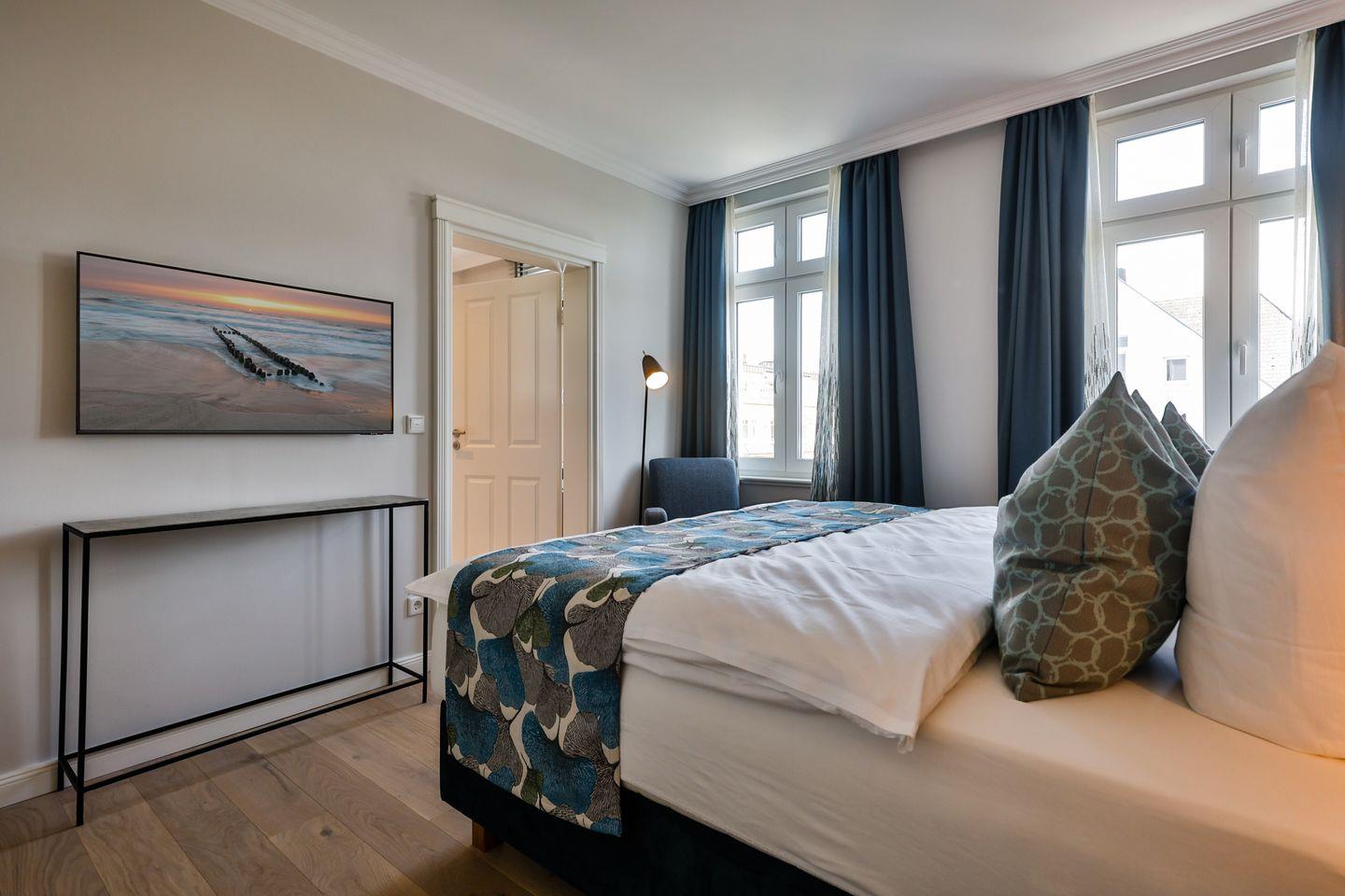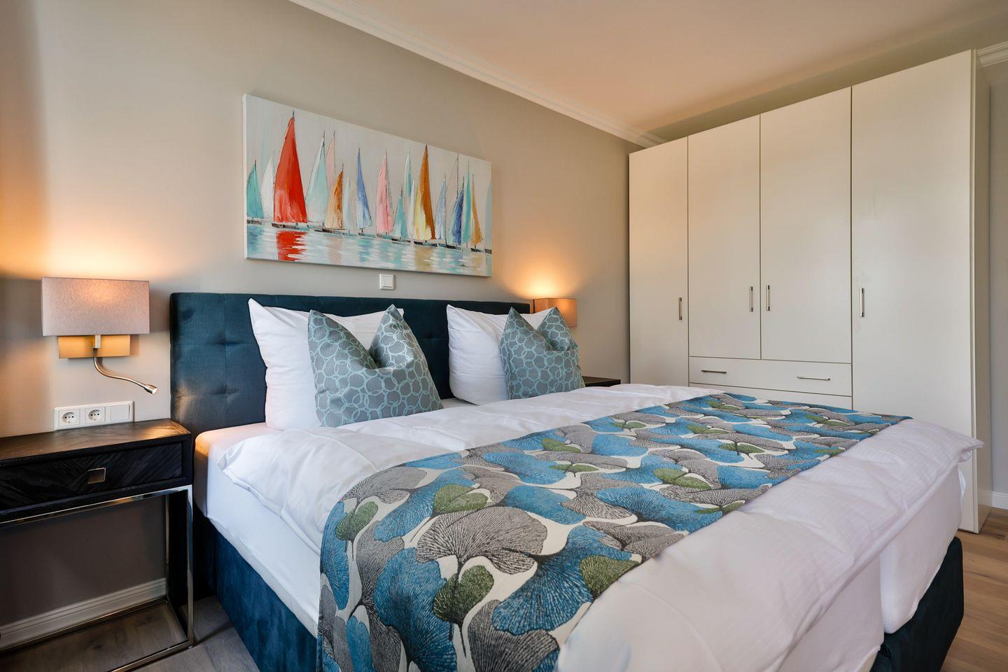 Beide Schlafzimmer sind sehr geschmackvoll eingerichtet und bieten höchsten Schlafkomfort. Das Hauptschlafzimmer ist mit einem Boxspringbett (180x200 cm) und TV ausgestattet. Das zweite Schlafzimmer ist ebenfalls mit einem Boxspringbett (160x200 cm) und TV eingerichtet. Beide Zimmer haben ein ruhiges Ambiente für erholsame Nächte. Die Wohnung bietet zwei moderne Badezimmer, die mit ebenerdigen Duschen, WC und Fön ausgestattet sind; ein Badezimmer hat zusätzlich eine Badewanne zum Entspannen und Wohlfühlen. Abgerundet wird der Bereich durch ein zusätzliches Gäste-WC.