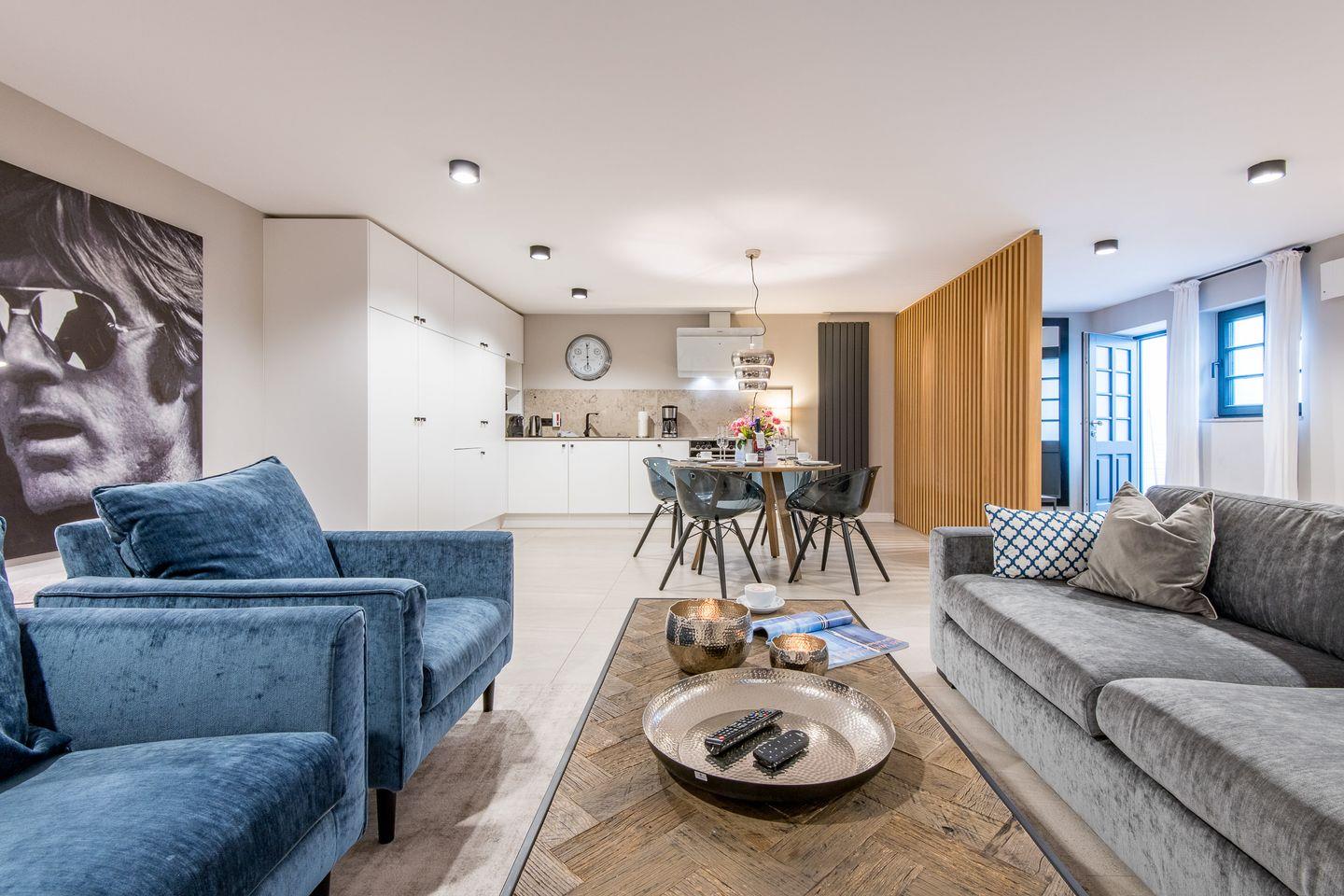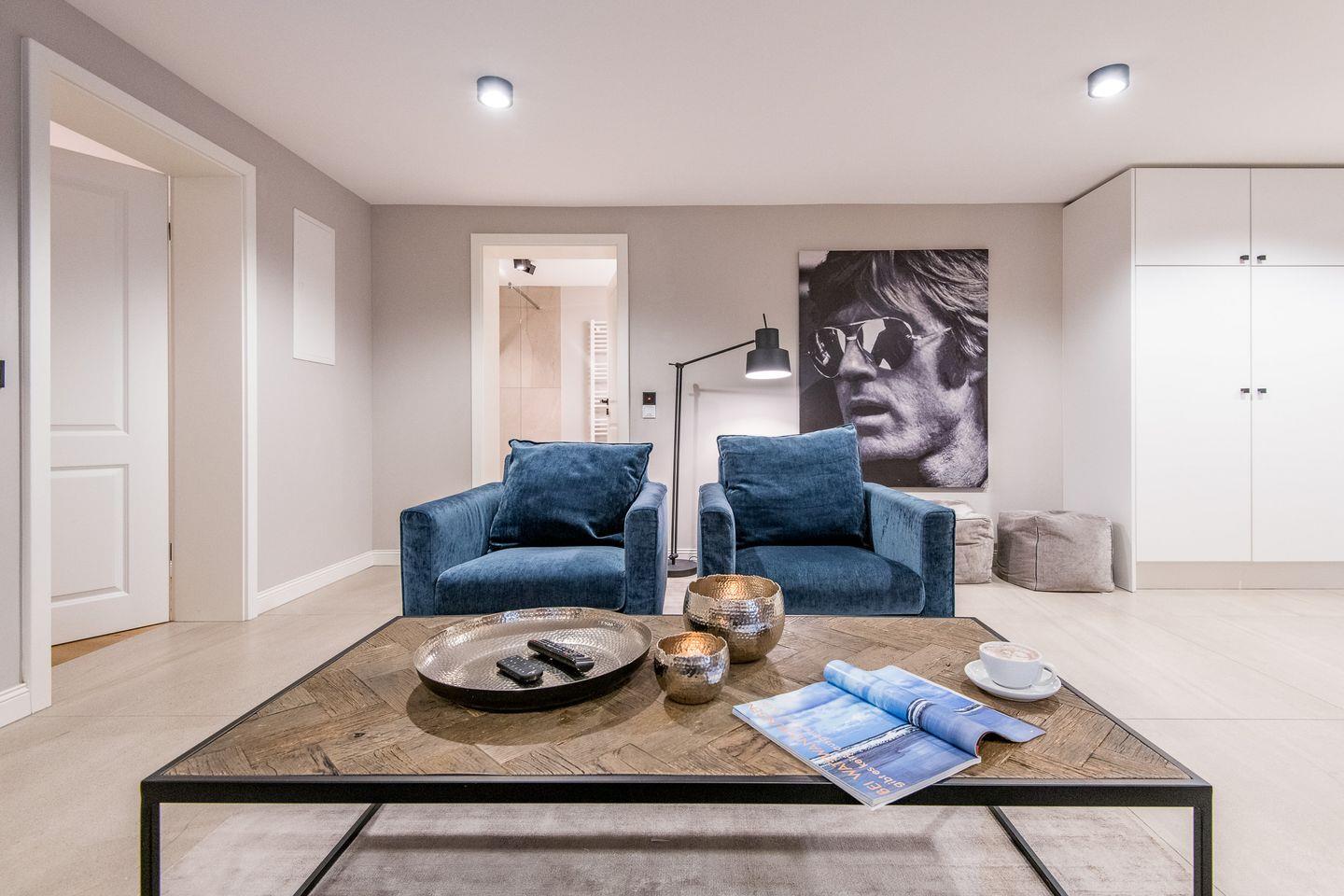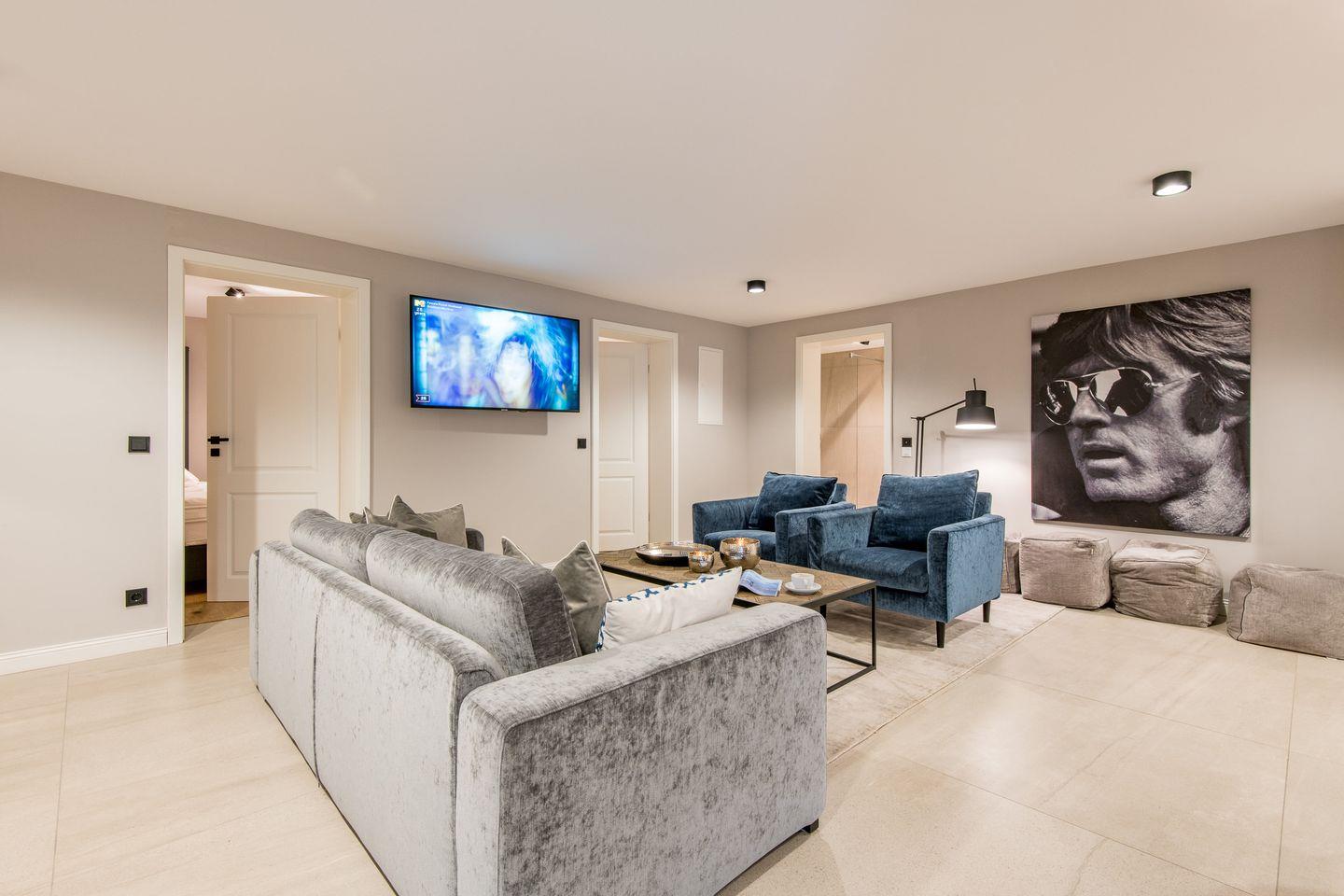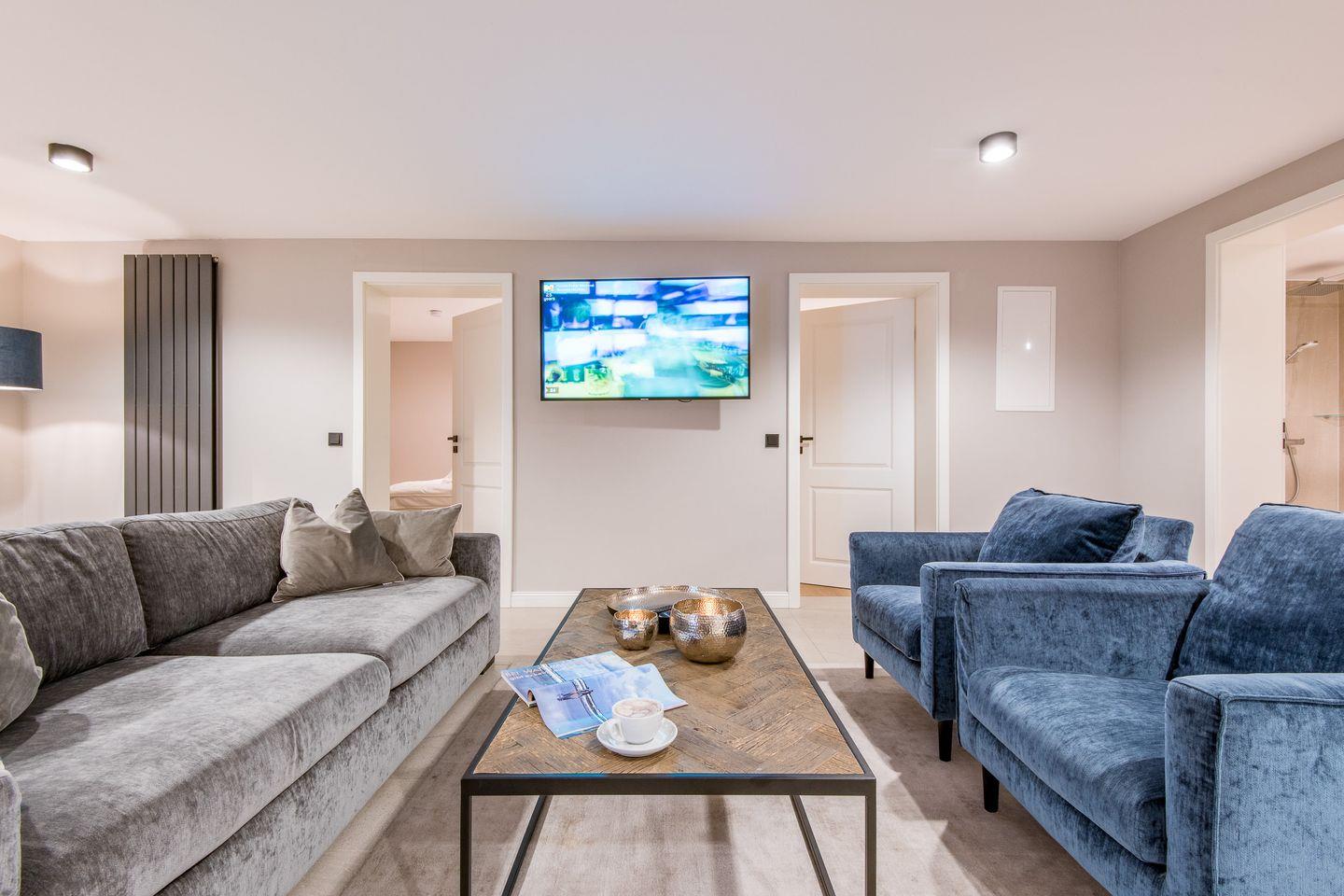 Das gemütliche Wohnzimmer ist stilvoll eingerichtet und lädt mit einem komfortablen Sofa und Flatscreen-TV zu entspannten Stunden ein. Die harmonische Gestaltung und die lichtdurchflutete Atmosphäre sorgen für eine Wohlfühl-Oase, in der Sie den Urlaub vollends genießen können.