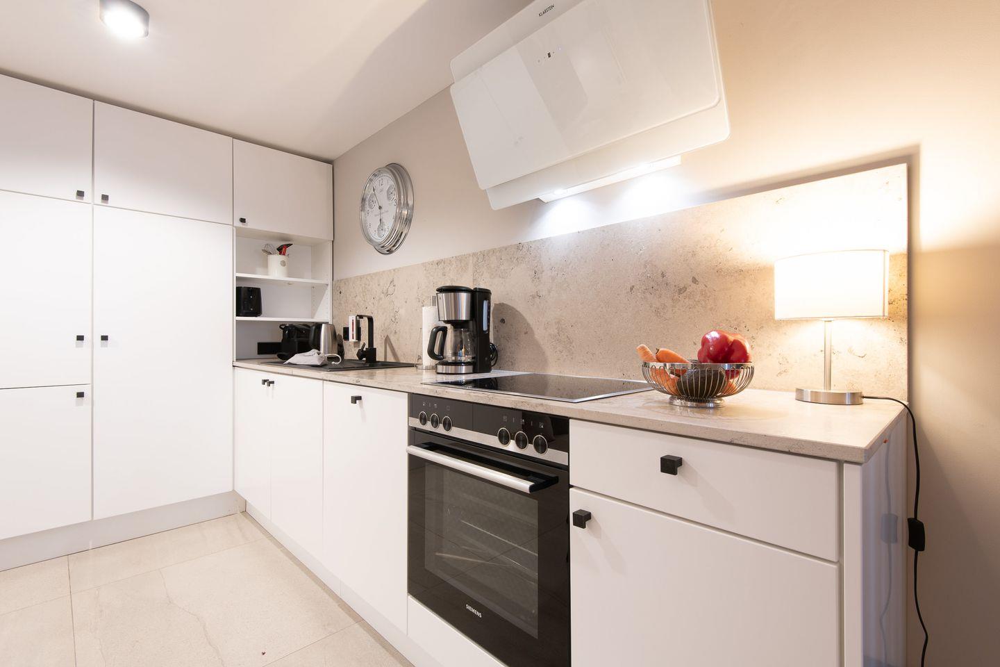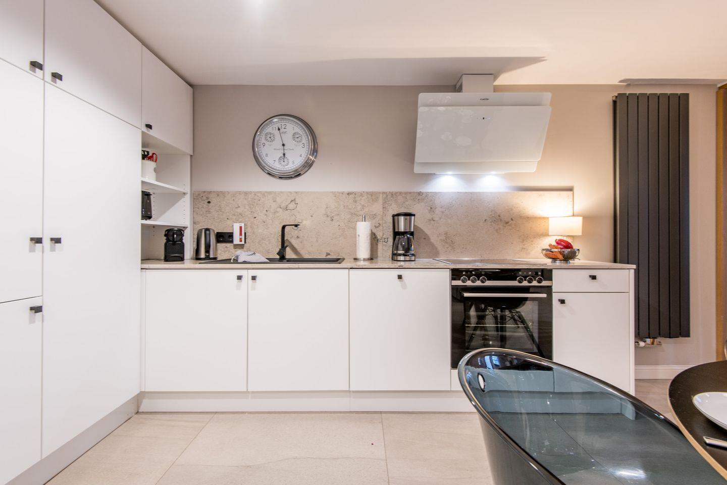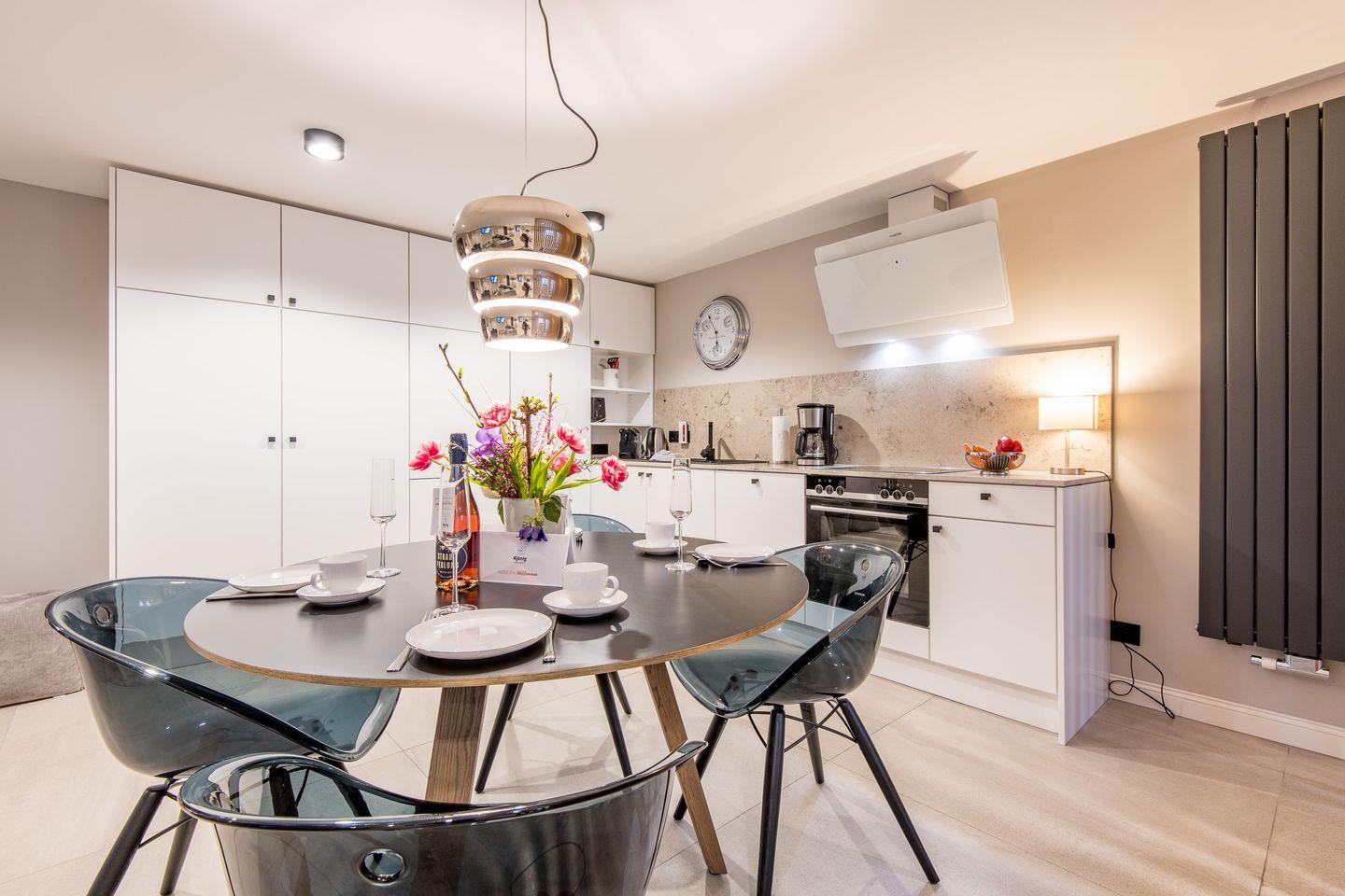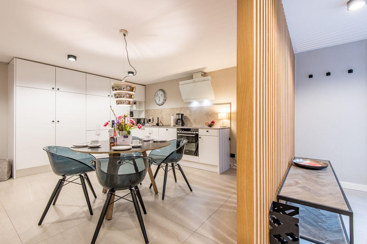 Die moderne, offene Küche ist bestens ausgestattet mit einem Backofen, Geschirrspüler, Filterkaffeemaschine und Nespresso-Maschine. Der angrenzende Essbereich bietet genügend Platz für gemeinsame Mahlzeiten und sorgt für ein geselliges Ambiente.