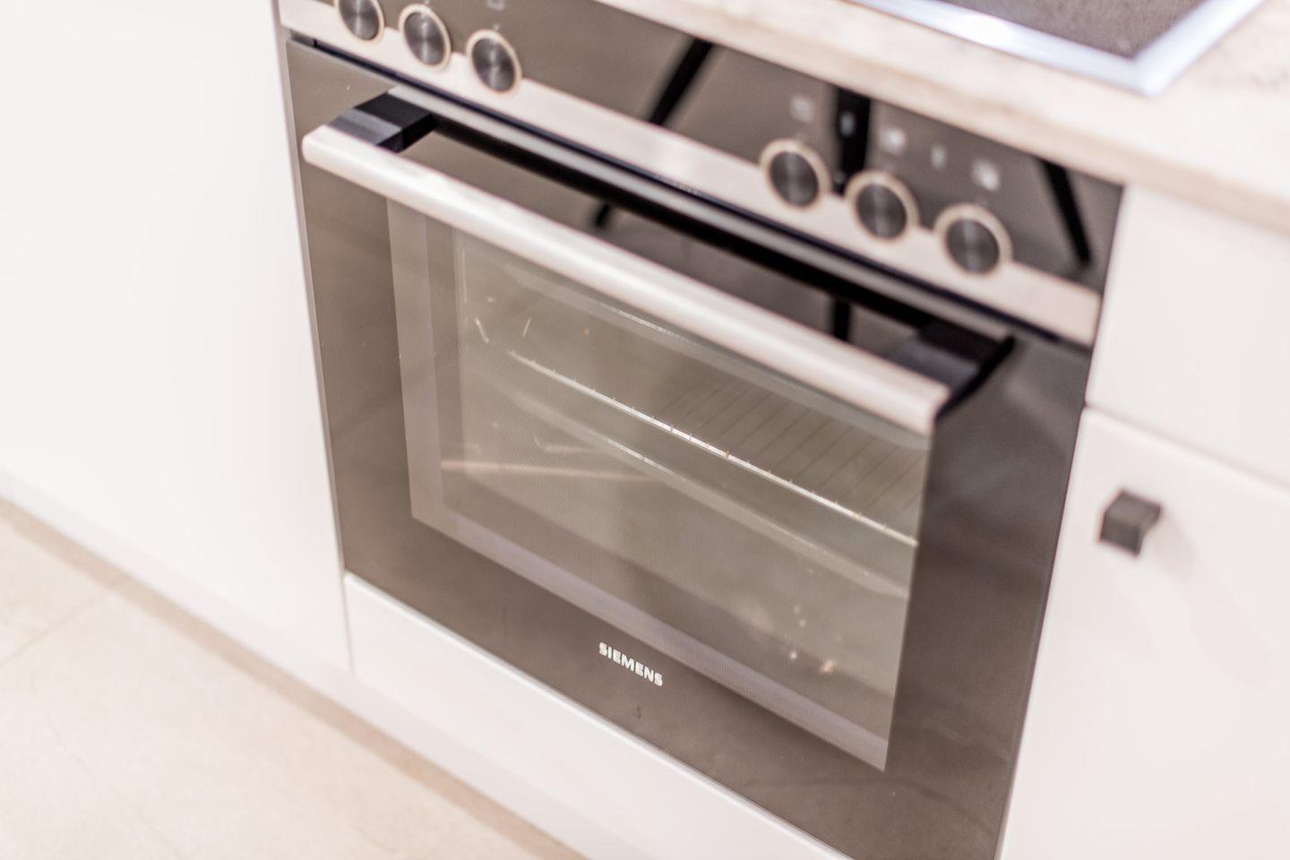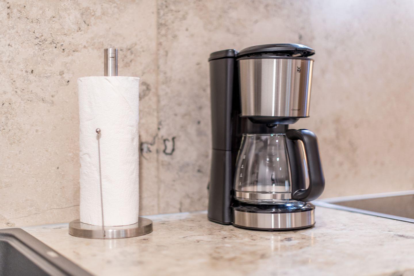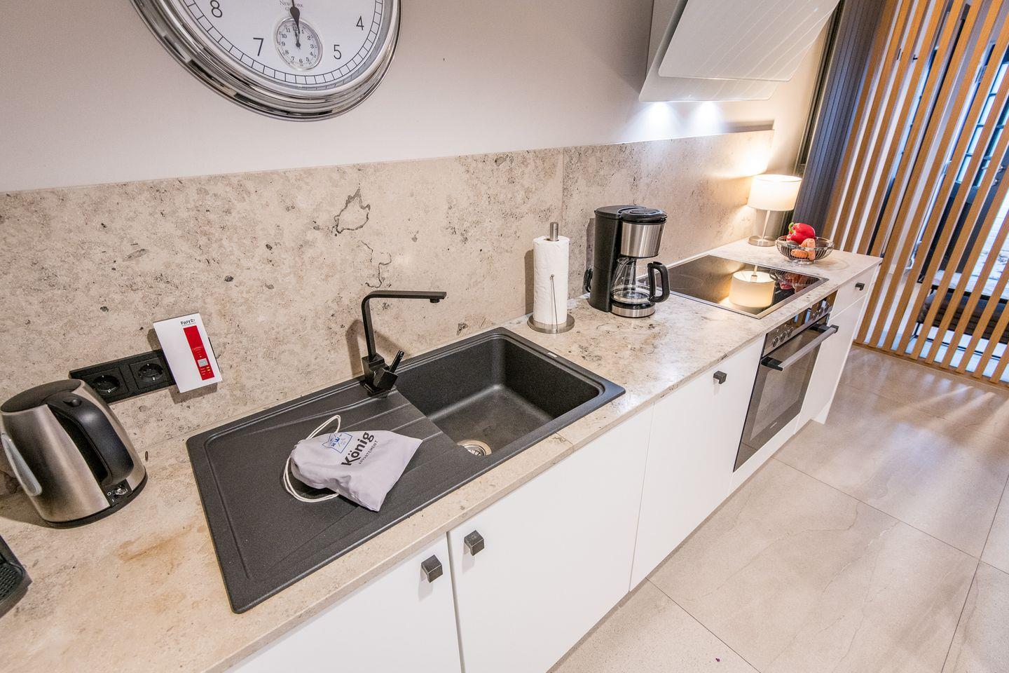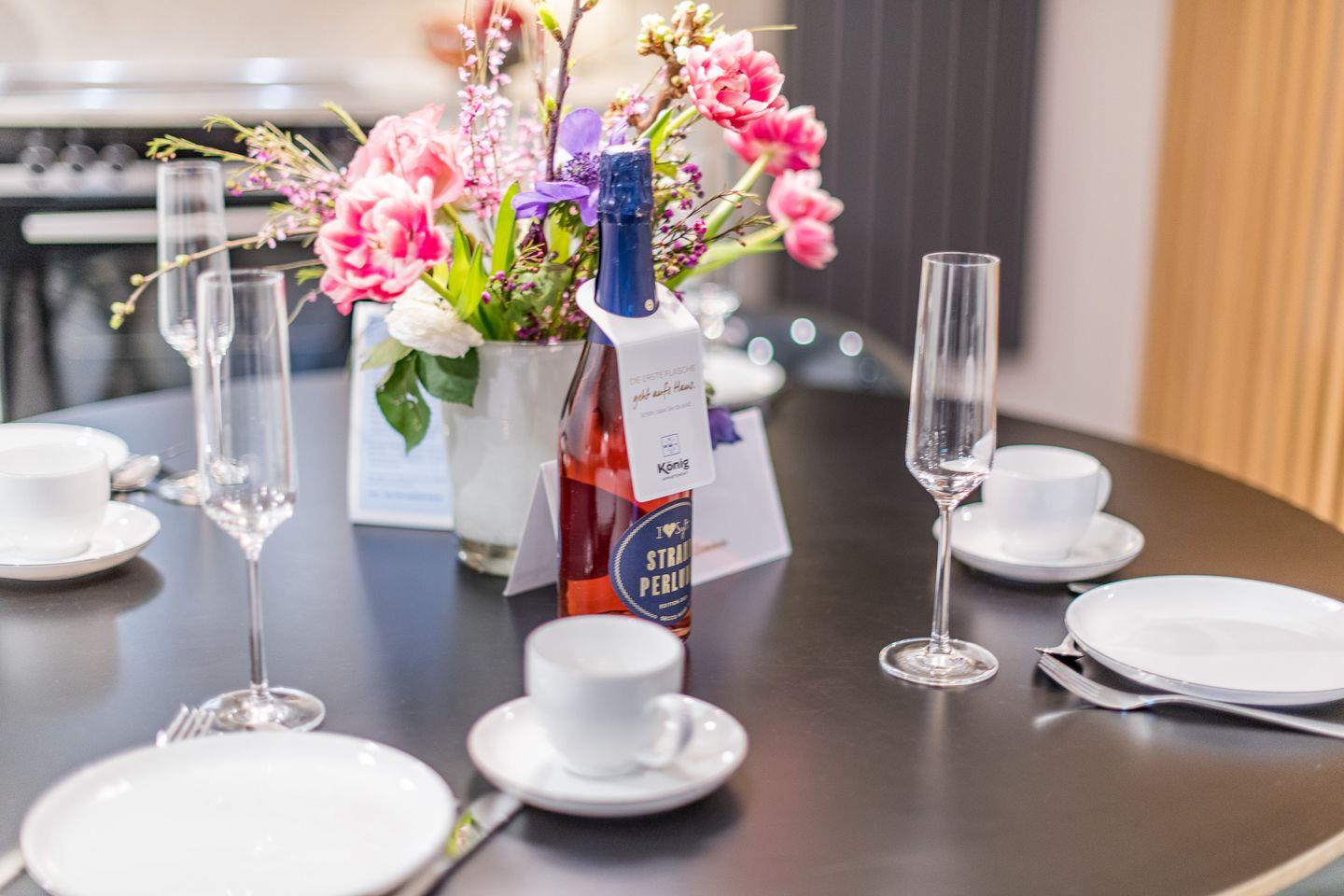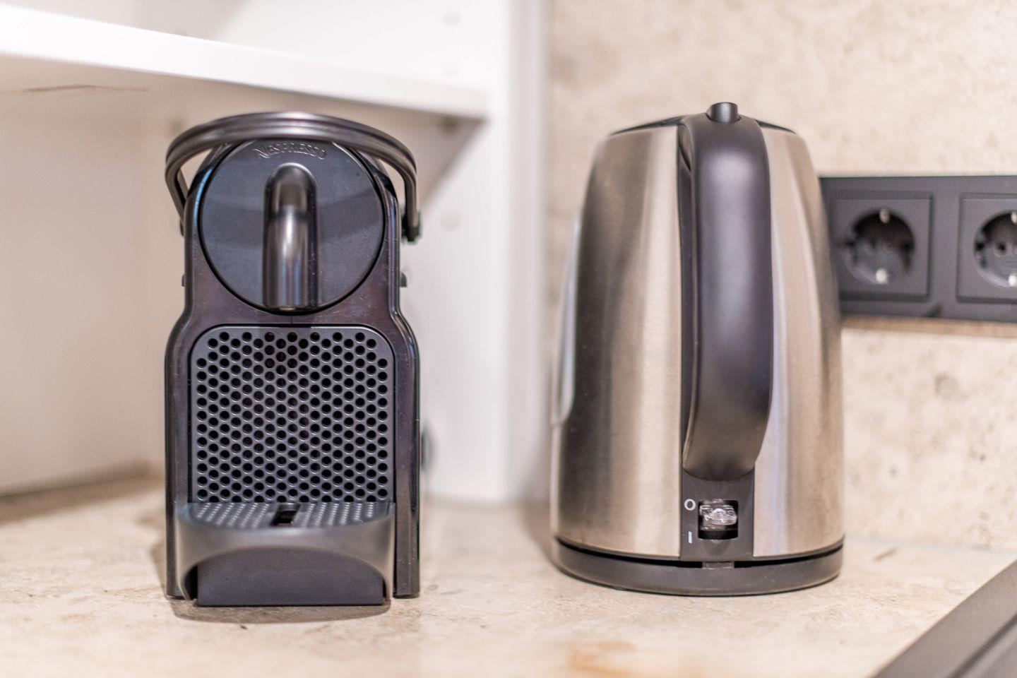 Die moderne, offene Küche ist bestens ausgestattet mit einem Backofen, Geschirrspüler, Filterkaffeemaschine und Nespresso-Maschine. Der angrenzende Essbereich bietet genügend Platz für gemeinsame Mahlzeiten und sorgt für ein geselliges Ambiente.