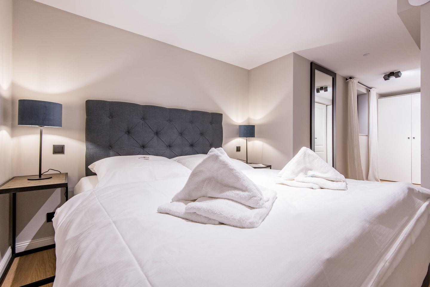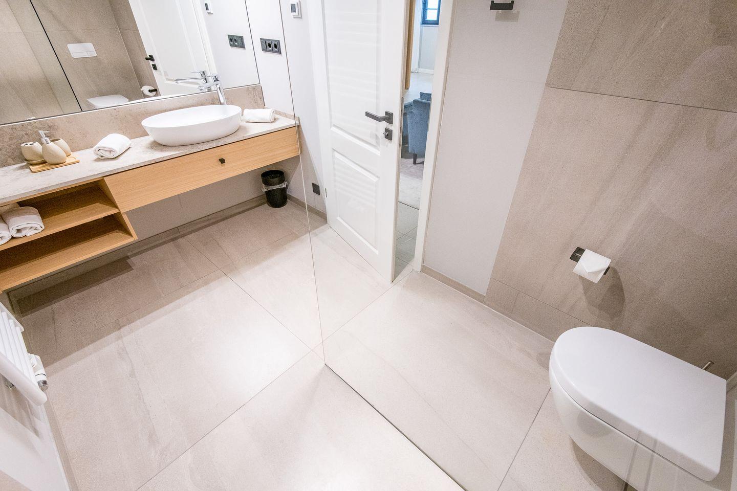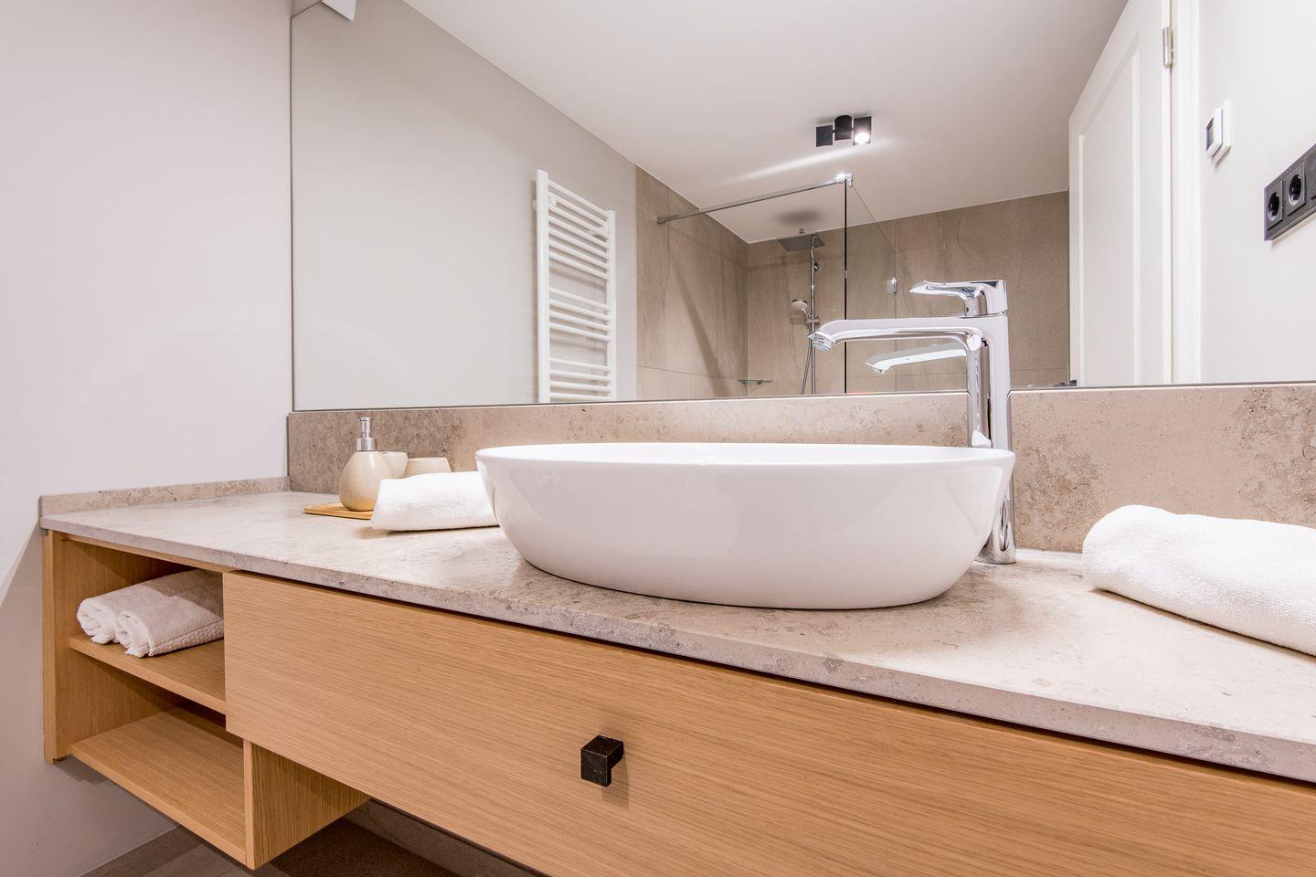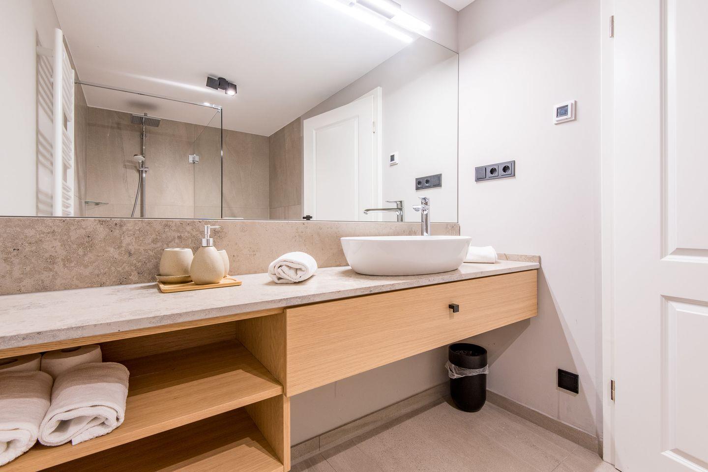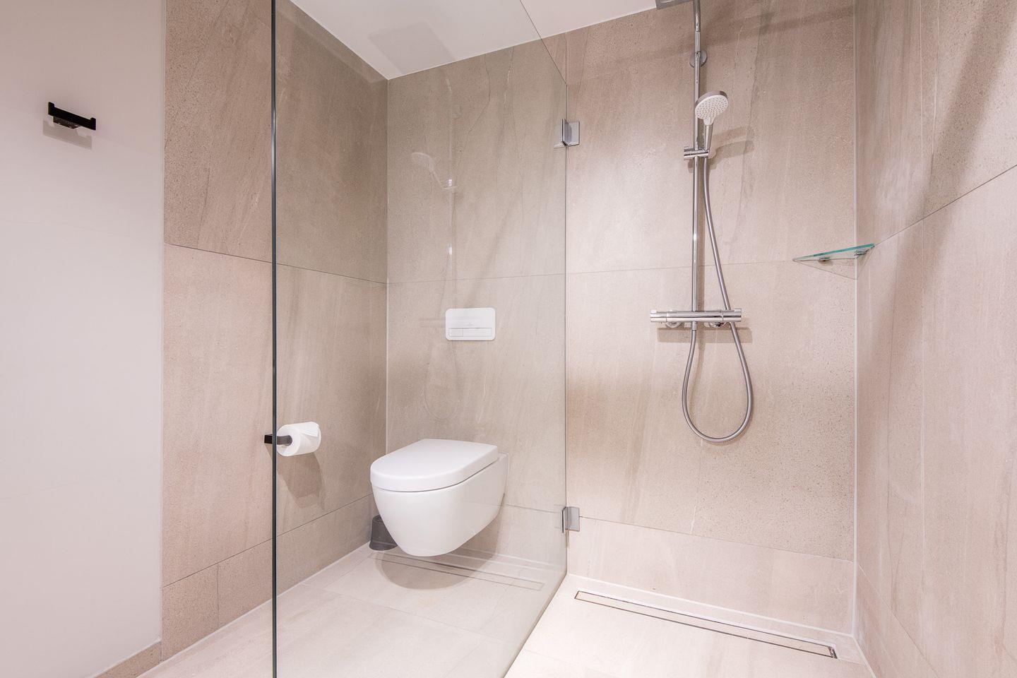 Das Badezimmer ist mit einer ebenerdigen Dusche, WC, Föhn und Handtuchwärmer ausgestattet und erfüllt höchste Komfortansprüche.
