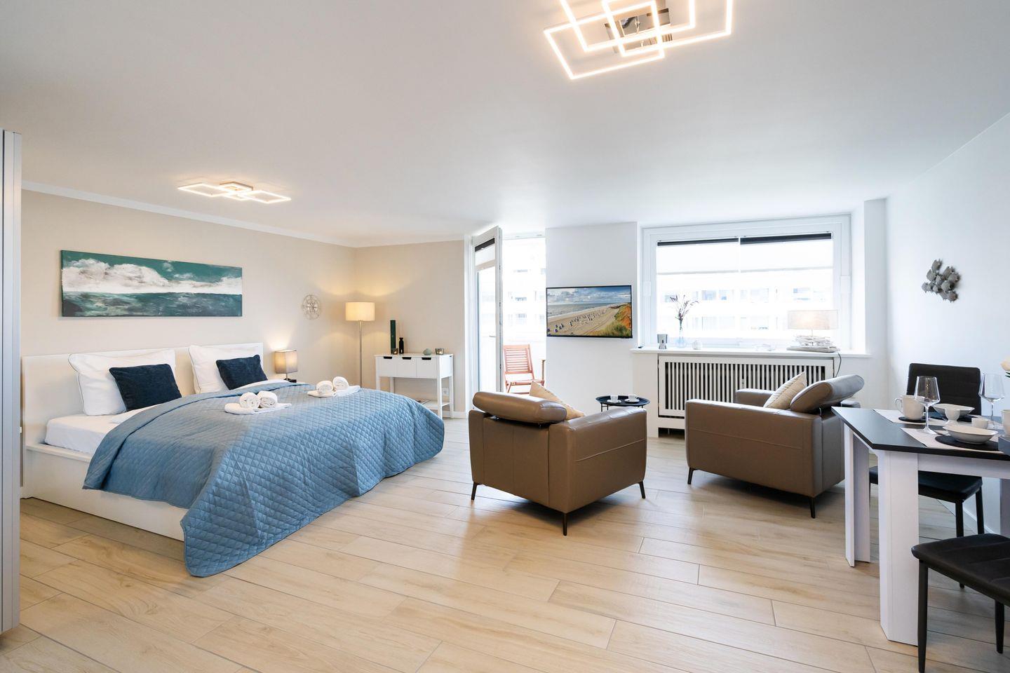 Dieses moderne Einzimmerappartement für bis zu 2 Personen befindet sich im 4. Stock und bietet Ihnen eine Kombination aus hochwertiger Ausstattung und höchstem Komfort. Die offene, moderne Küche samt Geschirrspüler und Waschtrockner ist voll ausgestattet. Der angrenzende Wohn- und Schlafbereich mit Doppelbett (180x200 cm) und Essecke lädt zur absoluten Entspannung ein. Im Badezimmer erwartet Sie eine großzügige Dusche. Nutzen Sie gerne den sonnigen Westbalkon samt Meerblick. Kostenloses WLAN, sowie ein Fahrstuhl sind vorhanden. Haustiere sind erlaubt.