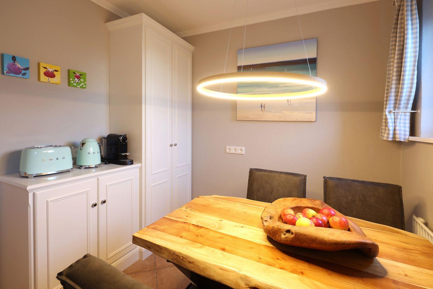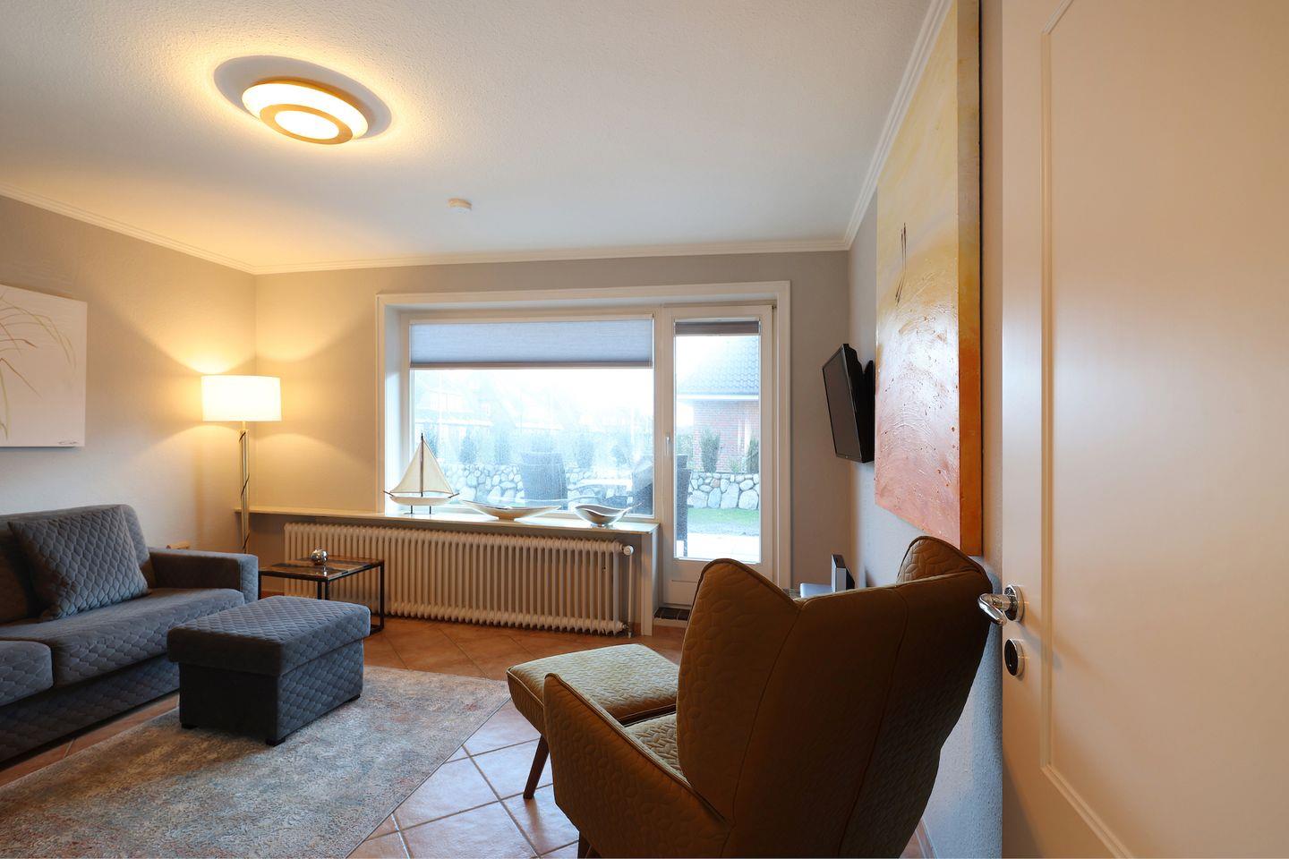 Die helle Erdgeschosswohnung ist ideal für 2-3 Personen und bietet eine separate Küche mit einer Esstischgruppe für 4 Personen, einem Cerankochfeld, Geschirrspüler sowie einem Mikrowellenbackofen. Vom Flur aus gelangt man ins Duschbad, in den Souterrain zum Schlafzimmer mit Flat TV und Einbauschränken. Im Wohnzimmer befindet sich eine bequeme Schlafcouch, Flat TV, Stereoanlage und DVD Player. Vom Wohnzimmer aus haben Sie Zugang zum sonnigen Terrasse, auf dem ein Strandkorb sowie Tisch und Stühle für Sie bereit stehen.