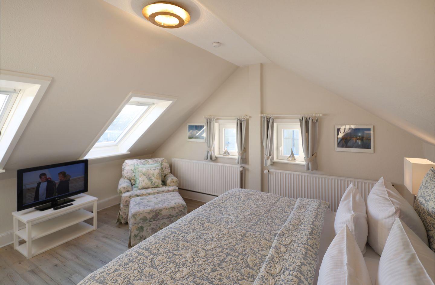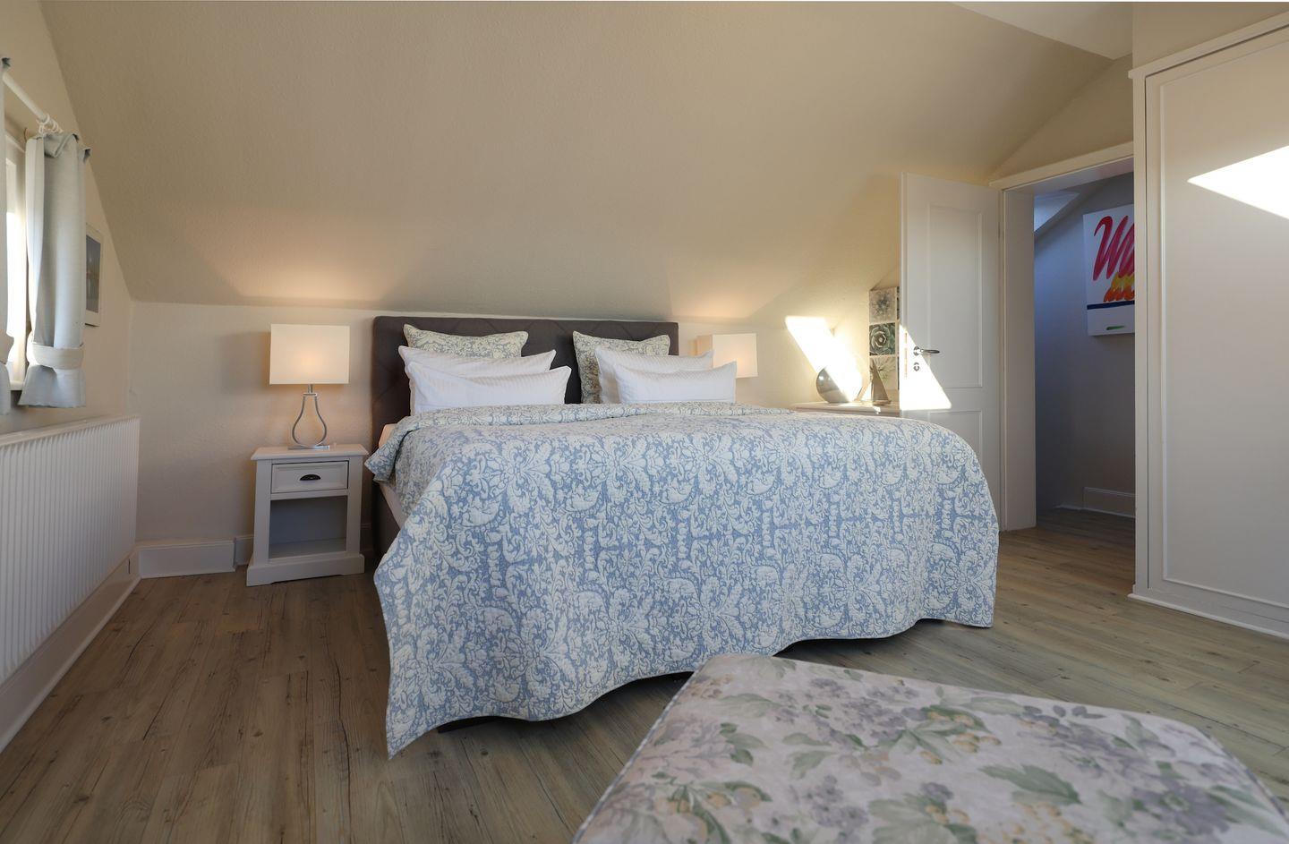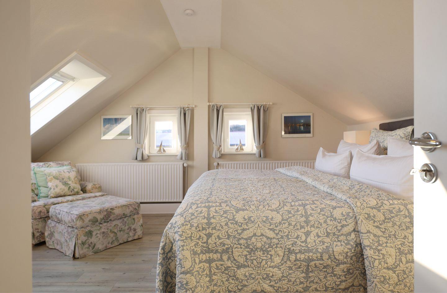 Im ersten Obergeschoss der Wohnung befinden sich zwei separate Alkoven-Schlafräume mit Einzelbett und hochwertigen Einbauschränken, die ausreichend Stauraum bieten. Im Dachgeschoss erwartet Sie das Hauptschlafzimmer mit Doppelbett und genügend Stauraum. Bei geöffnetem Fenster können Sie hier das beruhigende Meeresrauschen hören.