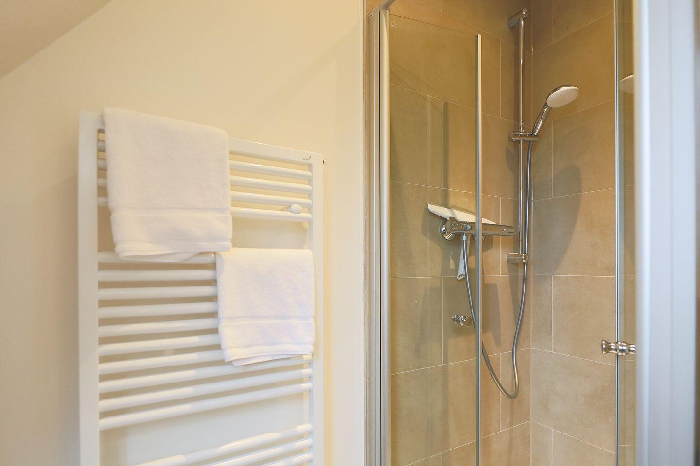 Der Blick aus dem Fenster geht hin bis zum Rantumer Wattenmeer und auch der Blick ins Innere des Studio-Appartements lohnt sich. Küche, Ess- und Schlafbereich gehen fließend ineinander über, aber das fällt bei der klugen Raumaufteilung kaum auf. Und so macht es sich das bequeme Doppelbett neben dem hohen Esstisch gemütlich, während die große Küchenzeile sich in die Ecke kuschelt. Alles ist im cleanen Skandi-Look gehalten und wirkt trotzdem gemütlich. Passend dazu präsentiert sich auch das Duschbad in einem modernen Beige-Weiß Look und mit einem großen Fenster.