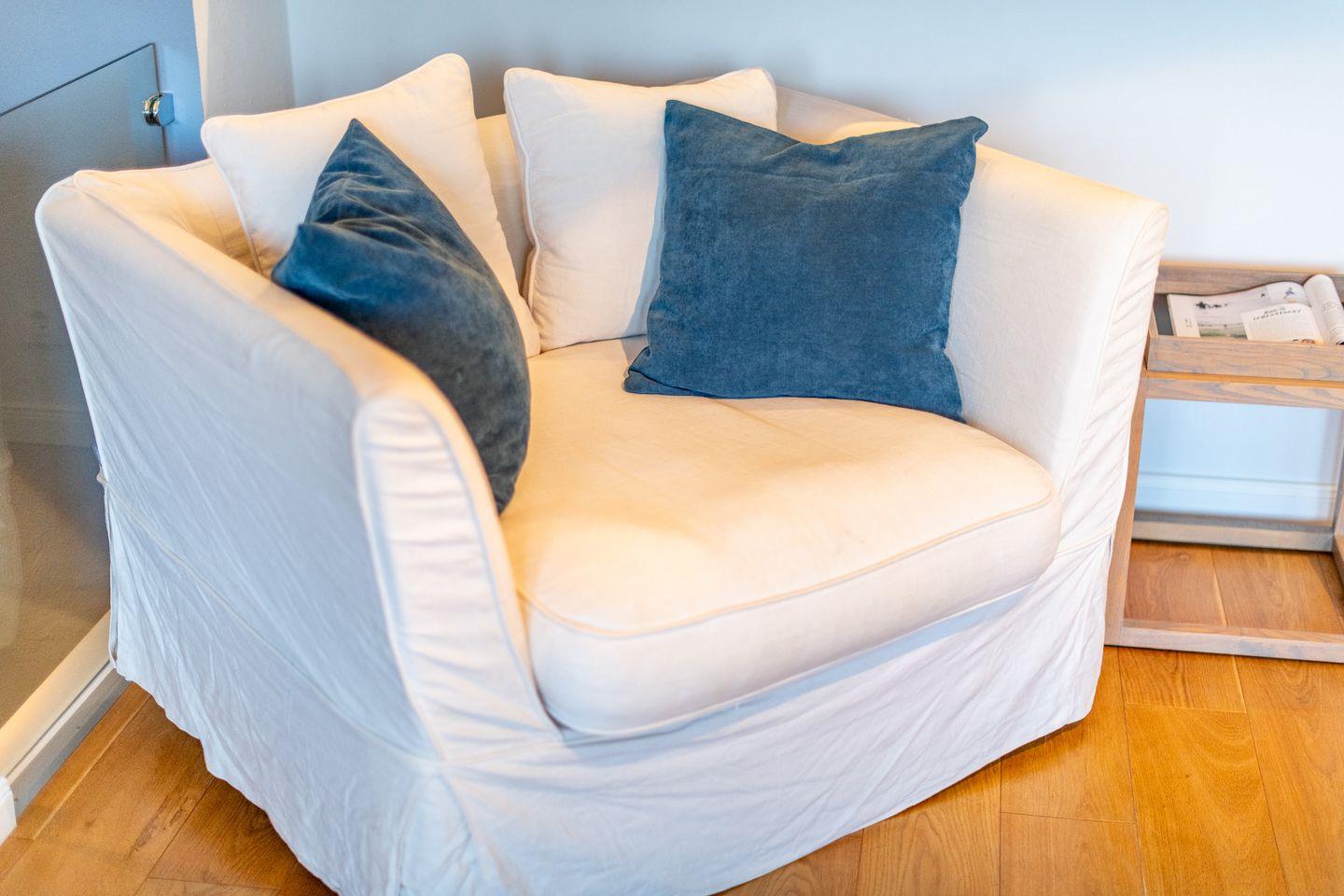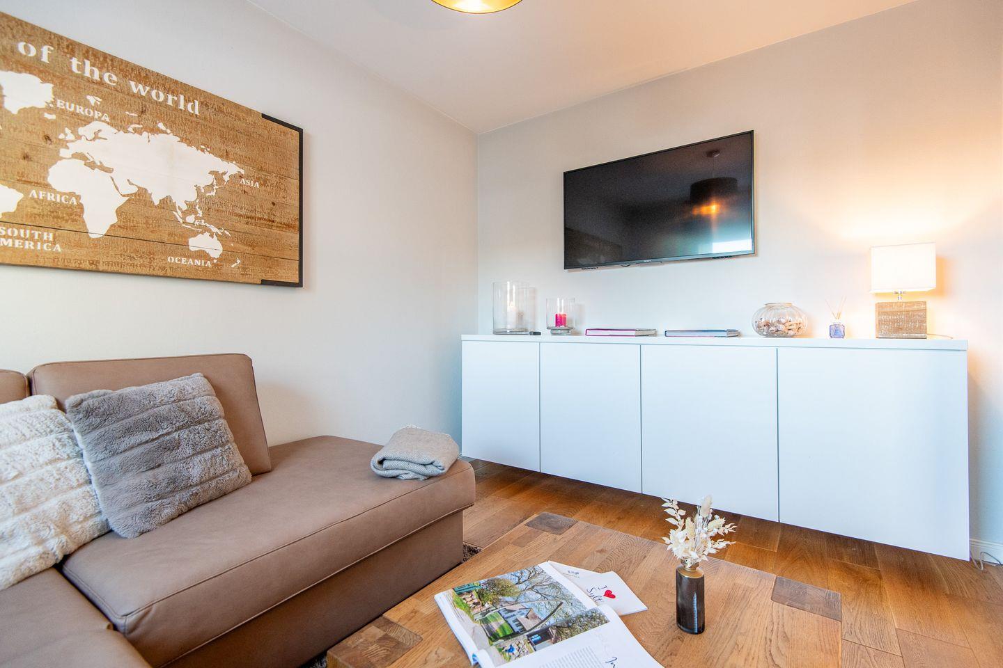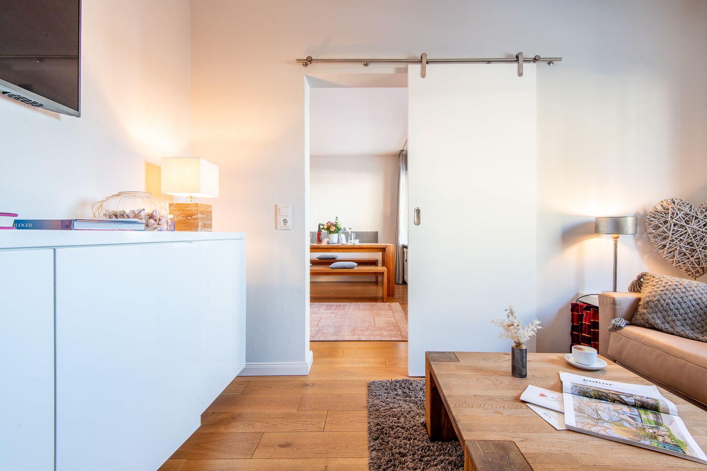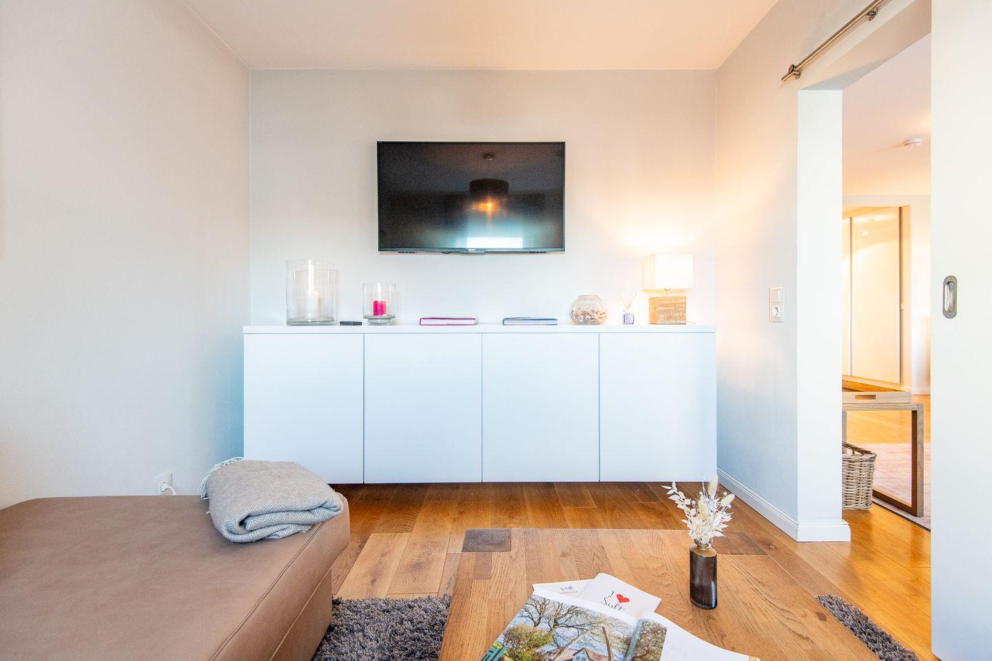 Im lichtdurchfluteten Wohnzimmer erwartet Sie ein gemütliches Sofa, das auch als Schlafmöglichkeit dient, sowie ein moderner Smart-TV für entspannte Abende. Von hier aus gelangen Sie direkt auf den möblierten Balkon, der besonders am Morgen ein idealer Ort für ein Frühstück im Sonnenschein ist.
