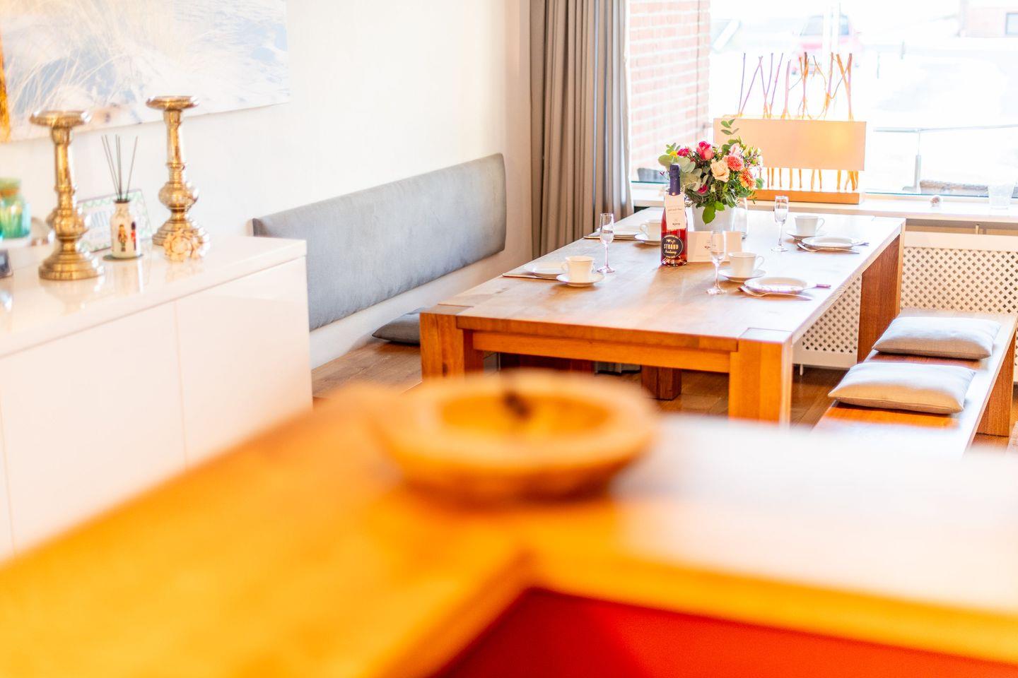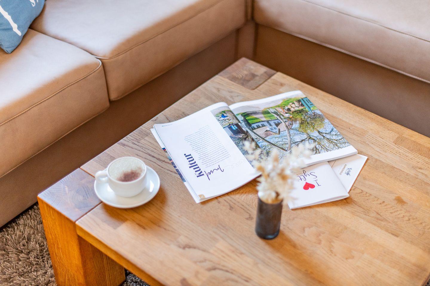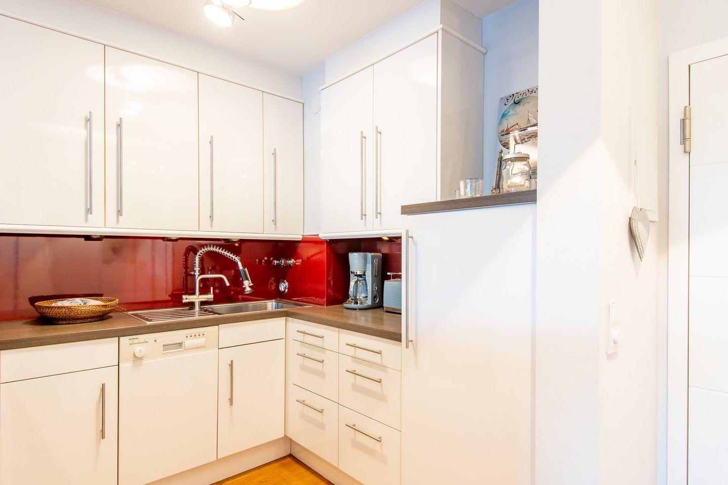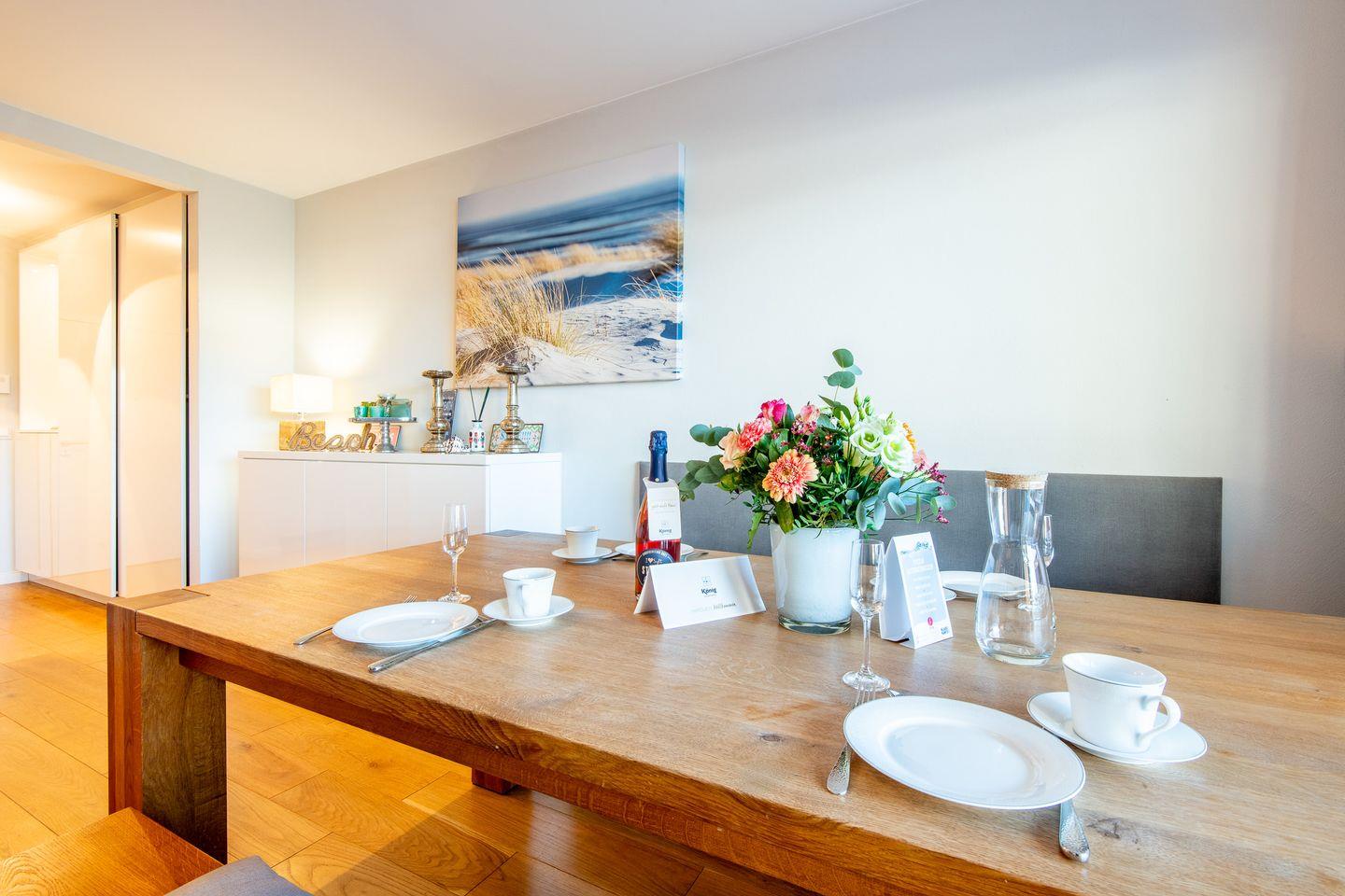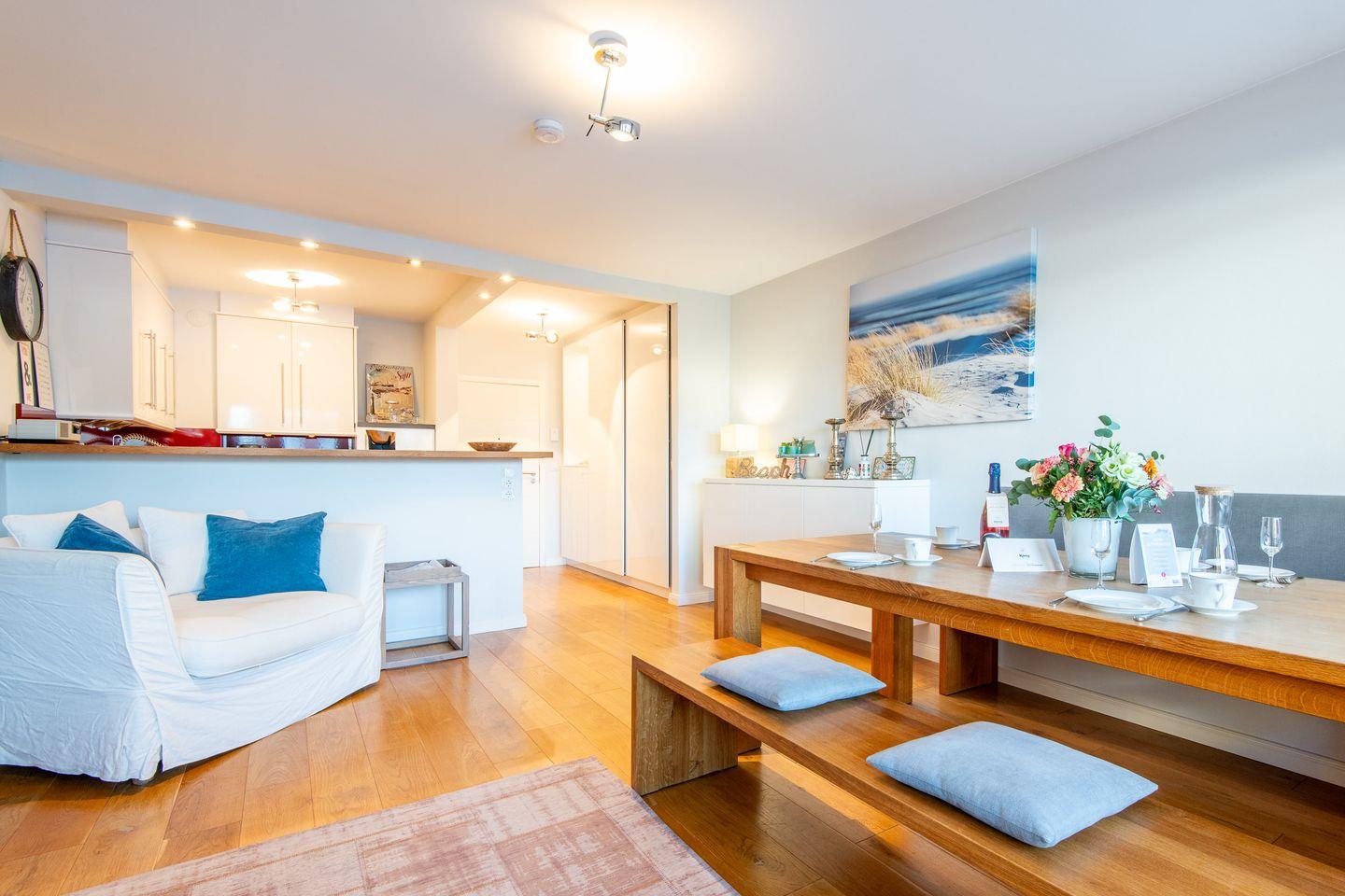 Die helle, offen gestaltete Küche ist modern ausgestattet und bietet alles, was Sie für eine gelungene Mahlzeit benötigen, inklusive einer Filterkaffeemaschine und Espressomaschine. Der angrenzende große Esstisch ist ideal für gemeinsame Mahlzeiten und gesellige Stunden.