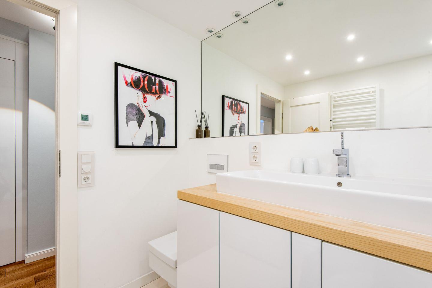 Das helle Badezimmer verfügt über eine Dusche, WC und einen Handtuchwärmer und bietet Ihnen nach einem erlebnisreichen Tag auf der Insel den Komfort, den Sie sich wünschen.