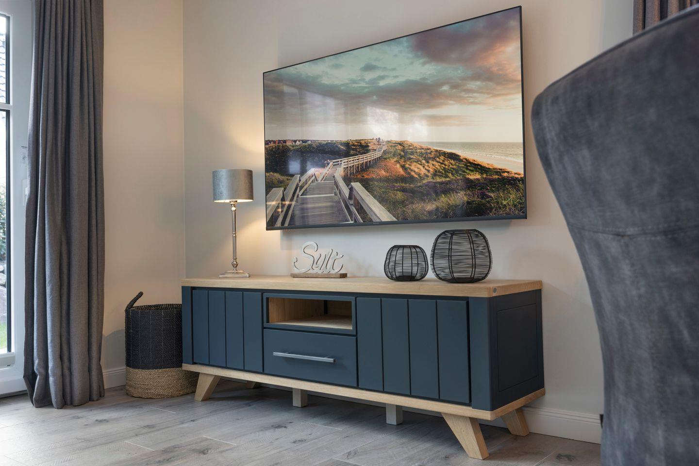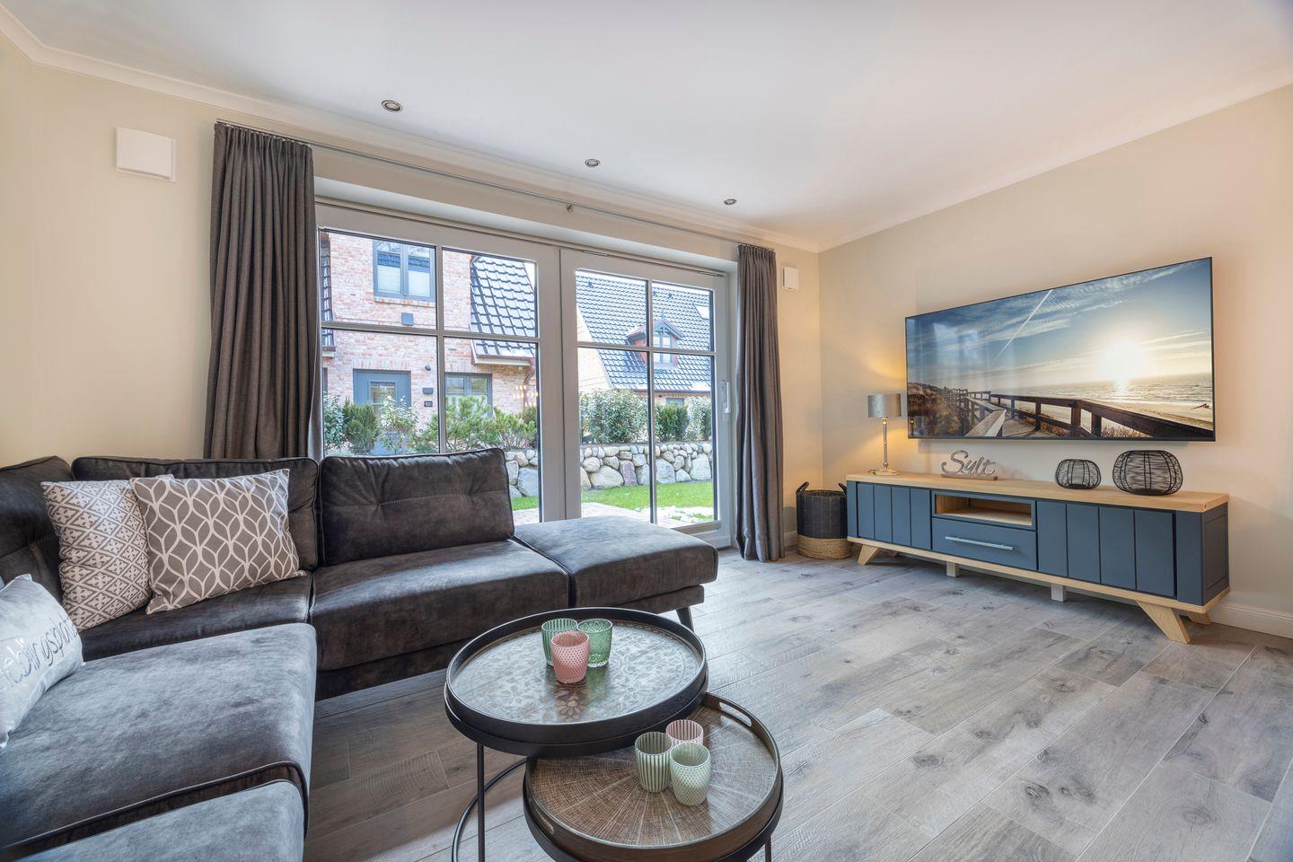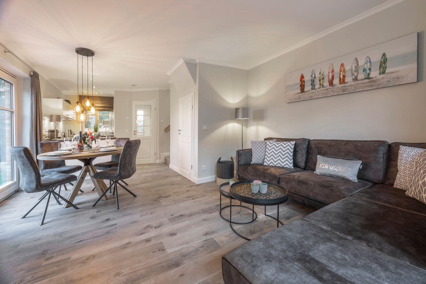 Das einladende Wohnzimmer ist mit einer komfortablen Sofaecke, einem großen Esstisch für 4 Personen und einem TV ausgestattet. Von hier aus haben Sie direkten Zugang zur möblierten Gartenterrasse, die nach Süden und Westen ausgerichtet ist und zu entspannten Stunden im Freien einlädt.
