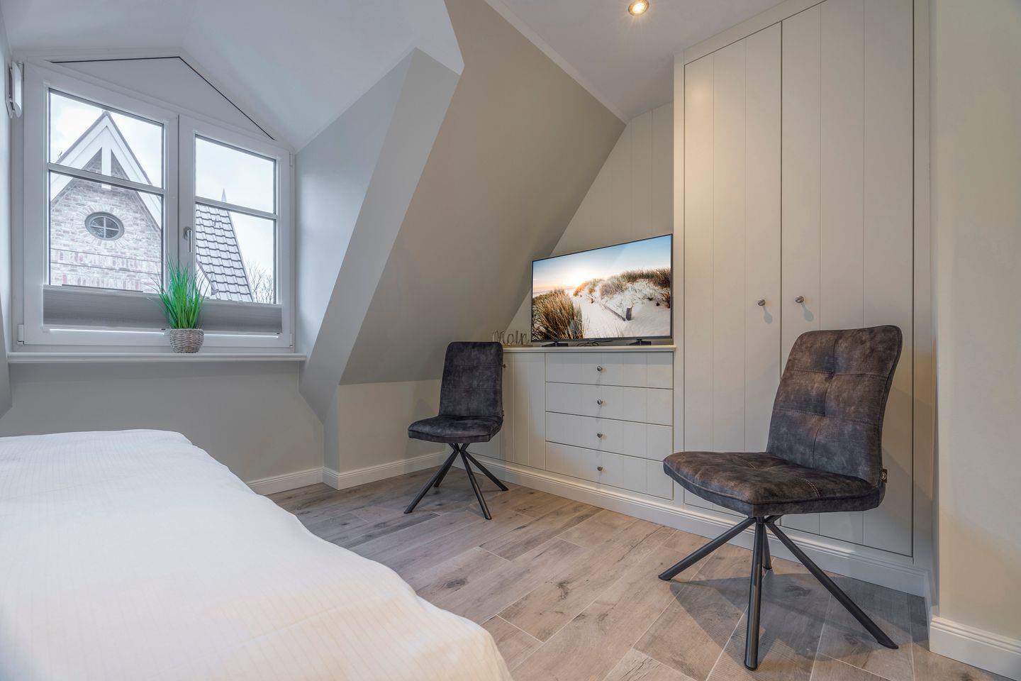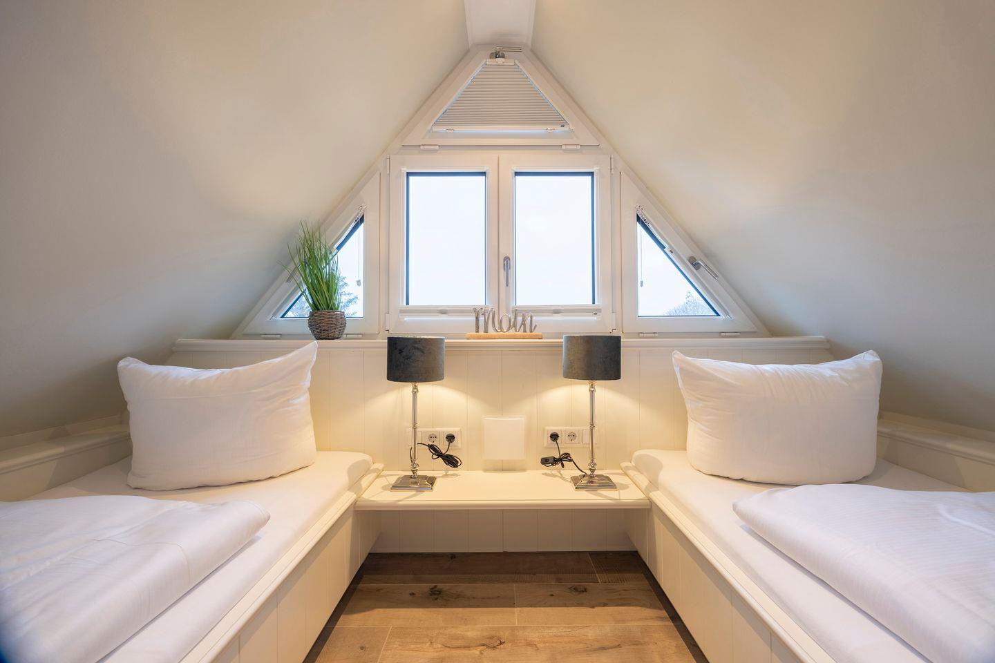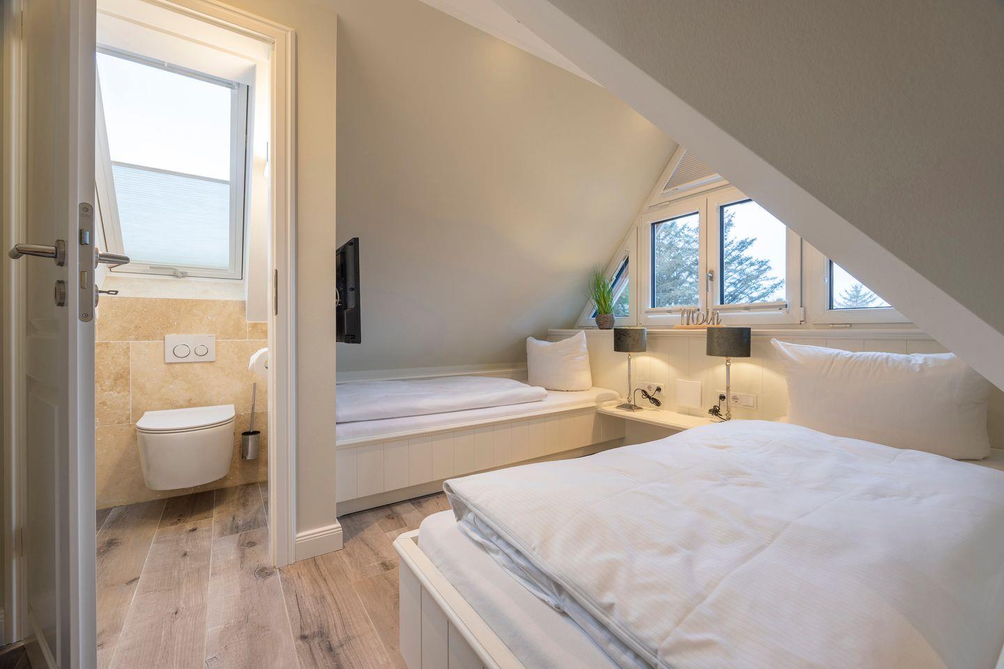 Im Obergeschoss finden Sie das erste Schlafzimmer mit Doppelbett (2x 90x200 cm), Kleiderschrank und TV. Dieses Schlafzimmer verfügt über ein eigenes en suite Badezimmer. Das zweite Schlafzimmer im Dachgeschoss ist mit zwei Einzelbetten (je 90x200 cm), einem Einbauschrank und einem TV ausgestattet und verfügt ebenfalls über ein eigenes WC mit kleinem Waschbecken.