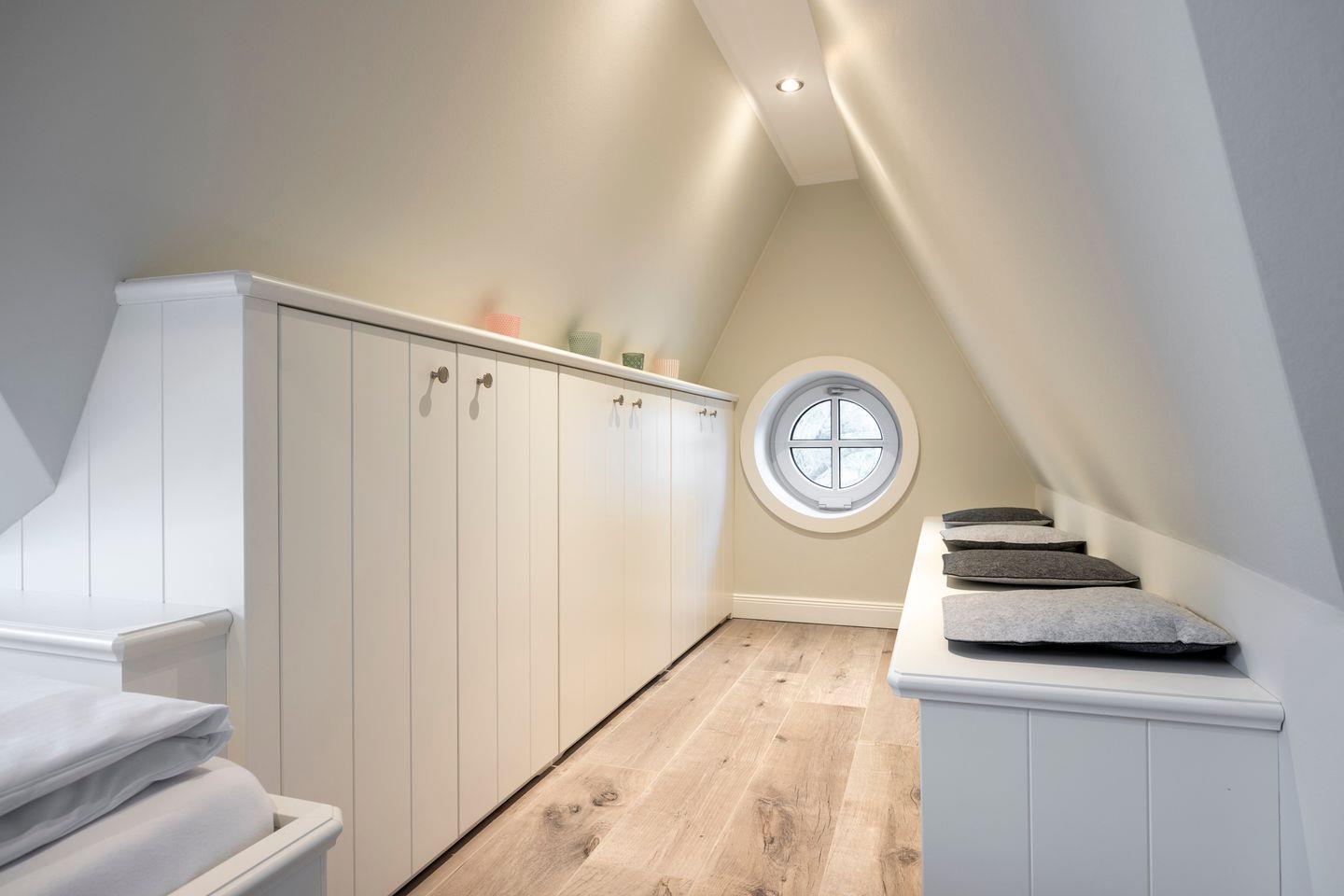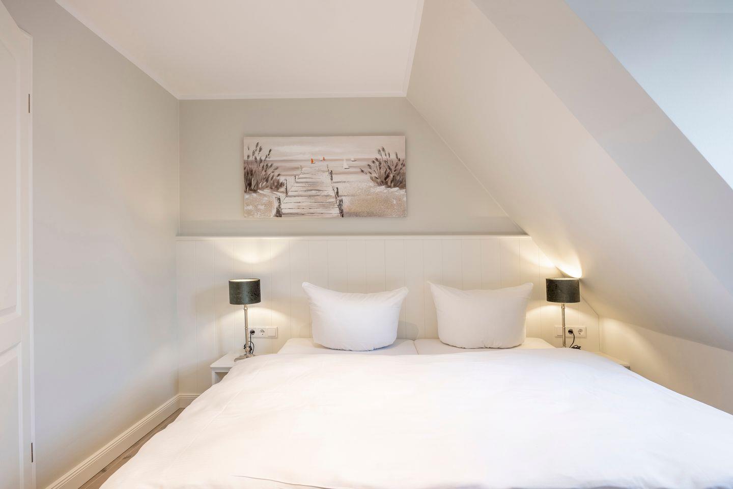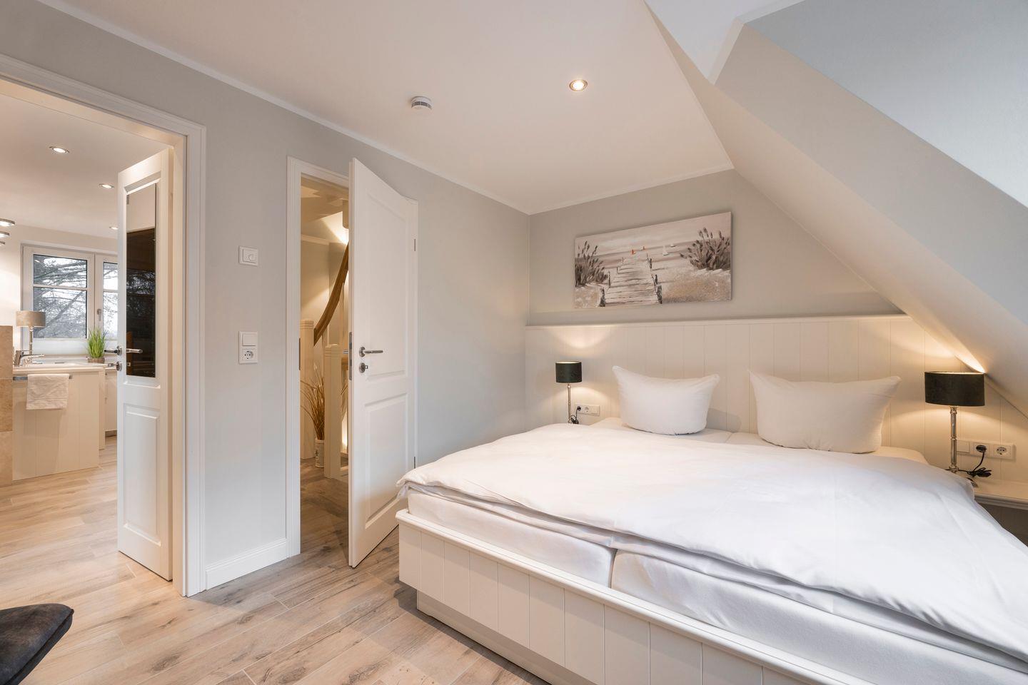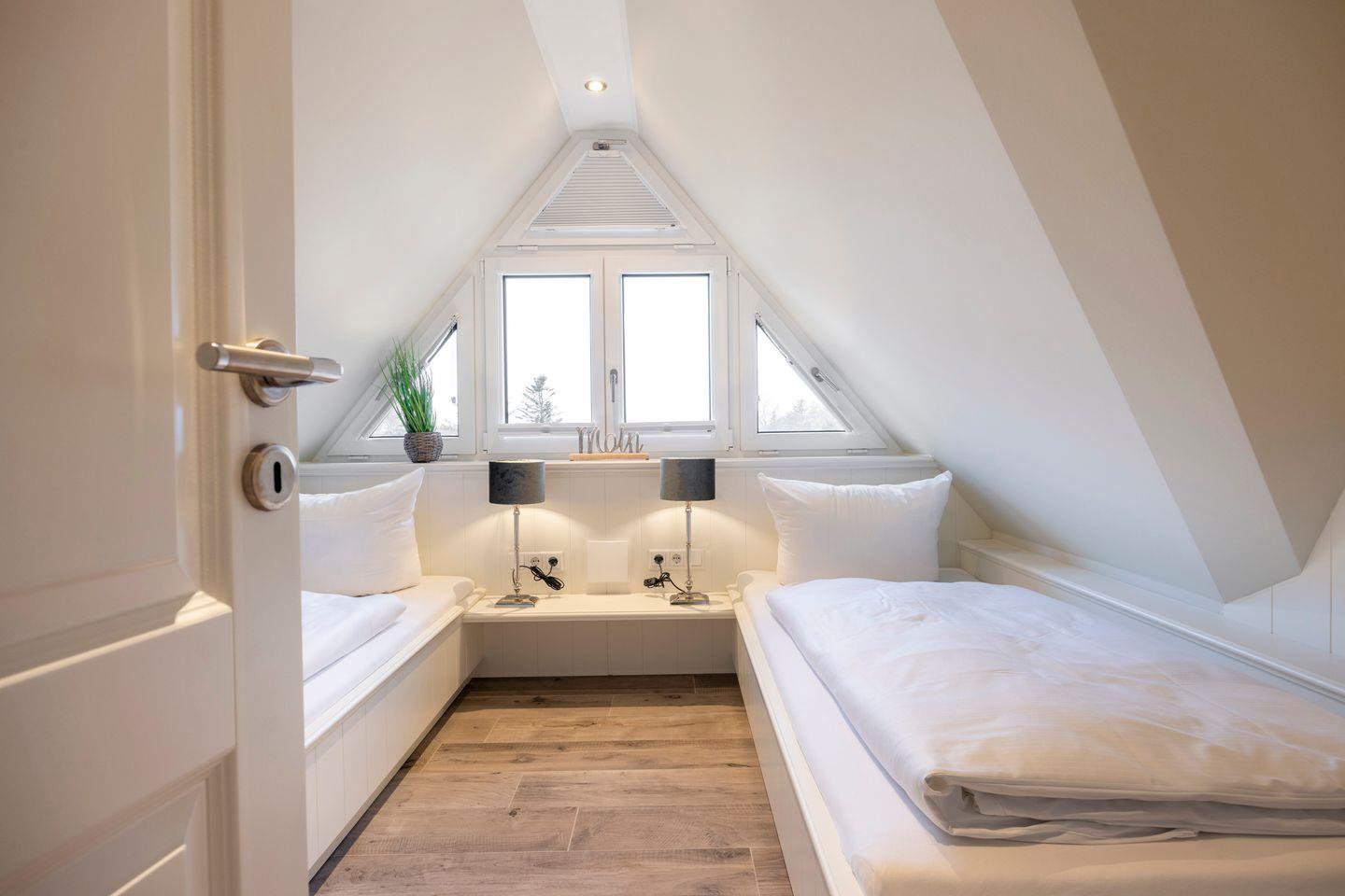 Im Obergeschoss finden Sie das erste Schlafzimmer mit Doppelbett (2x 90x200 cm), Kleiderschrank und TV. Dieses Schlafzimmer verfügt über ein eigenes en suite Badezimmer. Das zweite Schlafzimmer im Dachgeschoss ist mit zwei Einzelbetten (je 90x200 cm), einem Einbauschrank und einem TV ausgestattet und verfügt ebenfalls über ein eigenes WC mit kleinem Waschbecken.