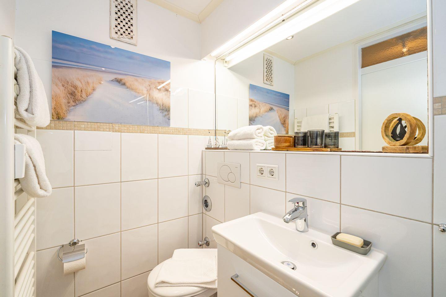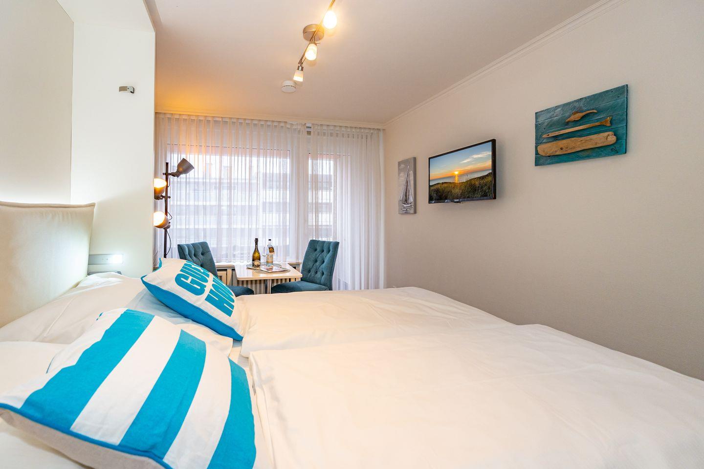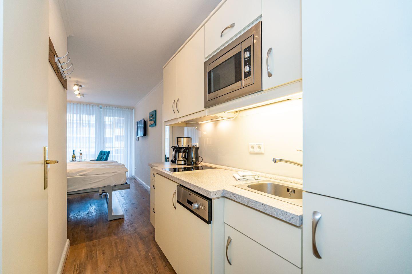 Am Ende der Westerländer Fußgängerzone, wenige Schritte bis zur Promenade und dem Hauptstrand erwartet Sie, erreichbar mit dem Aufzug, dieses moderne ca. 23 qm große 1 Zimmer Apartment im 1.Stock im "Haus am Meer". Wohn/Schlafraum mit raffinierter Sofa-Schrankbettkombination. Von hier aus kann man gemütlich bei einem Buch oder einer Serie vor dem Smart TV den Tag ausklingen lassen. In der Küchenzeile mit Mikrowelle, Herd, Kühlschrank und Geschirrspüler lassen sich kleine Köstlichkeiten zaubern. Auf dem Ostbalkon lassen sich morgens bei einem Espresso die frühen Sonnenstrahlen genießen. Des weiteren verfügt das Apartment über ein Duschbad mit WC und Handtuchtrockner. Im Kellergeschoss befinden sich Waschmaschine und Trockner zur Gemeinschaftsnutzung.