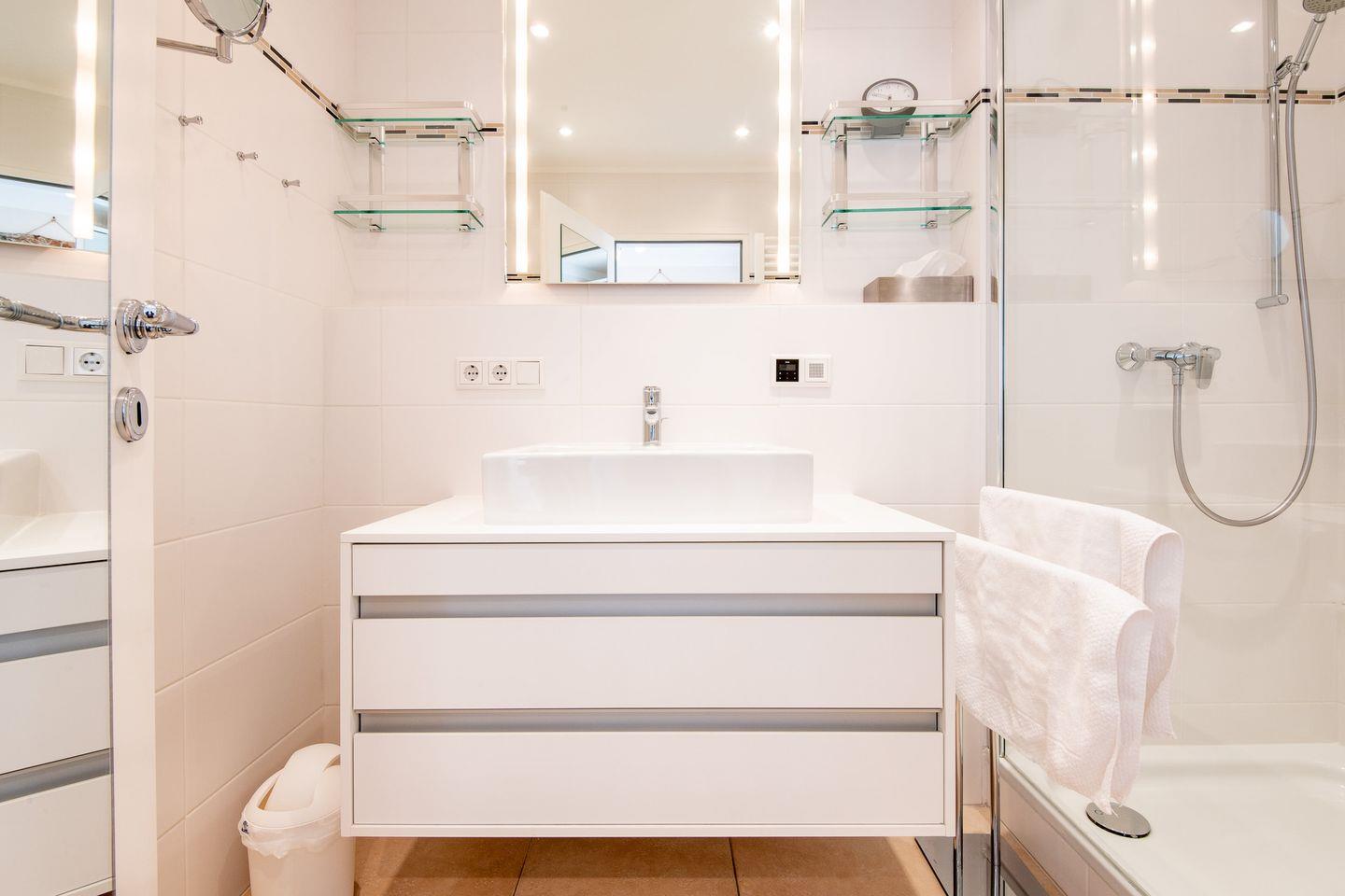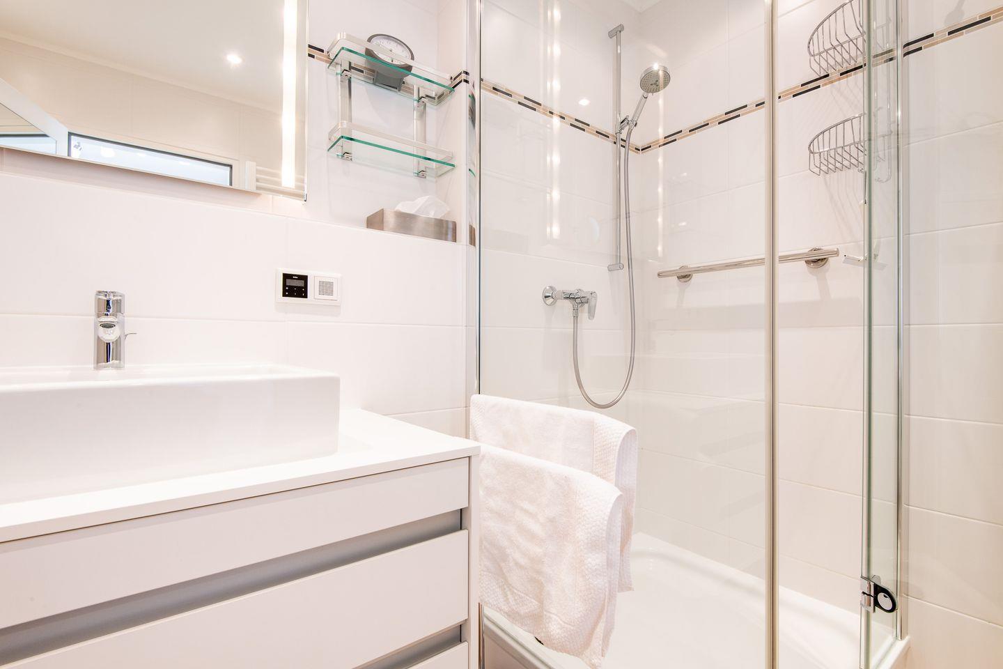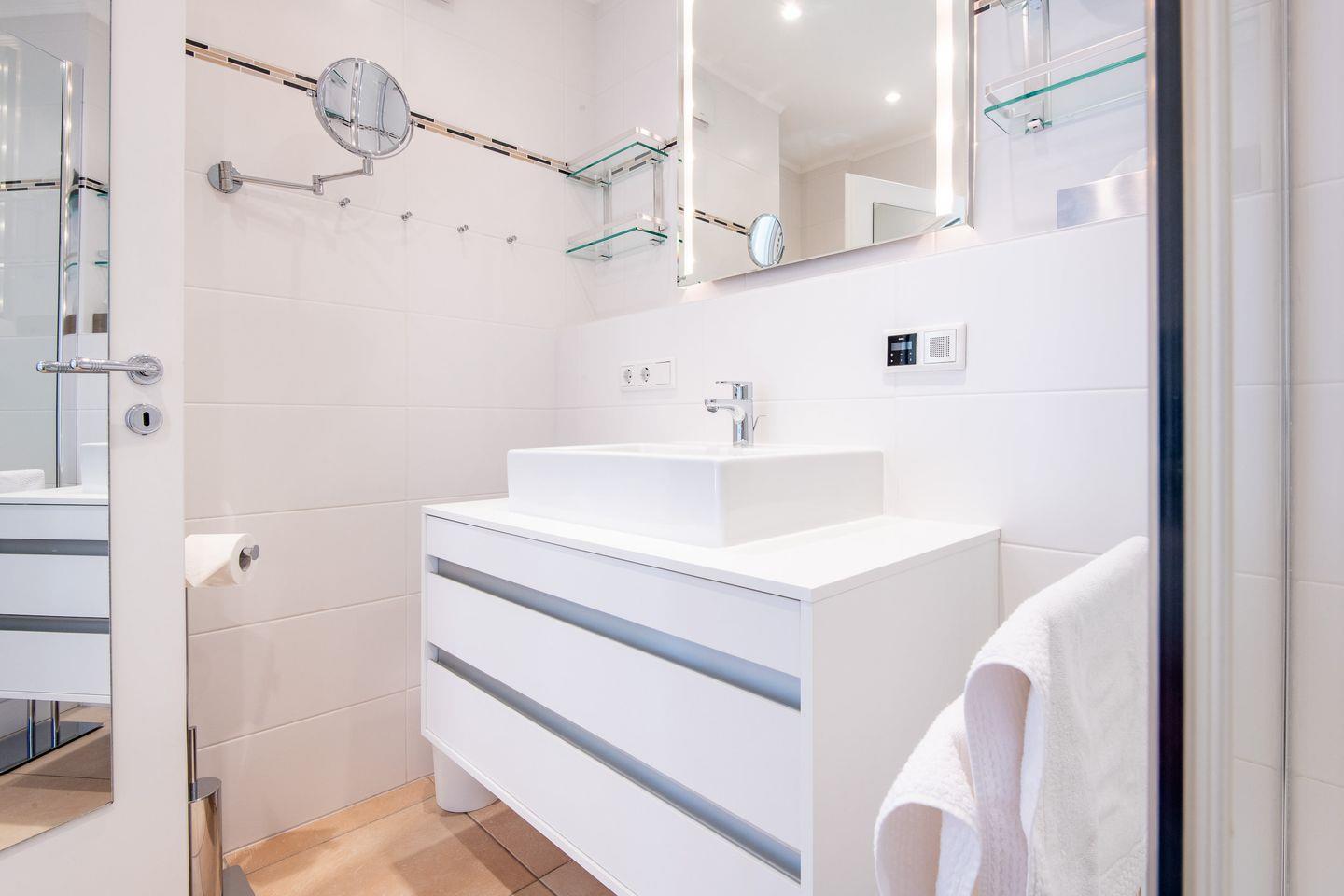 Das Badezimmer ist modern gestaltet und mit einer Dusche, WC, Handtuchwärmer und Föhn ausgestattet, was den Komfort für die Gäste abrundet. Für längere Aufenthalte stehen im Haus eine gemeinschaftliche Waschmaschine und ein Trockner gegen Gebühr zur Verfügung.