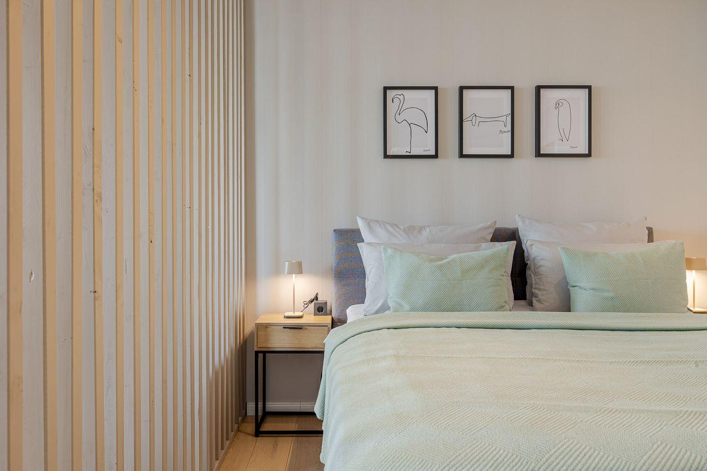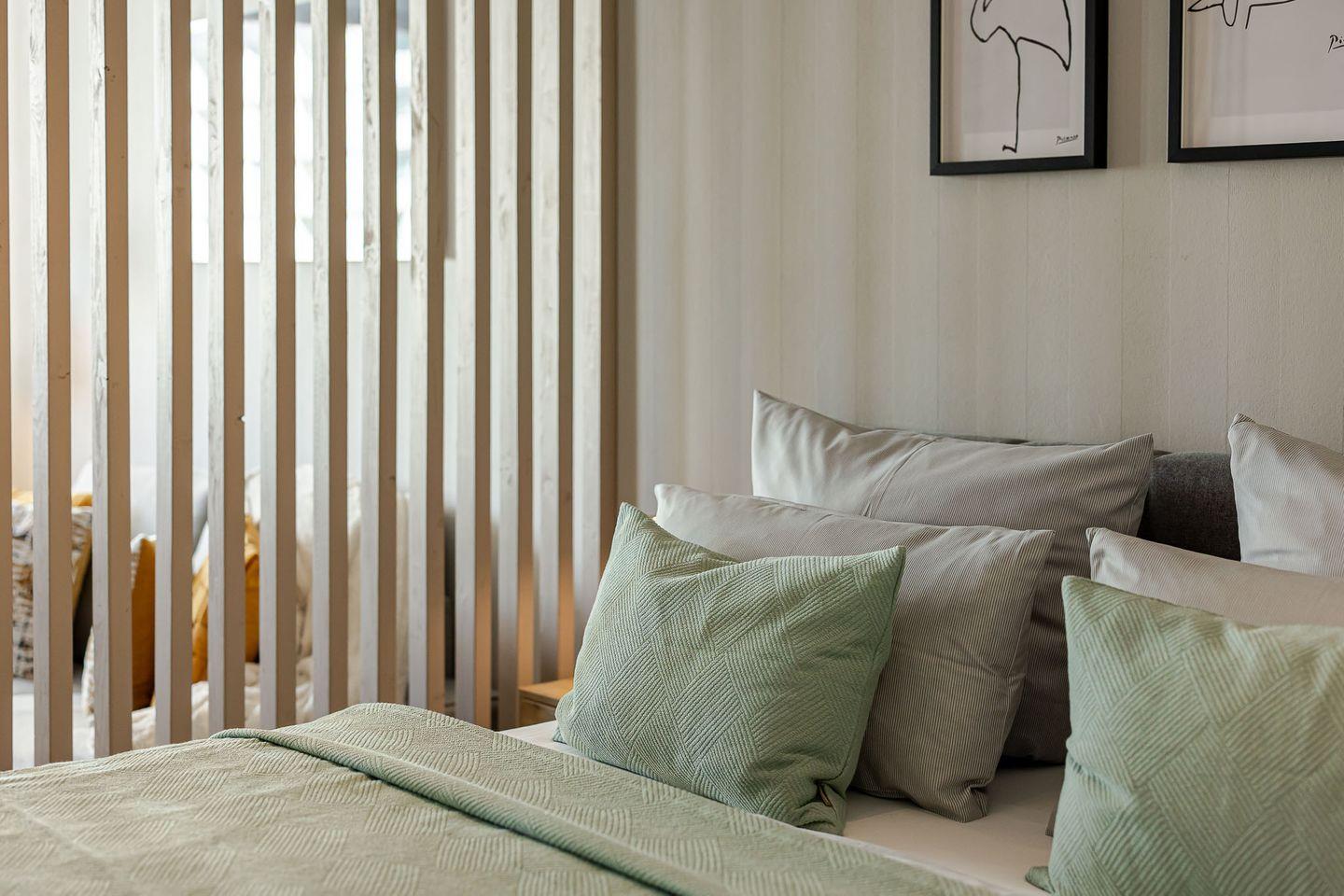 Durch eine stilvolle Lamellenwand sind Wohn- und Schlafbereich sanft voneinander getrennt – ein elegantes Detail, das Ruhe und Offenheit zugleich schafft. Das hochwertige Boxspringbett lädt zum Ausschlafen ein, während das gemütliche Sofa zum Verweilen bei einem guten Buch oder einem Filmabend einlädt.