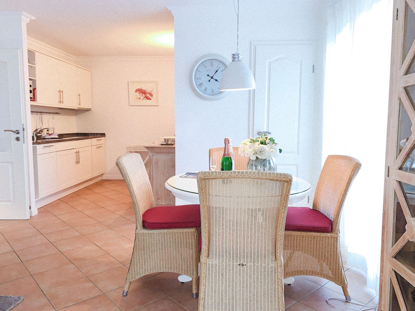 Vom Vorflur gelangen Sie in das Wohnzimmer, mit Sofa und Sessel, Esstisch mit Stühle und eine offennen gut ausgestatteten Küche.