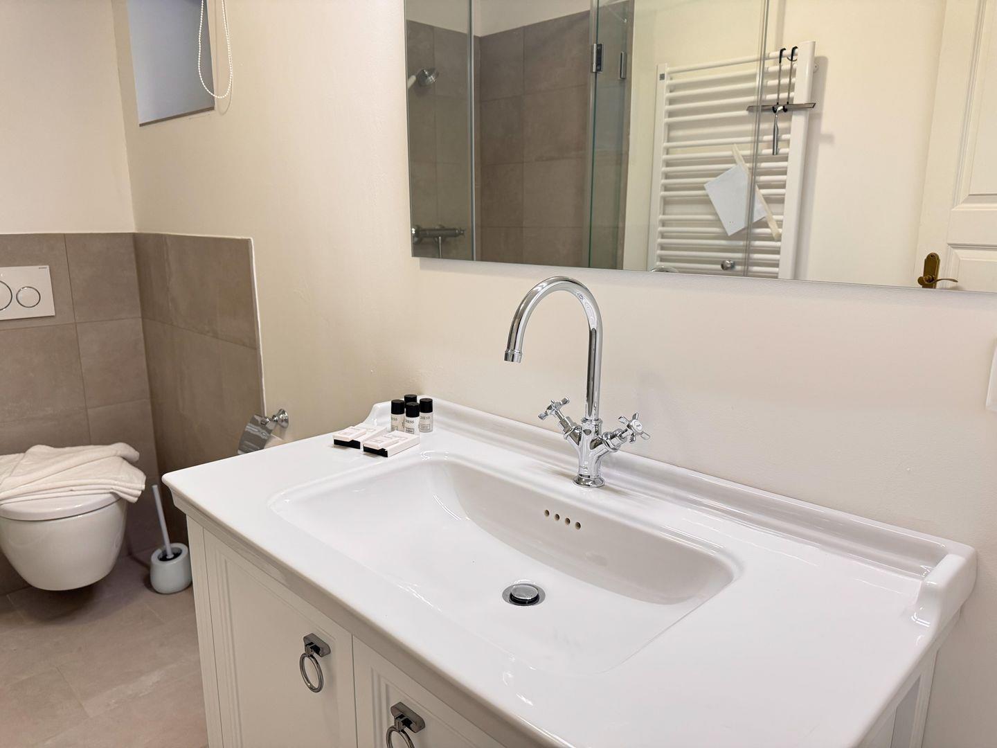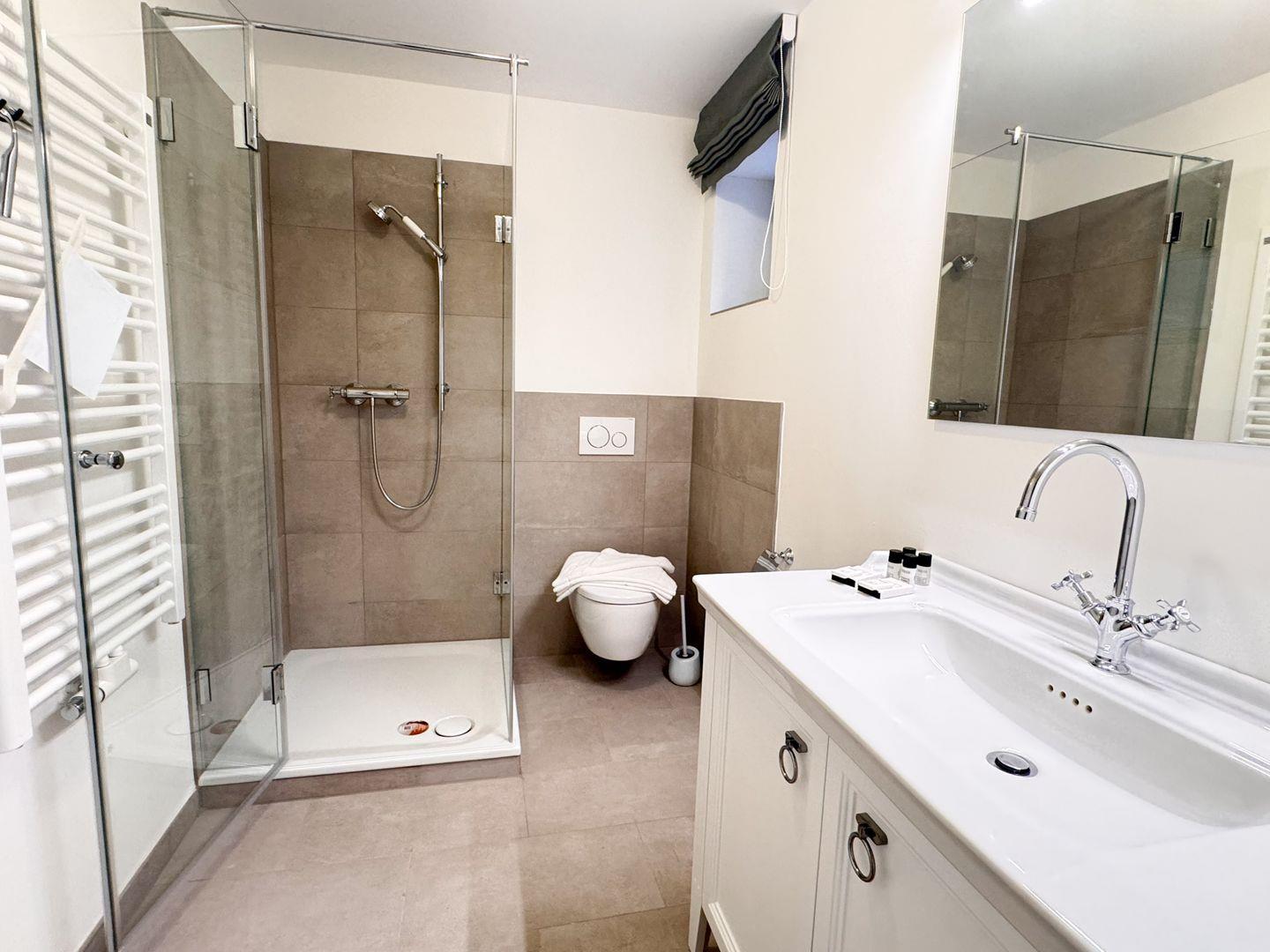 Das Appartement verfügt über ein Badezimmer mit Dusche und Wanne. Hygienische Annehmlichkeiten wie ein Waschbecken, WC, Spiegel und ein Haartrockner sind selbstverständlich vorhanden. Ein separates Gäste-WC steigert den Komfort bei einem Aufenthalt mit mehreren Personen. Zur weiteren Ausstattung gehören ein Abfalleimer, Fenster mit Sichtschutz, eine Garderobe sowie Rauchmelder, was für zusätzliche Sicherheit sorgt.