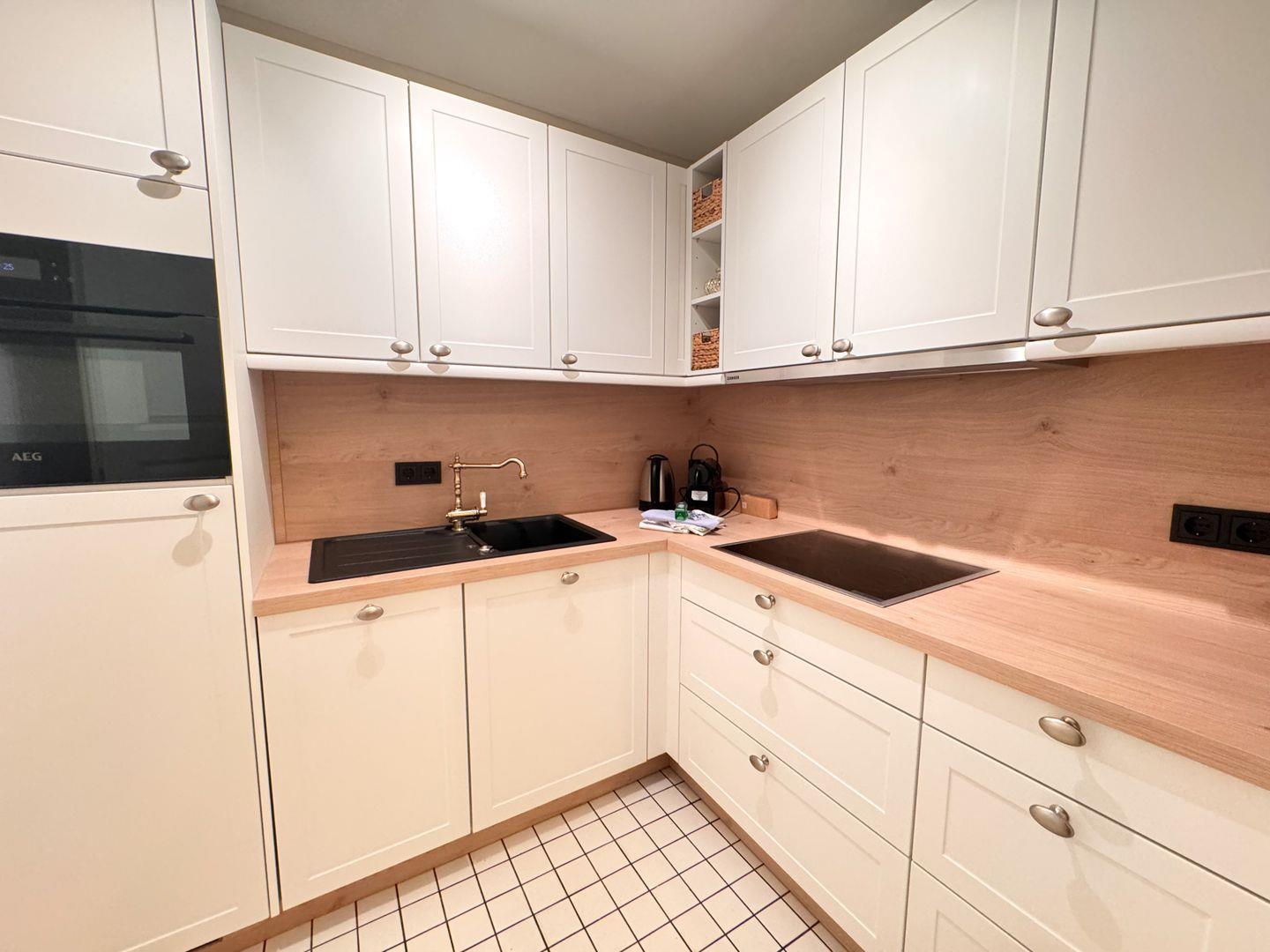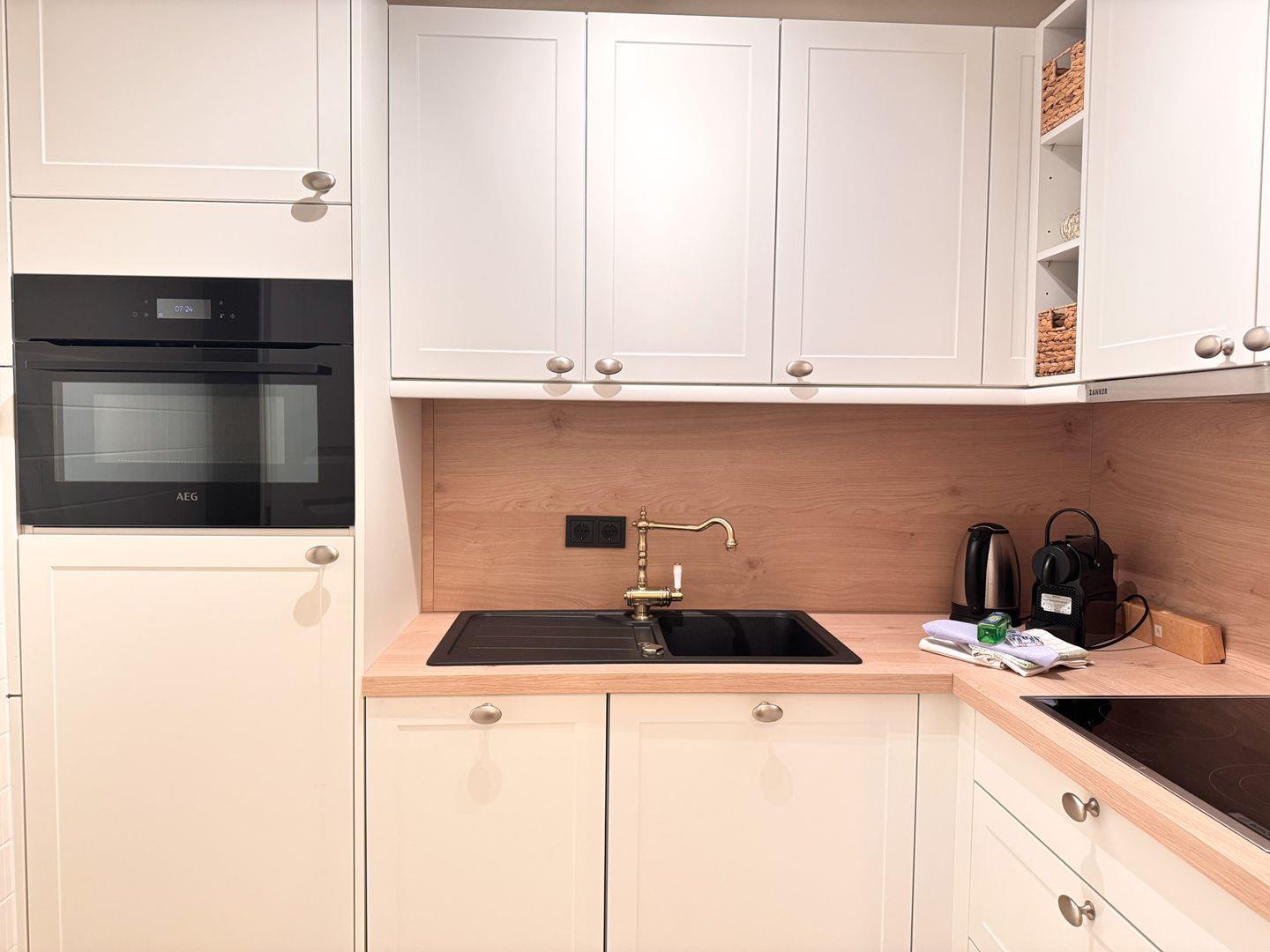 Das Appartement selbst überzeugt durch eine geschlossene Küche, die mit modernen Geräten ausgestattet ist. Zur Ausstattung zählen unter anderem ein Ceranherd, ein Backofen, eine Mikrowelle, ein Kühlschrank mit Gefrierfach, eine Spülmaschine sowie eine Nespresso-Espressomaschine. Ergänzt wird die Küchenausstattung durch einen Toaster, einen Wasserkocher sowie vollständiges Geschirr und Besteck. Diese Ausstattung ermöglicht eine komfortable Zubereitung von Mahlzeiten.