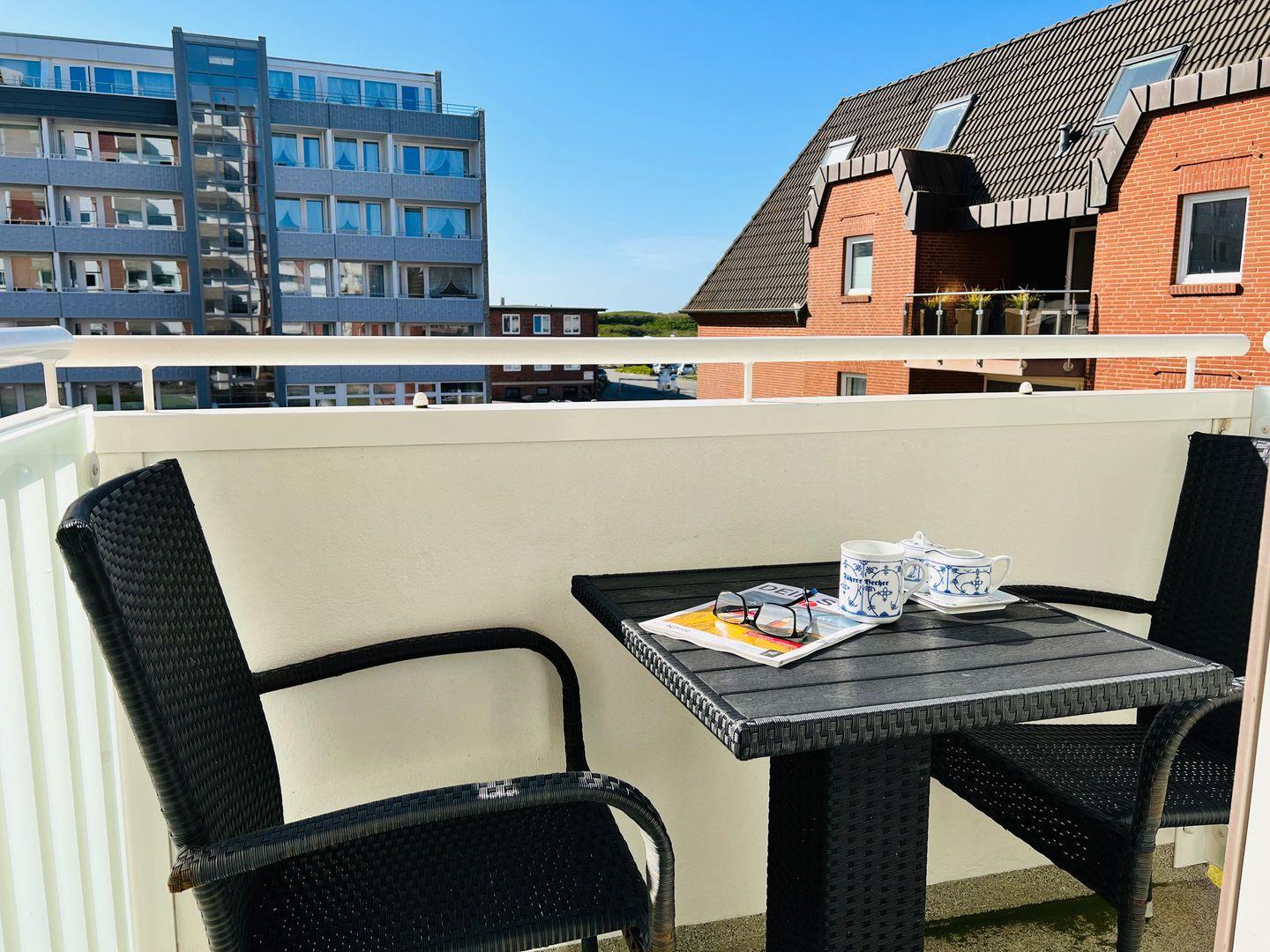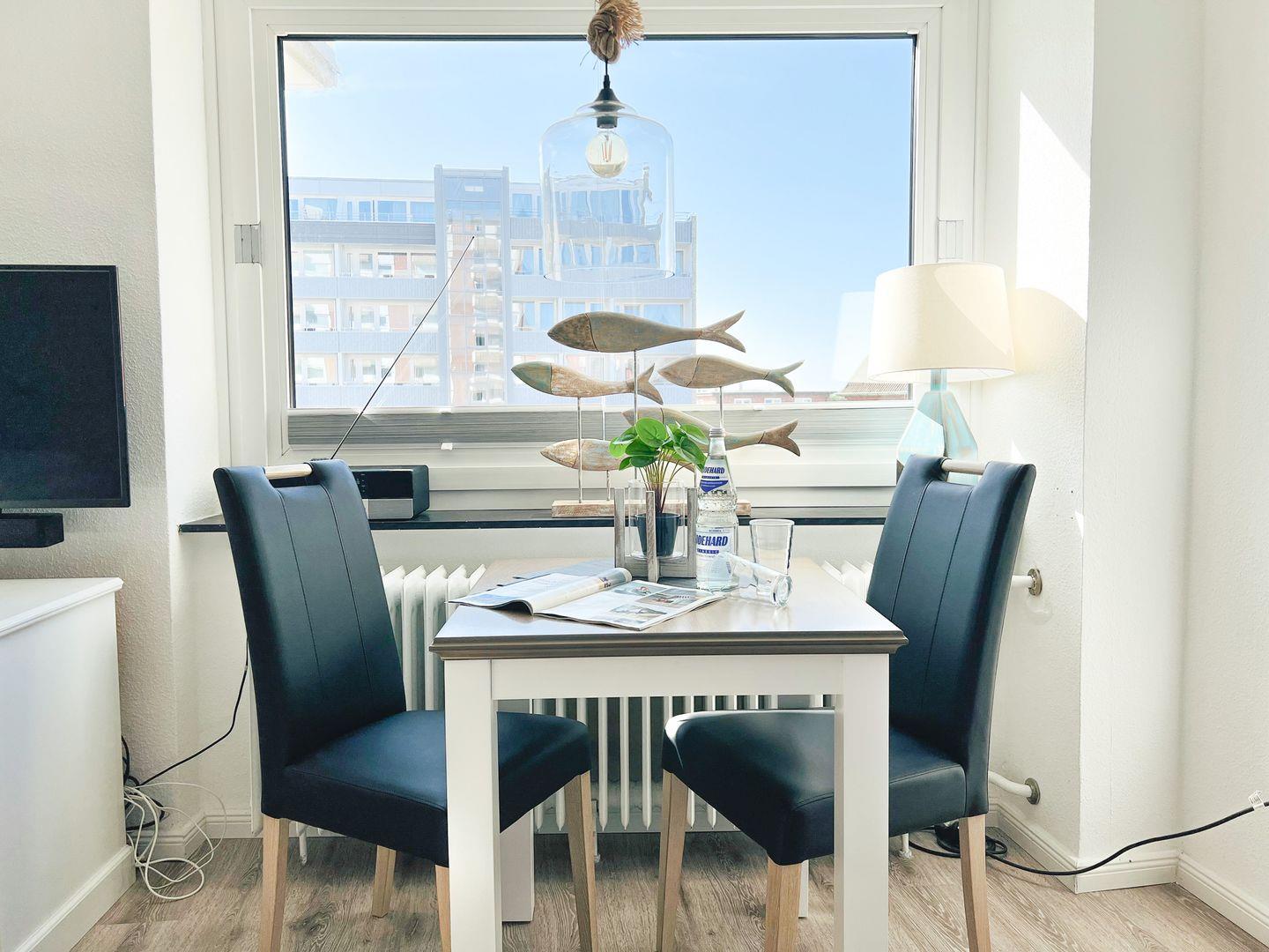 kleinen Tisch und 2 Stühlen ausgestattet.Es handelt sich um ein
