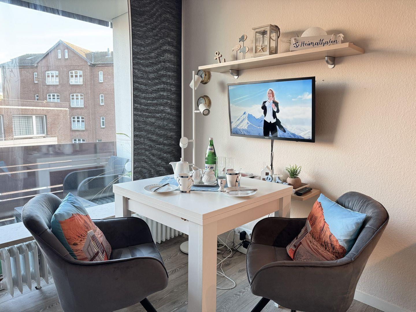 Boxspringbett, TV, Kleiderschrank und einem Essplatz für 2 Personen.In der