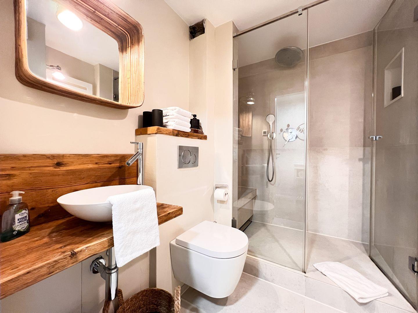 Badezimmer (Duschbad) mit Dusche, WC, Handtuchwärmer und Föhn.