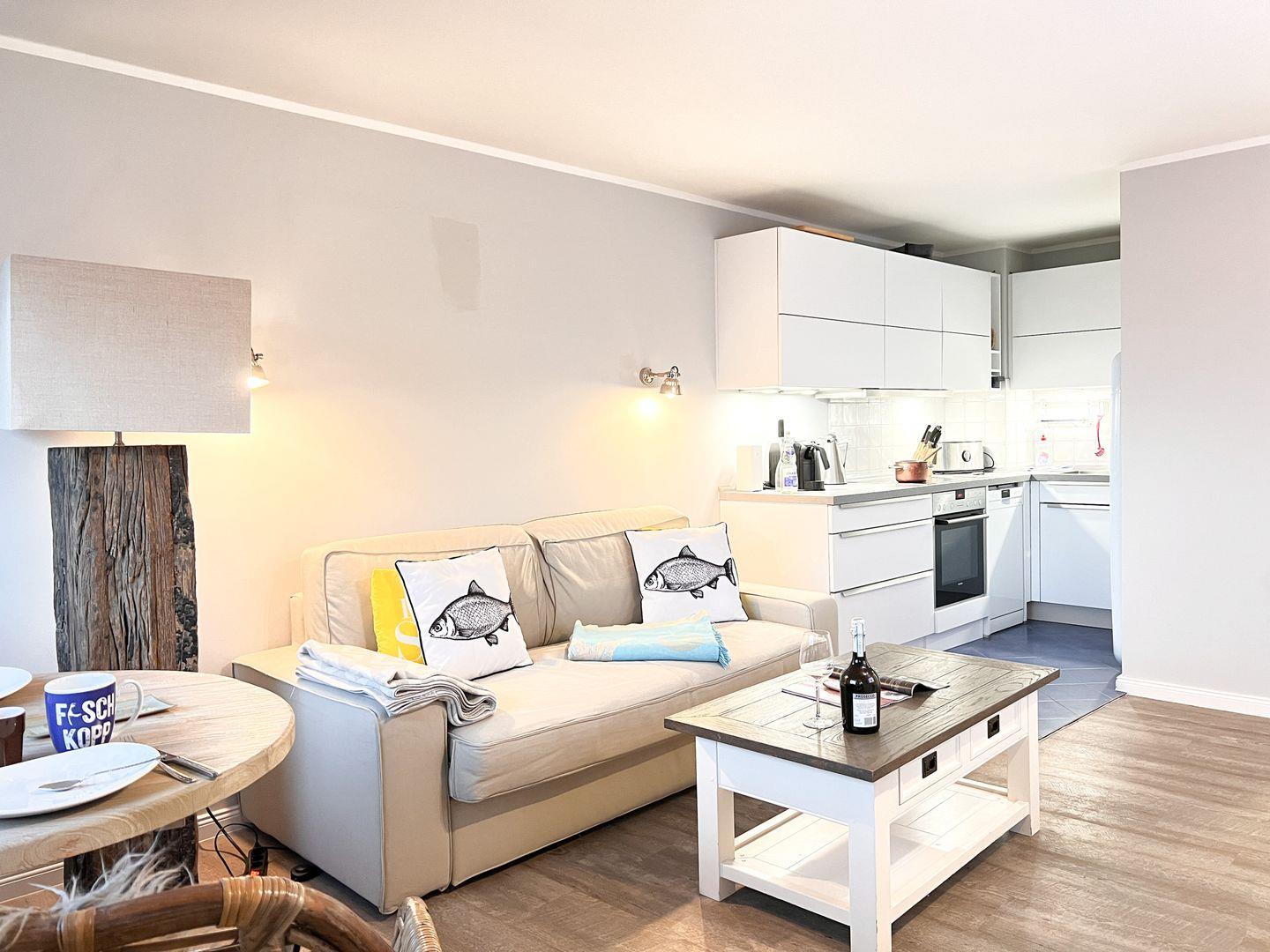 Wohnzimmer mit Sofa, Essplatz und TV. Direkter Zugang zum möblierten Balkon nach Westen - Meerblick.