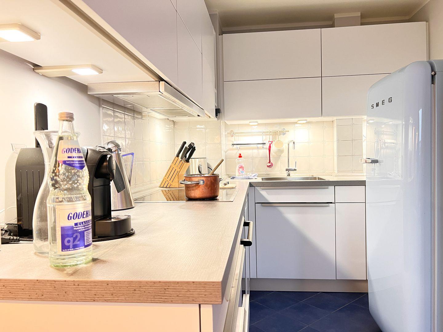 Offene Küche mit Cerankochfeld, Backofen, Geschirrspüler und einer Tchibo Cafissimo Kapselmaschine.