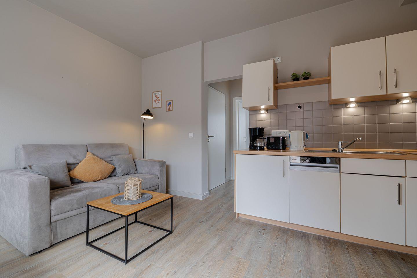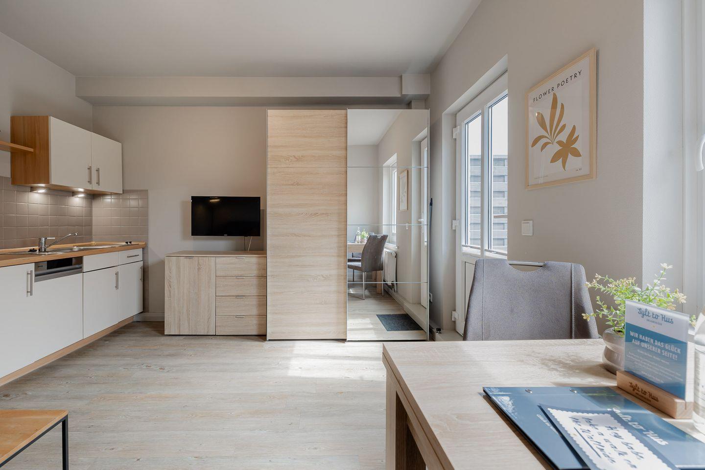 Die kleine Terrasse (Südlage) führt direkt in den gemütlichen und in hellen Farben gehaltenen Wohnbereich mit Couch, Essecke und gut ausgestatteter Küchenzeile. Das kleine Schlafzimmer verfügt über ein bequemes Boxspringbett. Ein helles Duschbad macht das Appartement Krabbe komplett. Ein kleines, feines Urlaubsdomizil für eine ein paar schöne Tage auf Sylt!