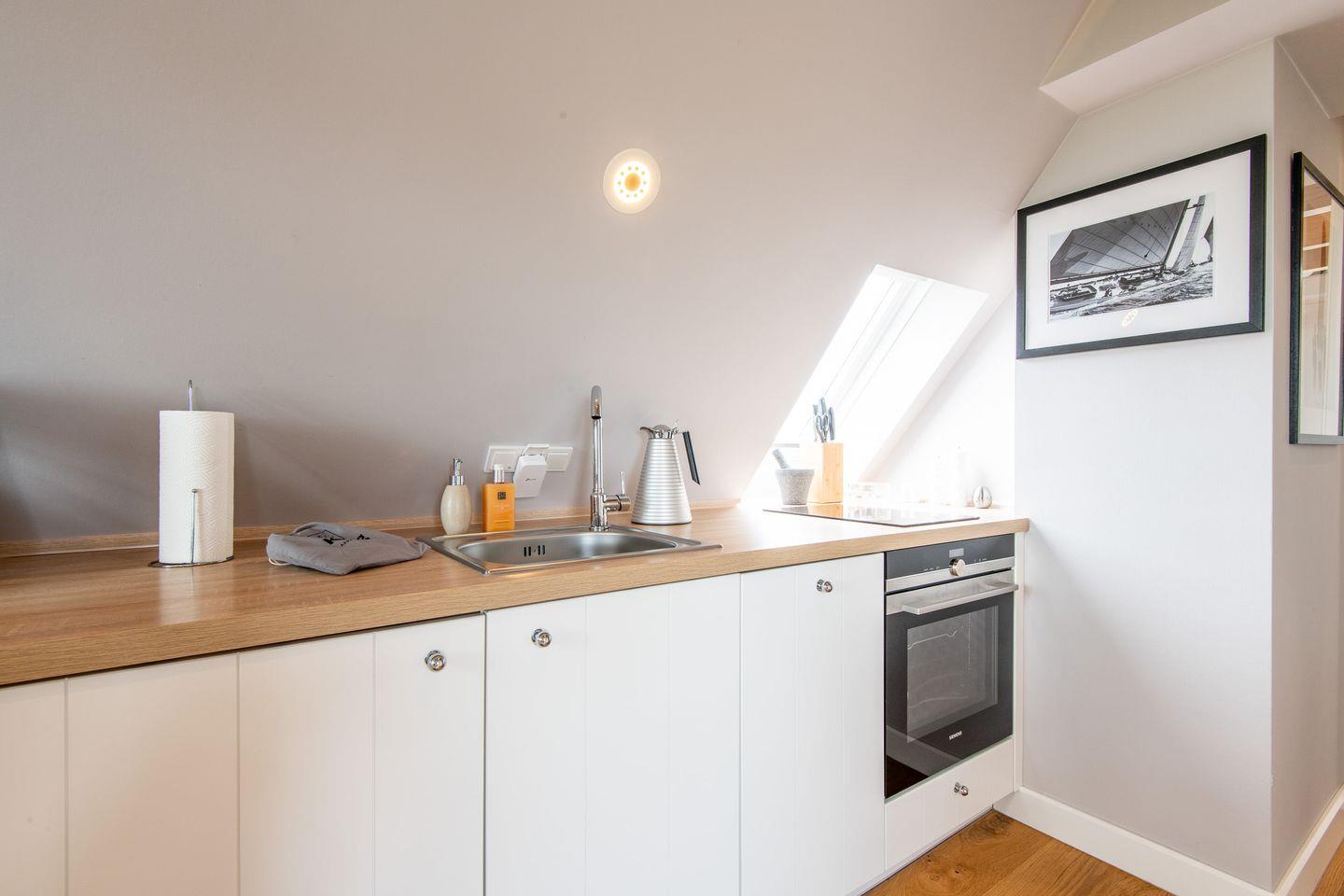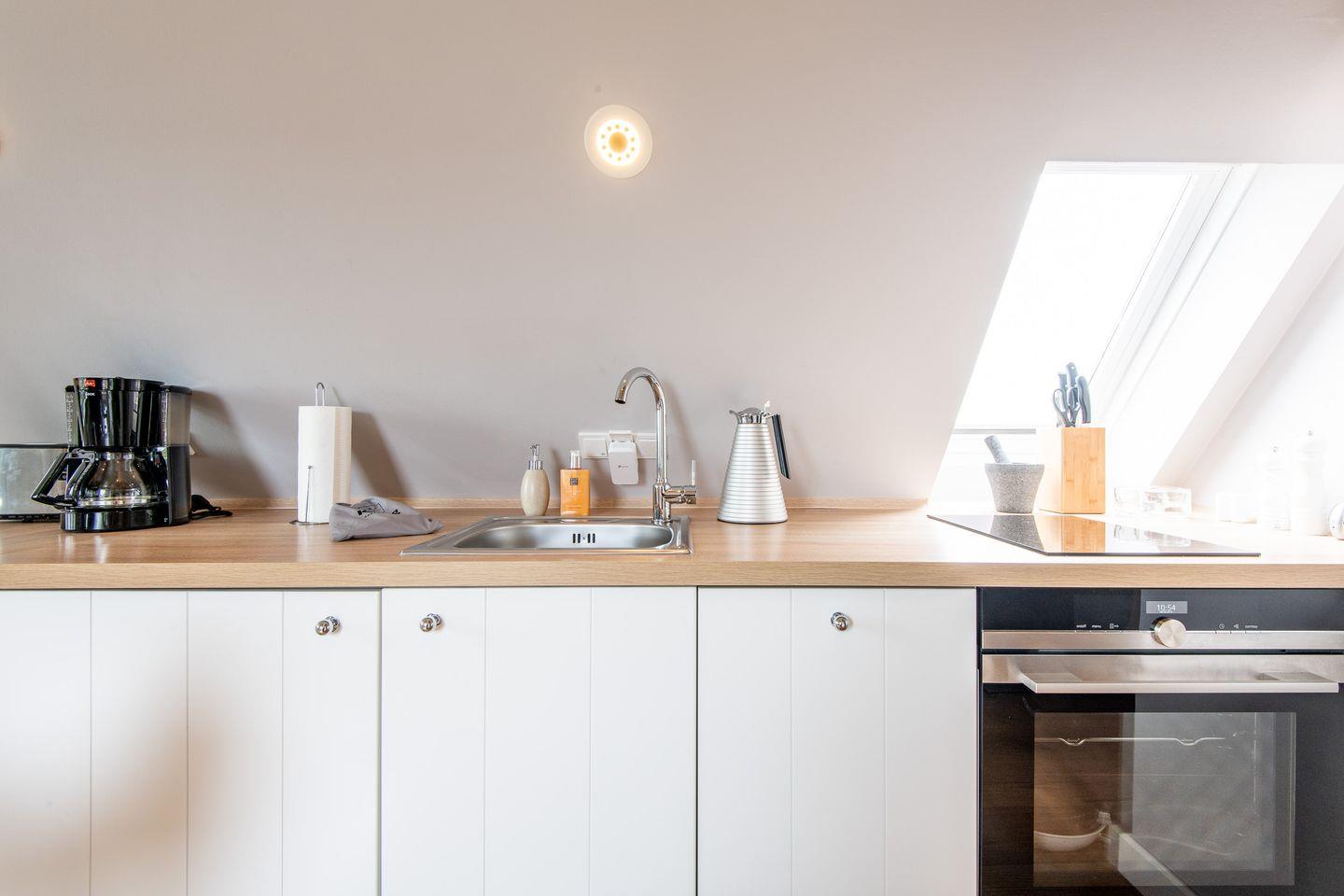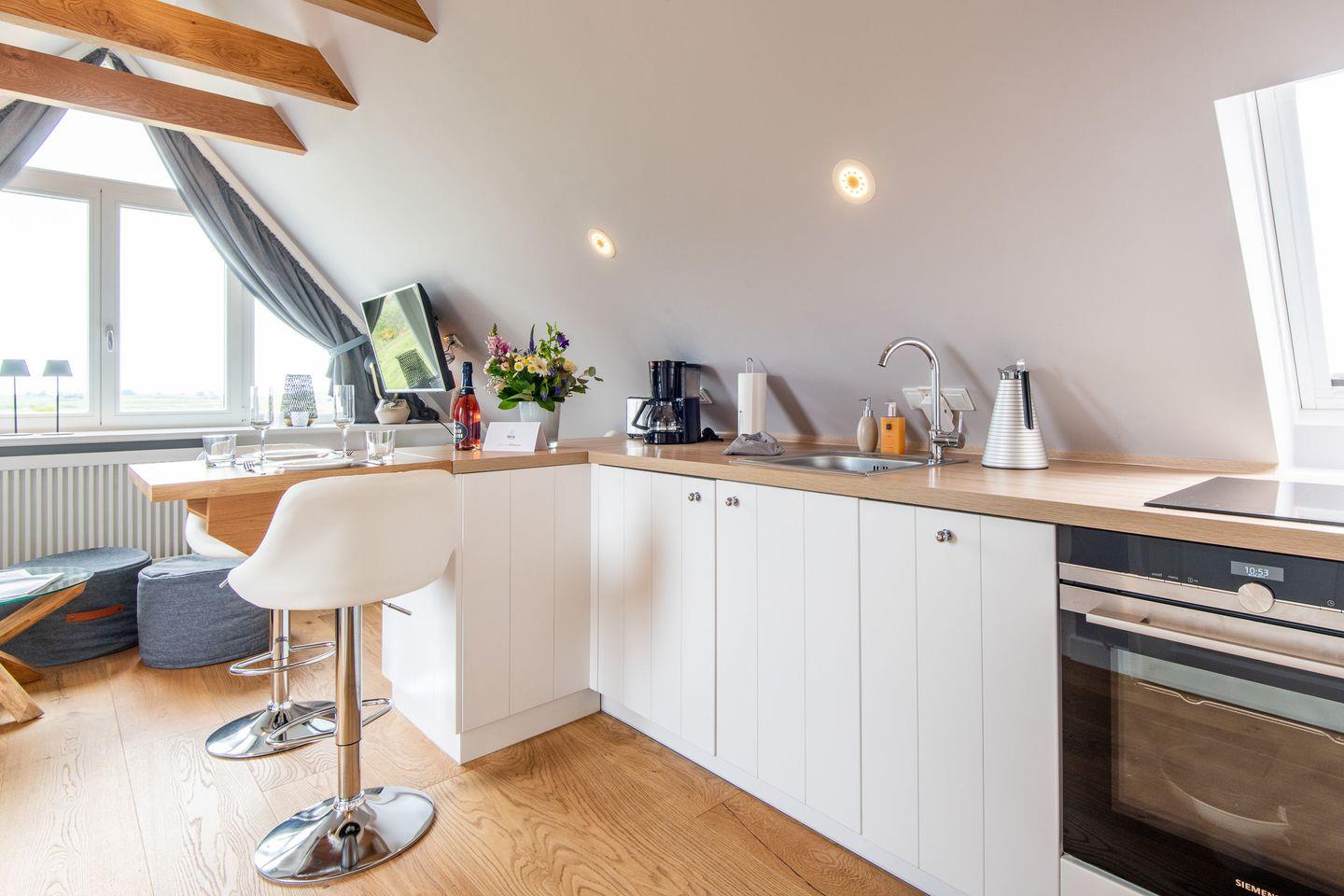 Die offene Küche ist mit allem ausgestattet, was Sie zur Zubereitung köstlicher Mahlzeiten benötigen. Ein Cerankochfeld und alle wichtigen Küchengeräte stehen Ihnen zur Verfügung, sodass Sie Ihre kulinarischen Ideen bequem umsetzen können.