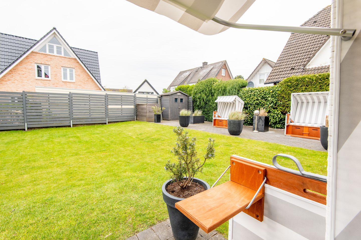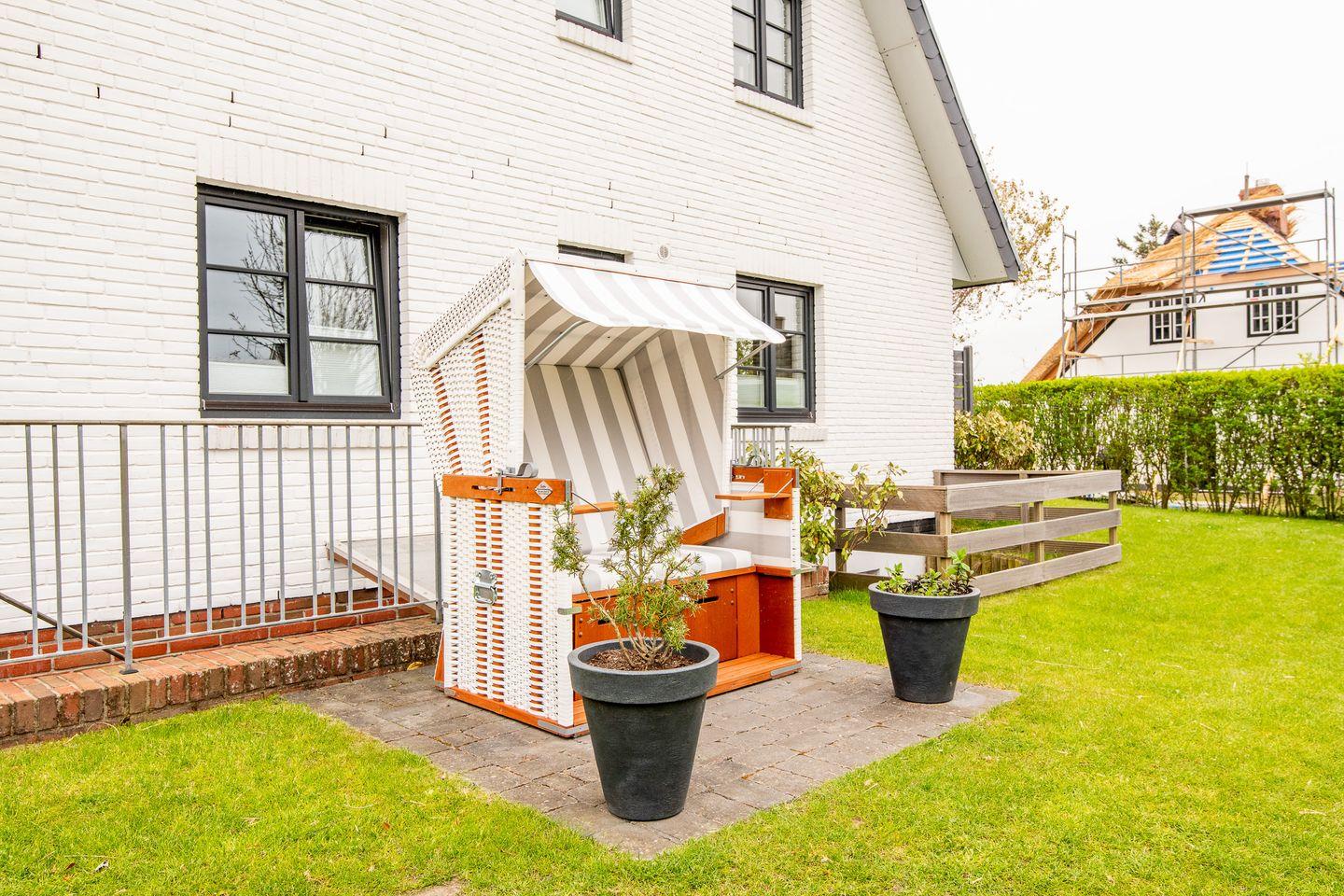 Ein Gemeinschaftsgarten mit einem Sonnenfreisitz und Strandkorb lädt dazu ein, die Sylter Sonne und die frische Nordseeluft zu genießen. Dieser Außenbereich bietet die perfekte Umgebung für ein gemütliches Frühstück im Freien oder einen entspannten Nachmittag.