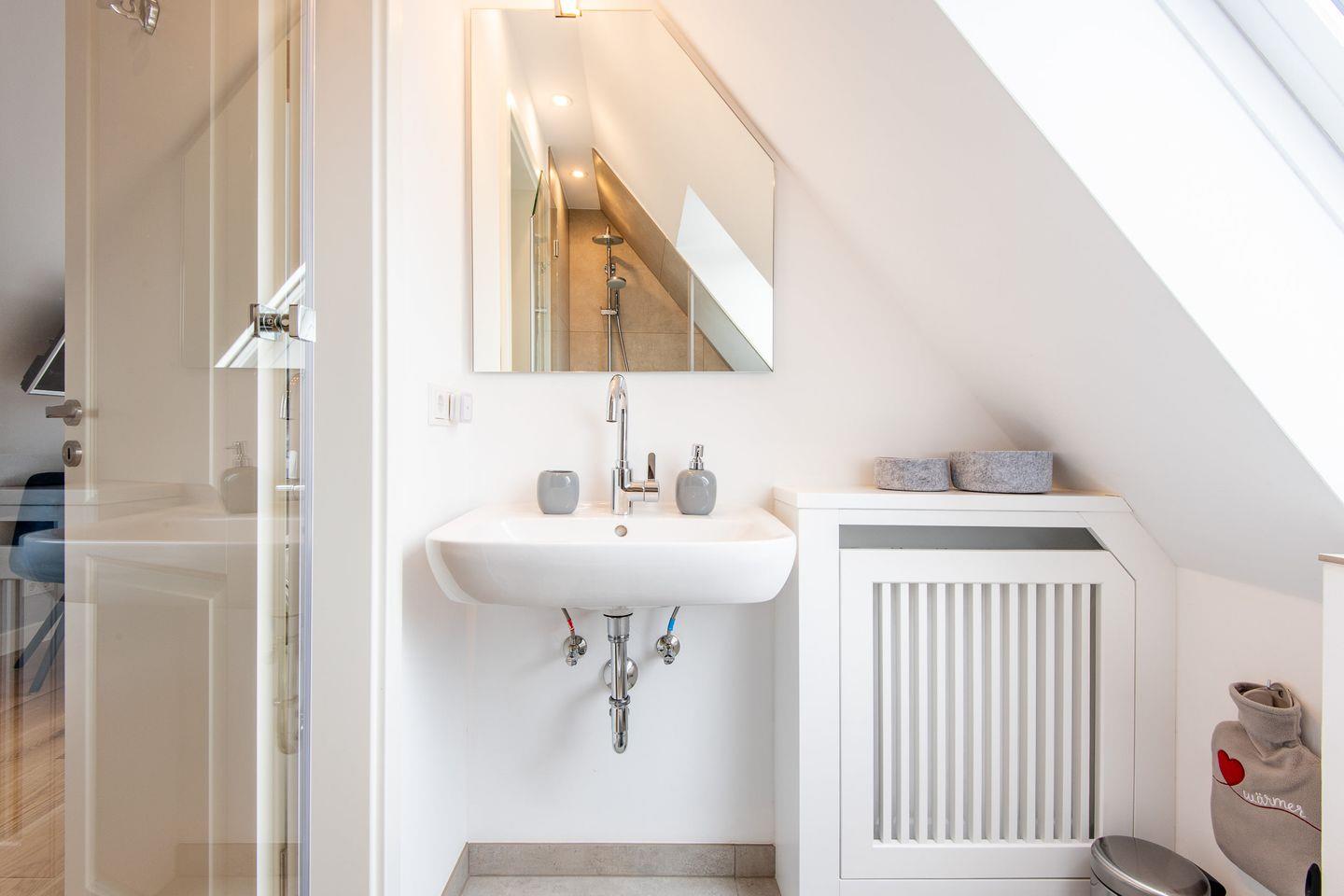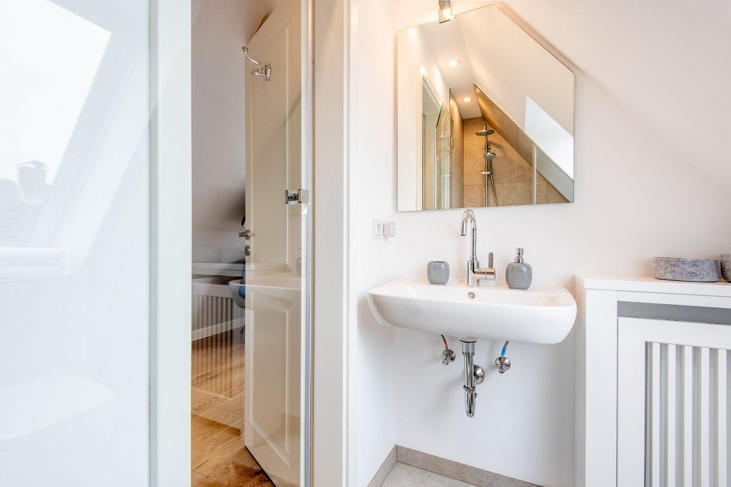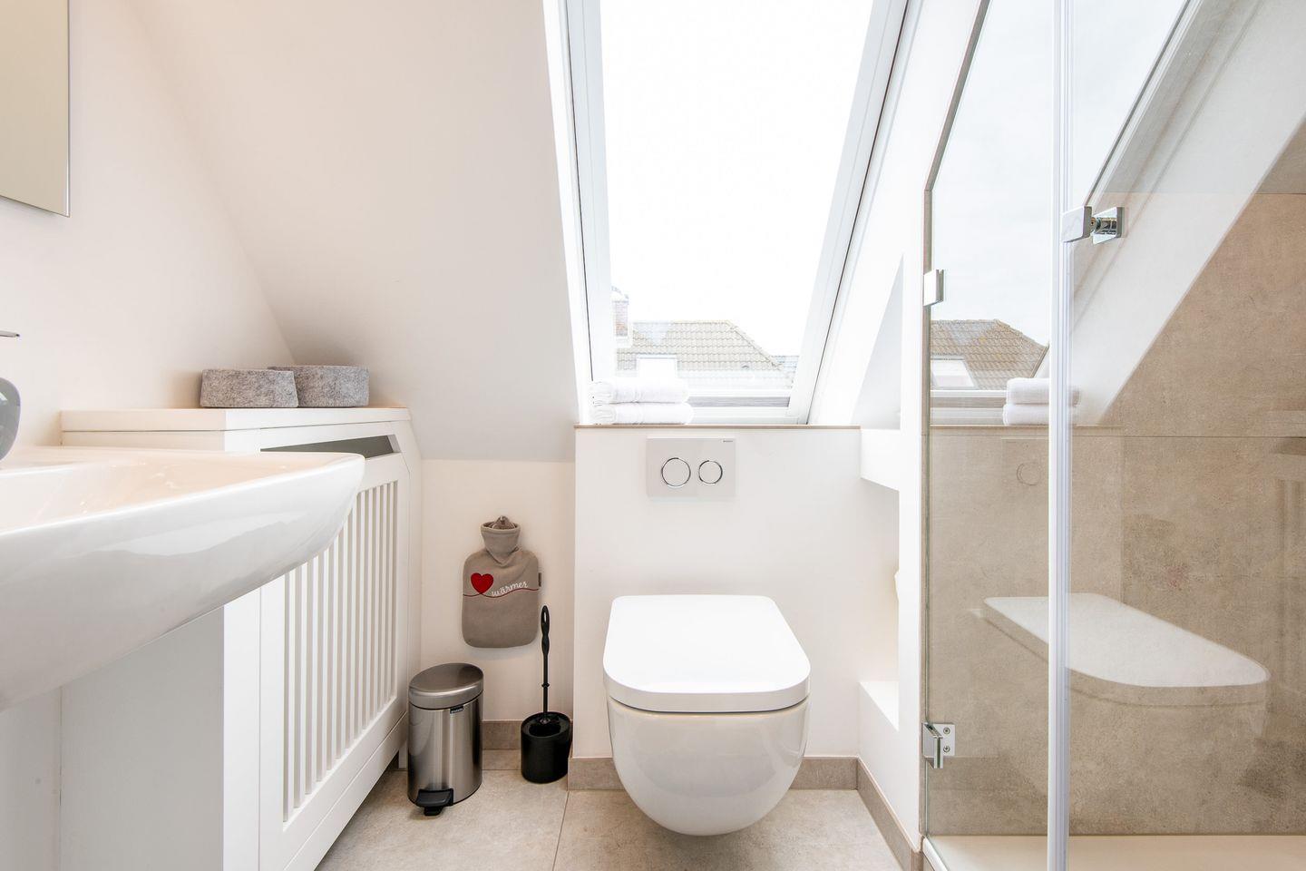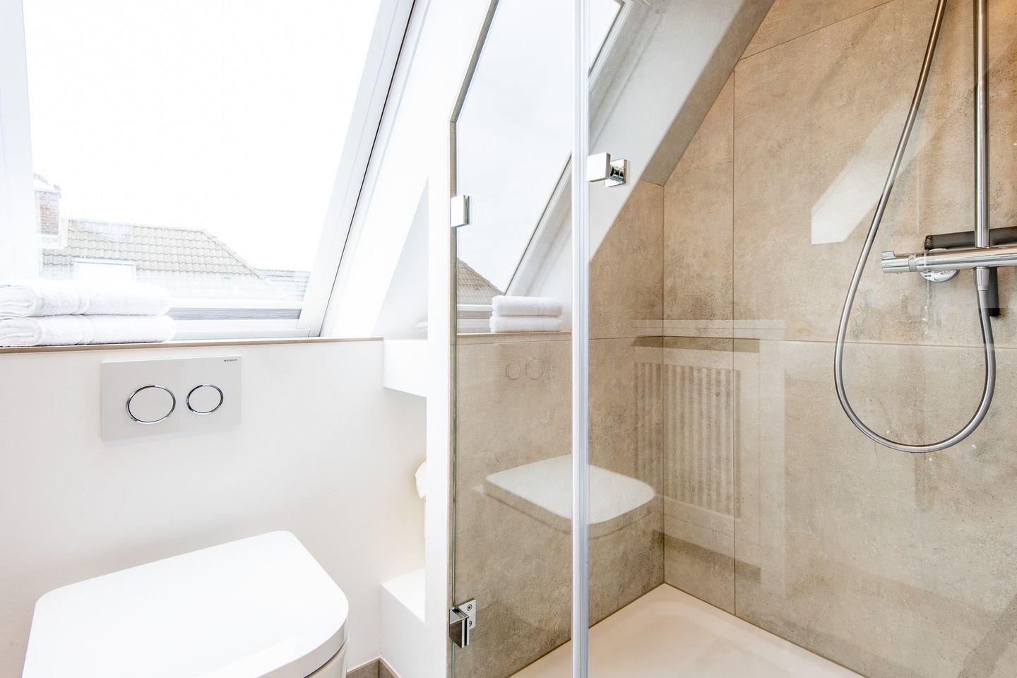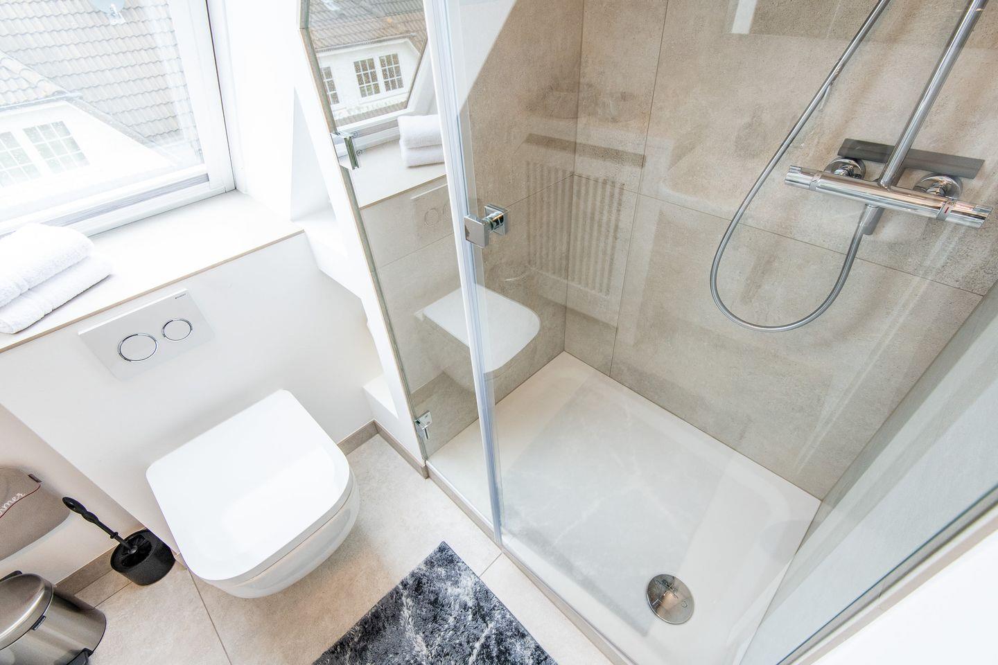 Das moderne Badezimmer mit ebenerdiger Dusche, WC und Fön bietet Ihnen den Komfort und die Annehmlichkeiten, die Sie für einen rundum entspannten Aufenthalt benötigen.