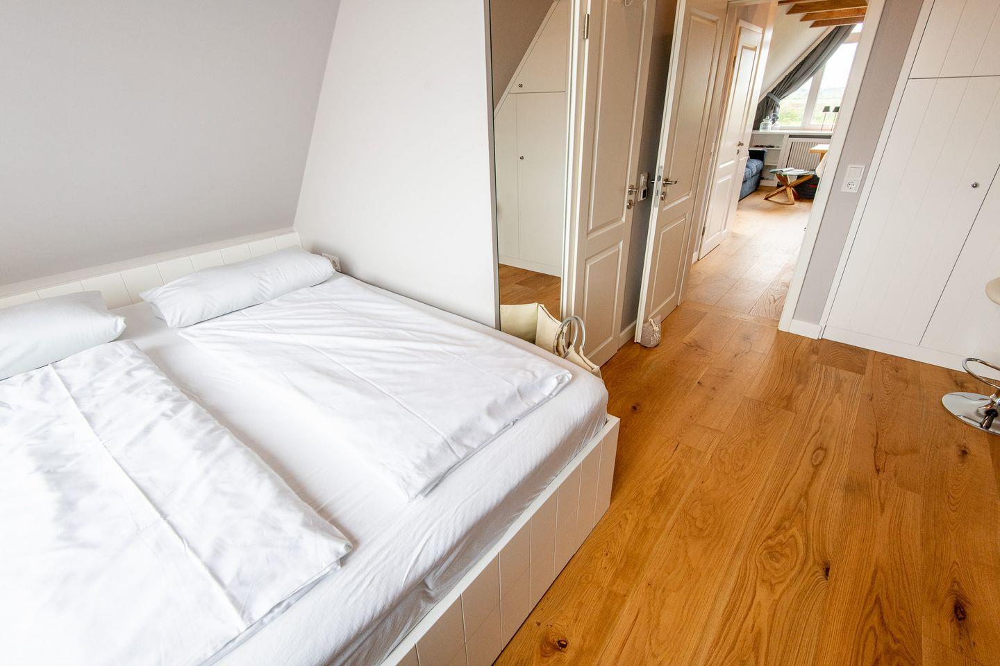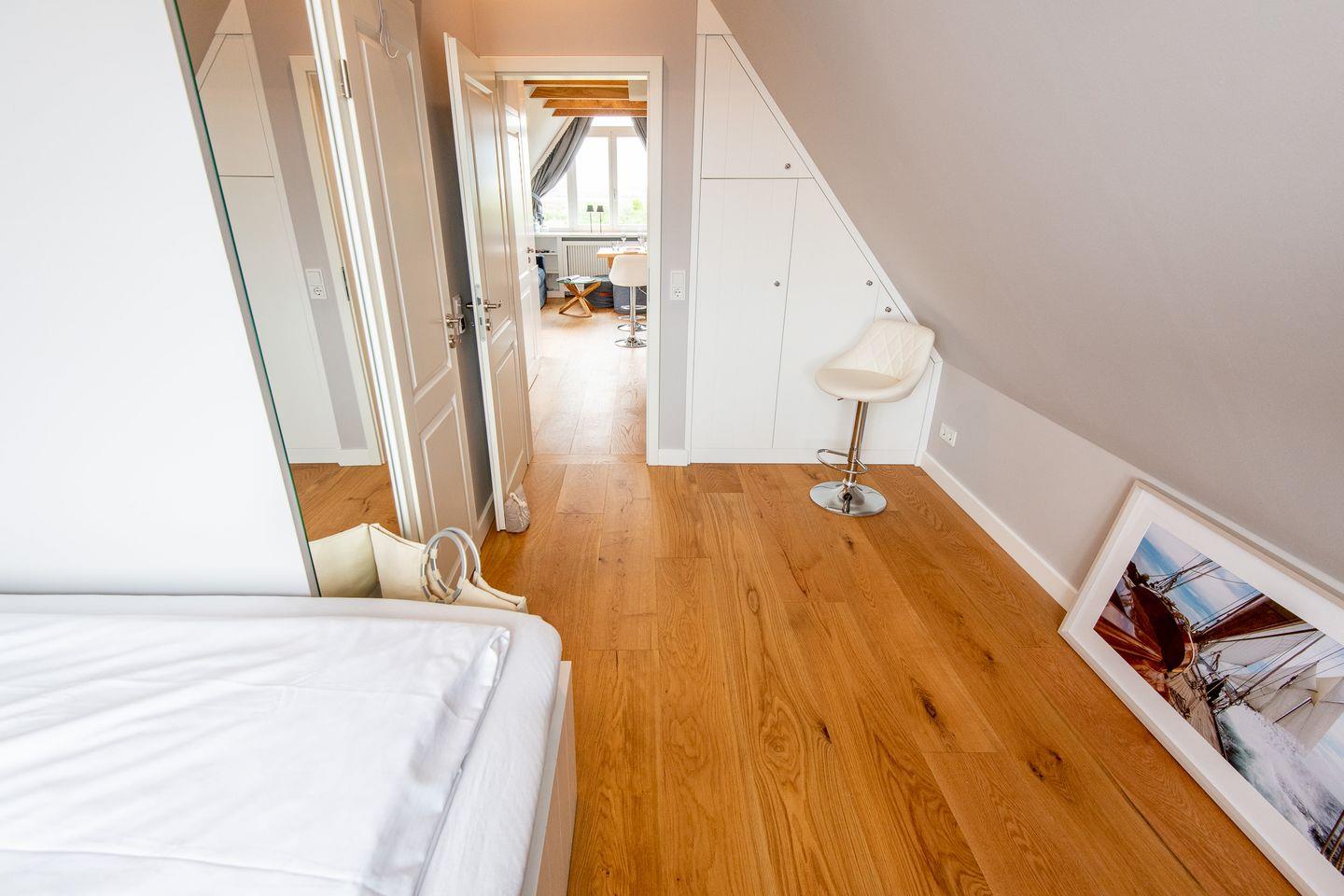 Im separaten Schlafzimmer erwartet Sie ein komfortables Doppelbett (160x200 cm) und ein geräumiger Kleiderschrank – ein angenehmer Rückzugsort für erholsame Nächte nach einem erlebnisreichen Tag auf der Insel.