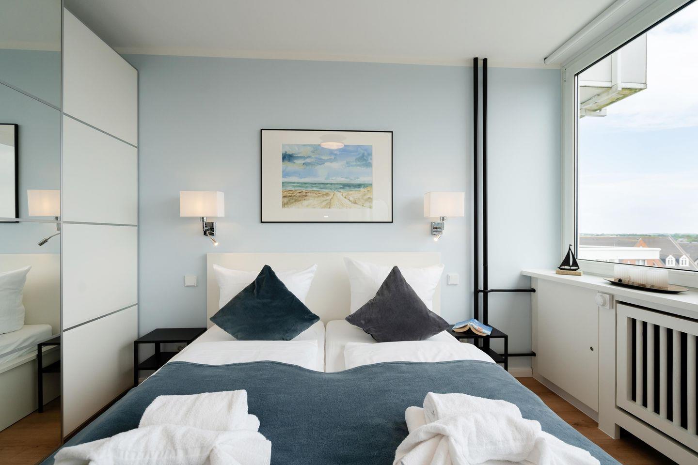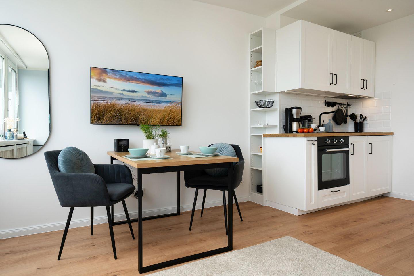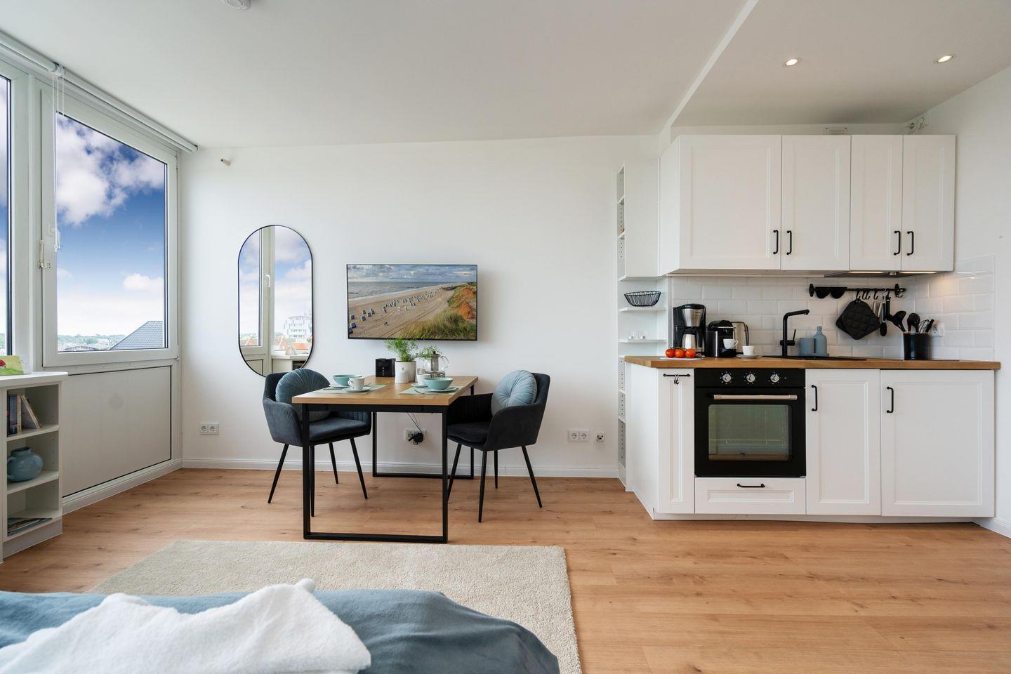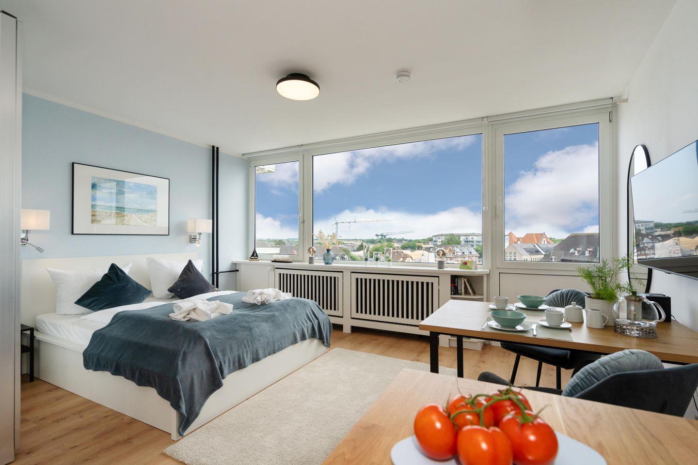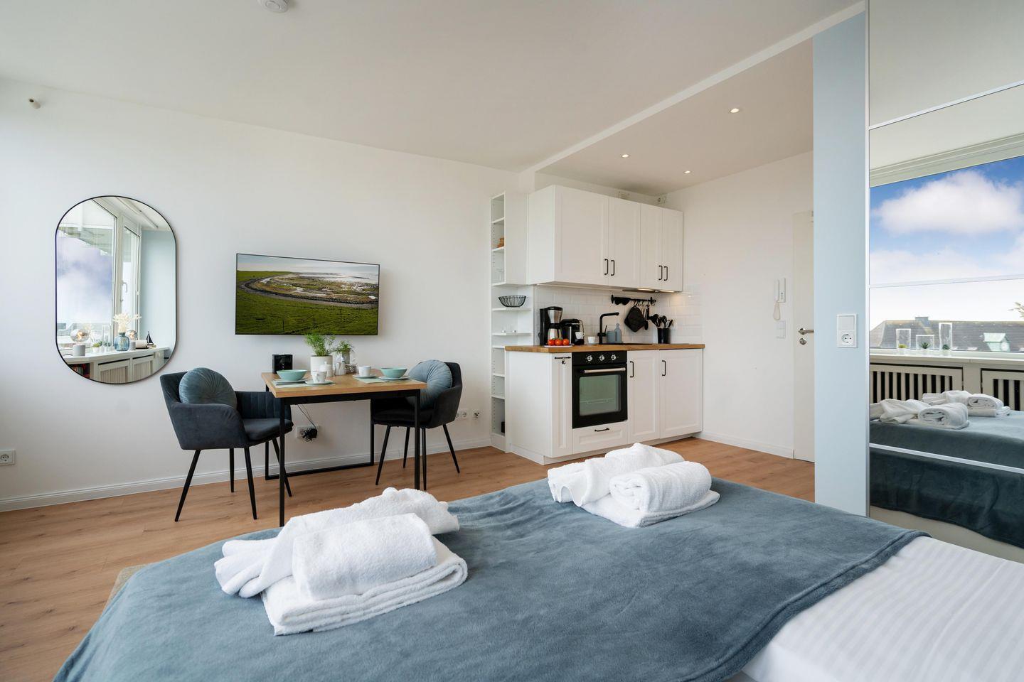 Dieses modern renovierte Einzimmerappartement für bis zu 2 Personen befindet sich zentral in Westerland. "Himmelblau" bietet Ihnen eine offene, voll ausgestattete Küche mit angrenzendem Ess- und Schlafbereich sowie ein modernes Duschbad. Genießen Sie den herrlichen Blick über den Westerländer Bahnhof und die Dünenlandschaften. Kostenloses WLAN, ein zugehöriger PKW-Stellplatz (max. Einfahrtshöhe 2,50 m) sowie ein Fahrstuhl sind vorhanden. Haustiere sind erlaubt.