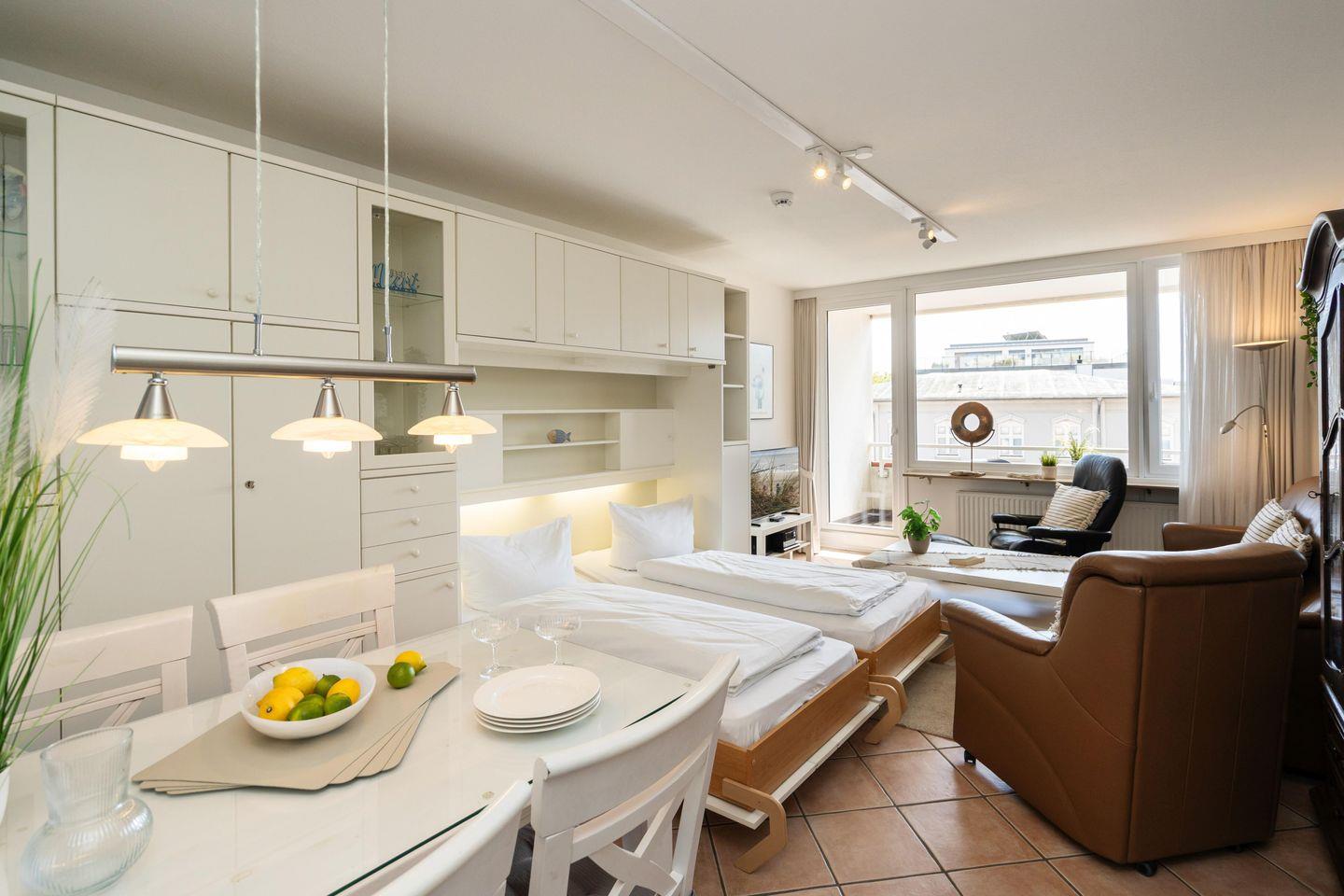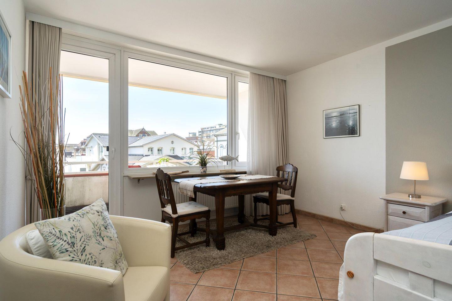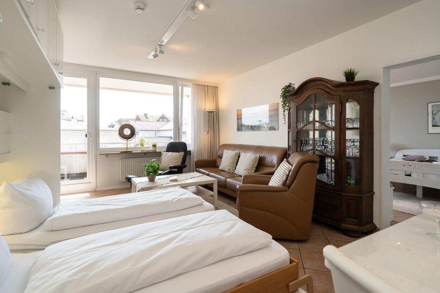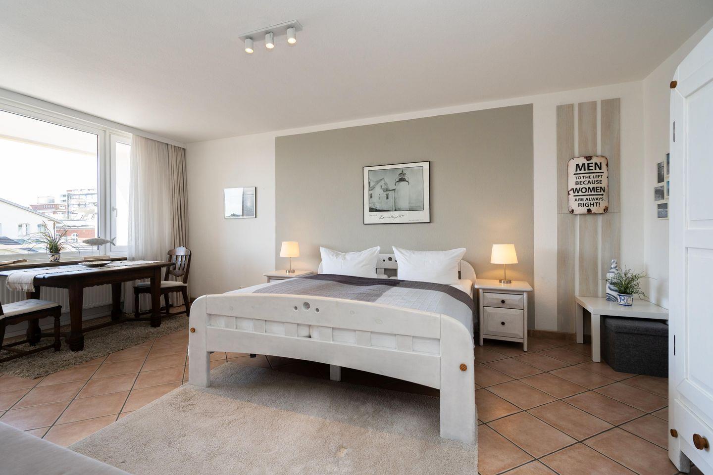 Diese gemütliche 2-Zimmer Ferienwohnung mit 2 großen Südbalkonen samt Blick bis zum Meer für bis zu 4 Personen liegt zentral in Westerland in strandnaher Lage. Der gemütliche Wohn- und Schlafbereich bietet Ihnen neben einem Schrankbett mit zwei Einzelbetten (2x 80x200 cm) eine gemütliche Sitzecke samt Sessel und Sofa sowie einen TV zum Entspannen. Im separaten Schlafzimmer erwartet Sie ein Doppelbett (180x200 cm), ein weiterer TV sowie ein Schreibtisch für das Homeoffice mit zwei Stühlen. Die separate Küche ist modern und voll ausgestattet. Im geräumigen Badezimmer erwartet Sie eine großzügige Dusche. Ein weiteres Gäste-WC findet sich im Eingangsbereich der Wohnung. Kostenloses WLAN, ein zugehöriger Tiefgaragenstellplatz (Einfahrtshöhe 180 cm) sowie ein Fahrstuhl sind vorhanden. Haustiere sind leider nicht erlaubt. Im Waschraum des Gebäudes stehen Ihnen kostenpflichtige Waschmaschinen (4x 1€) sowie Trockner (4x 1€) zur Verfügung.