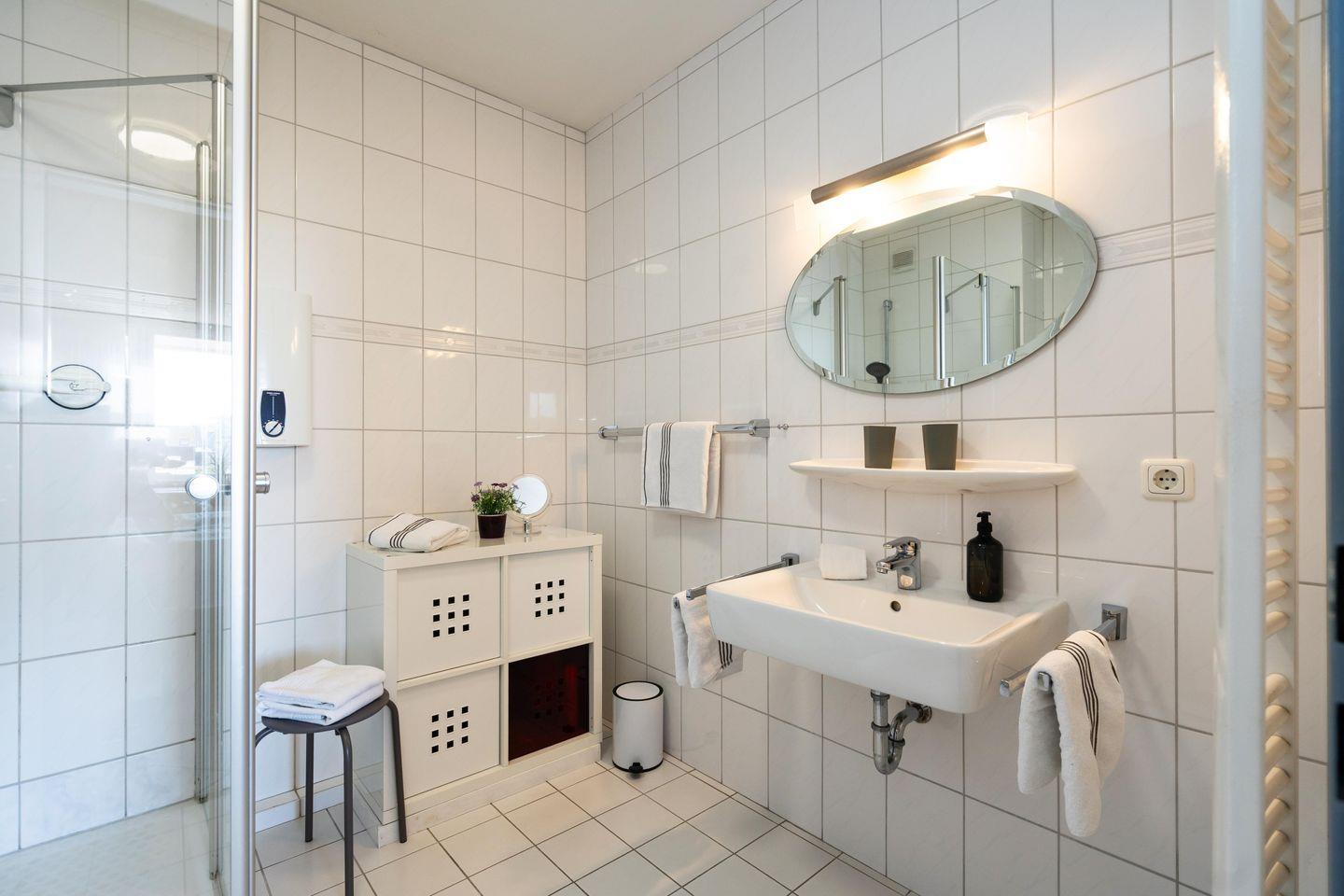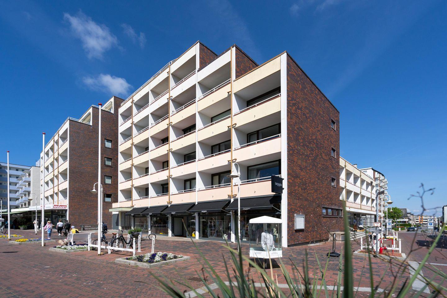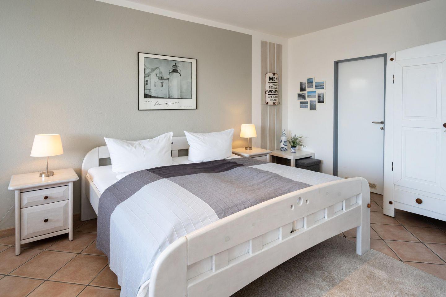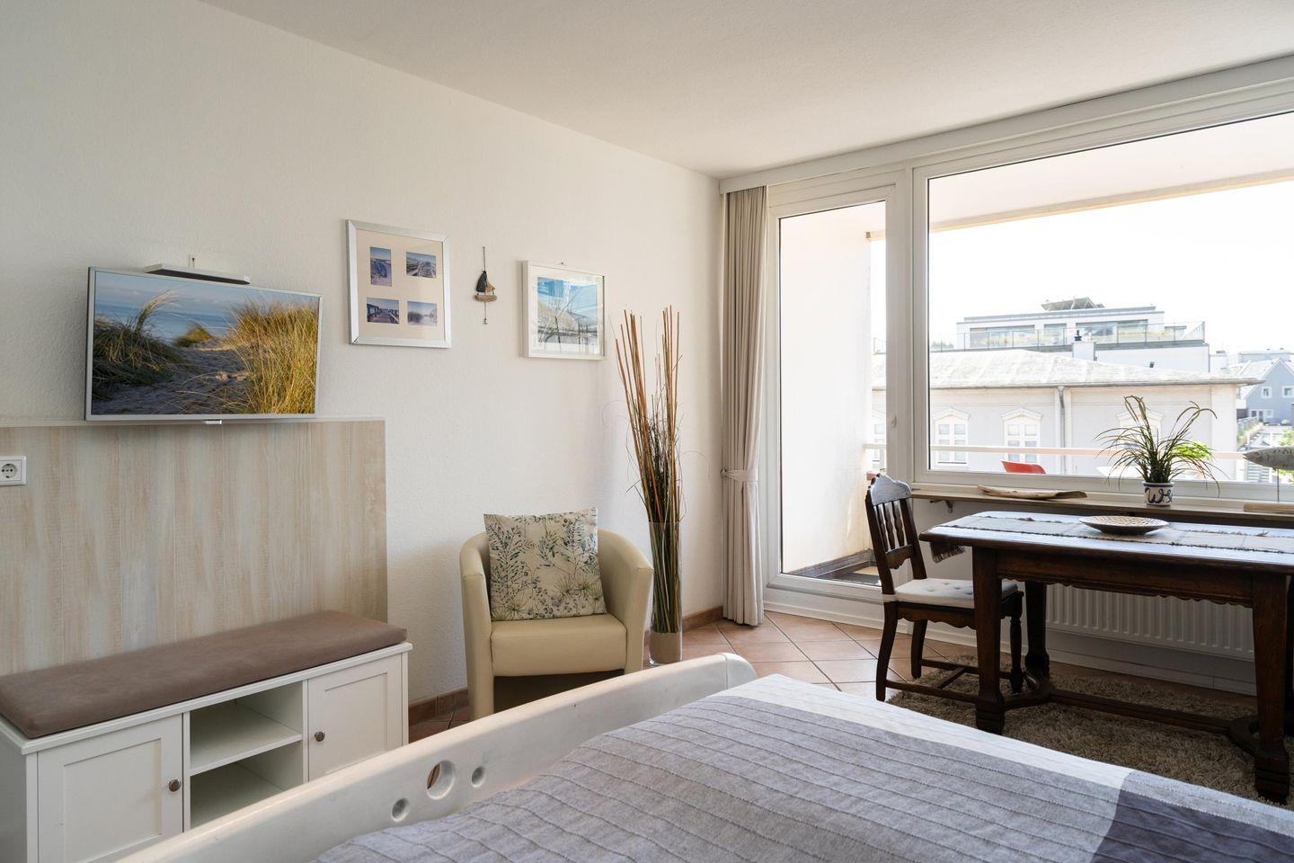 Diese gemütliche 2-Zimmer Ferienwohnung mit 2 großen Südbalkonen samt Blick bis zum Meer für bis zu 4 Personen liegt zentral in Westerland in strandnaher Lage. Der gemütliche Wohn- und Schlafbereich bietet Ihnen neben einem Schrankbett mit zwei Einzelbetten (2x 80x200 cm) eine gemütliche Sitzecke samt Sessel und Sofa sowie einen TV zum Entspannen. Im separaten Schlafzimmer erwartet Sie ein Doppelbett (180x200 cm), ein weiterer TV sowie ein Schreibtisch für das Homeoffice mit zwei Stühlen. Die separate Küche ist modern und voll ausgestattet. Im geräumigen Badezimmer erwartet Sie eine großzügige Dusche. Ein weiteres Gäste-WC findet sich im Eingangsbereich der Wohnung. Kostenloses WLAN, ein zugehöriger Tiefgaragenstellplatz (Einfahrtshöhe 180 cm) sowie ein Fahrstuhl sind vorhanden. Haustiere sind leider nicht erlaubt. Im Waschraum des Gebäudes stehen Ihnen kostenpflichtige Waschmaschinen (4x 1€) sowie Trockner (4x 1€) zur Verfügung.