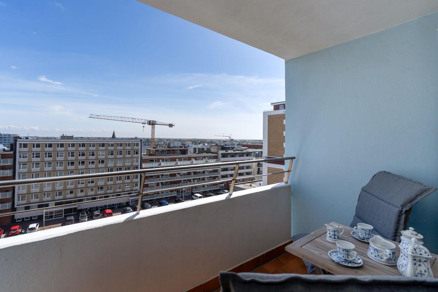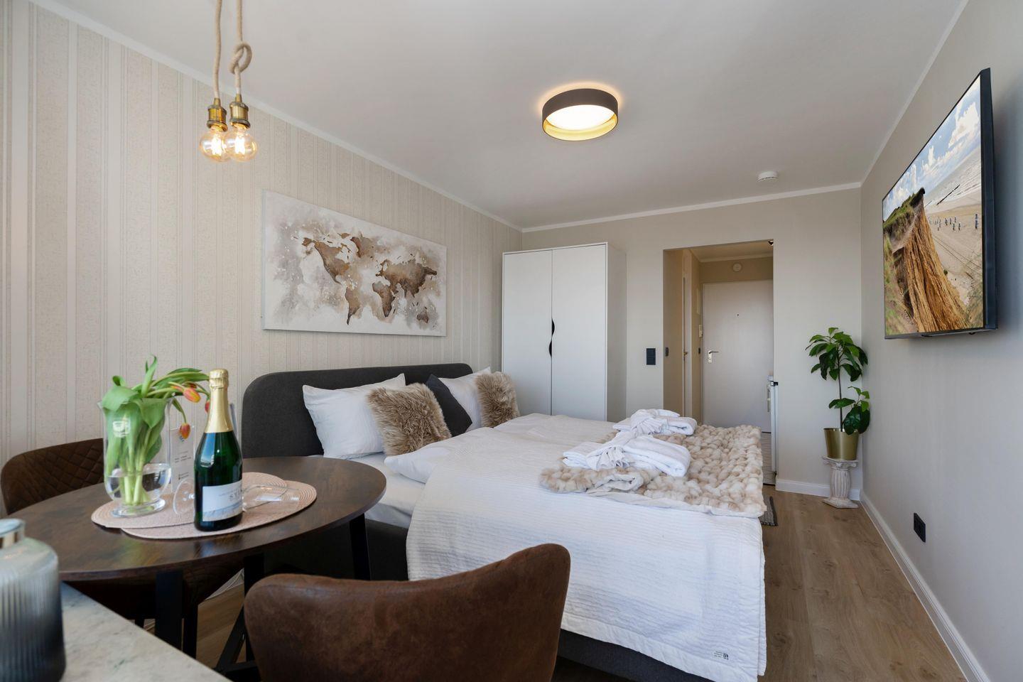 Moderne Ferienwohnung für bis zu 2 Personen mit schönem Frühstücksbalkon in direkter Stadt- und Strandlage. Inklusive WLAN sowie Fahrstuhl.