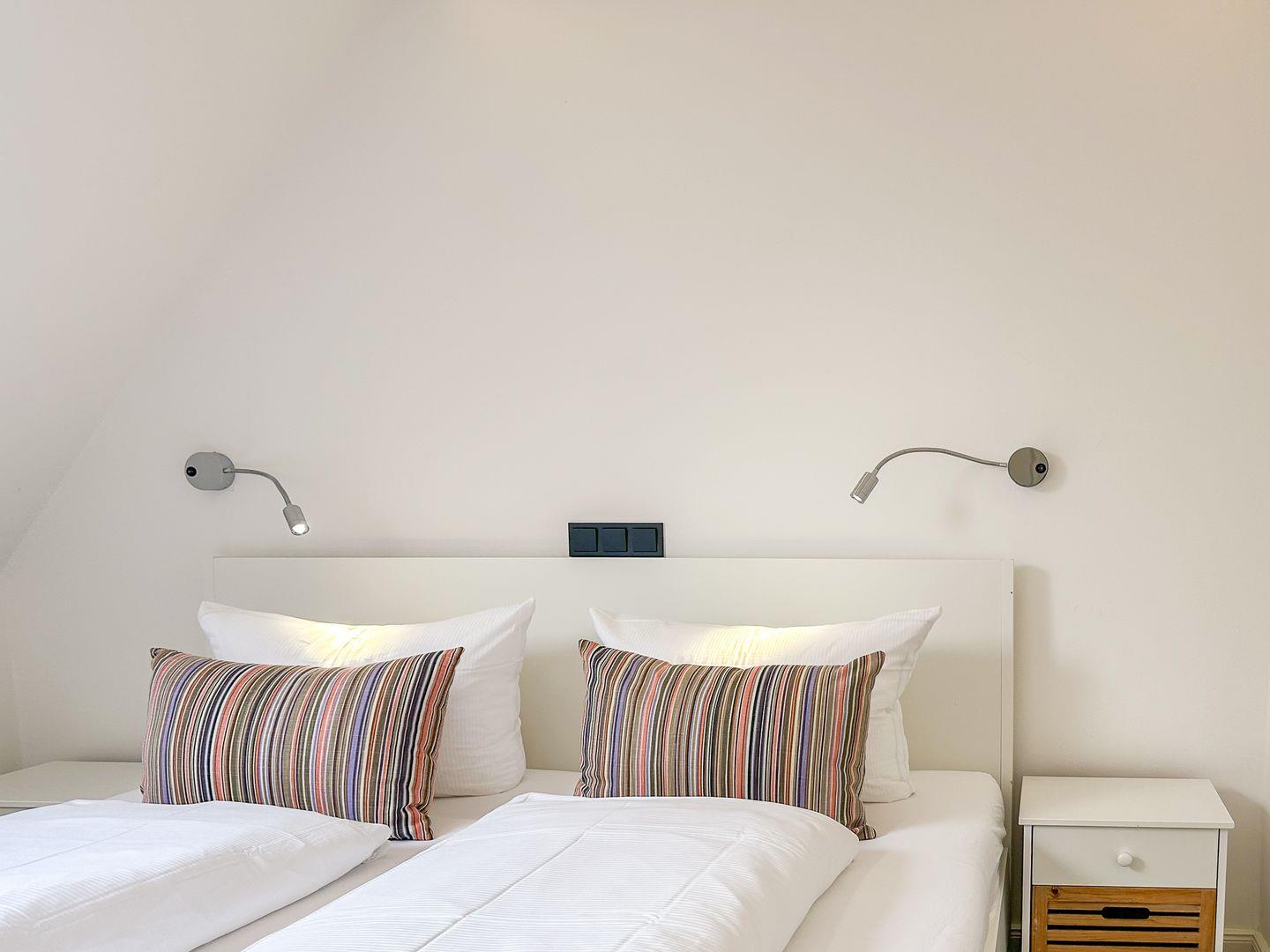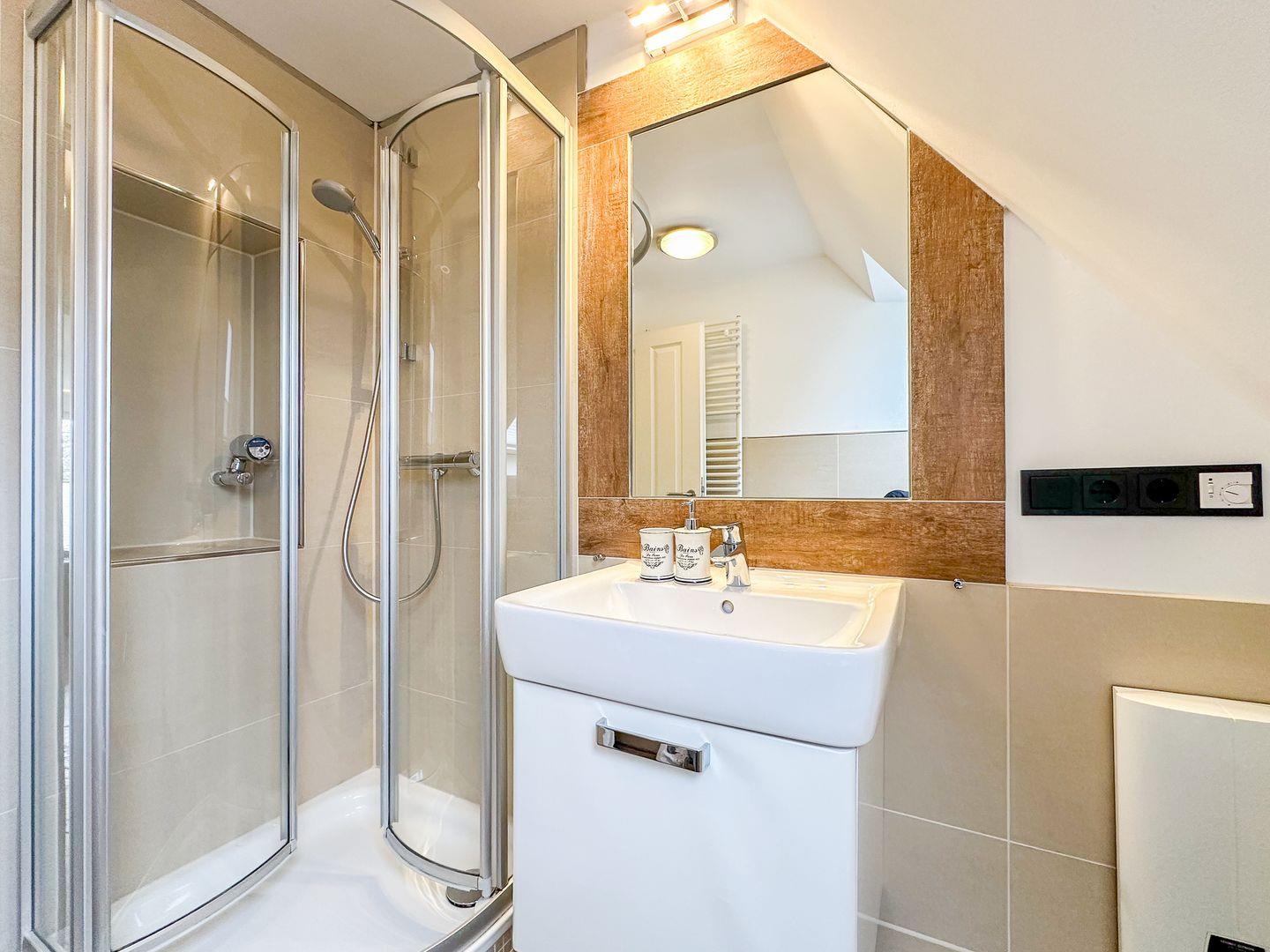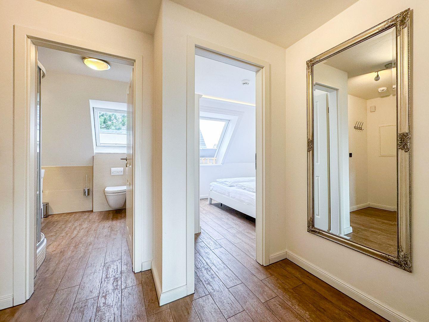 Das ganz in Weiß gehaltene Schlafzimmer hat neben dem bequemen Doppelbett noch einen "Fenster-Blick" in den Himmel zu bieten und in dem modernen Badezimmer lädt am Morgen die Dusche zum Start in den neuen Tag ein. Das perfekte Appartement also für gemütliche Stunden zu zweit.